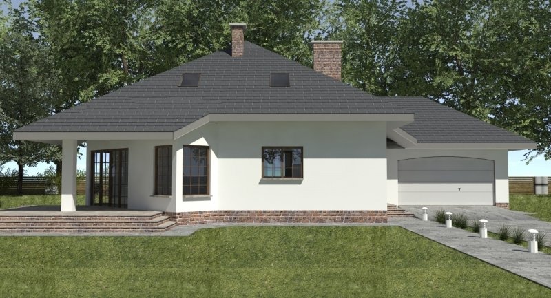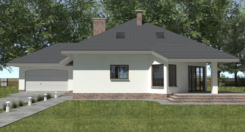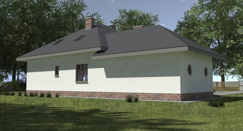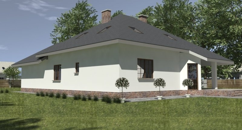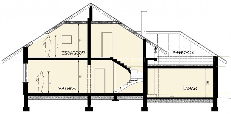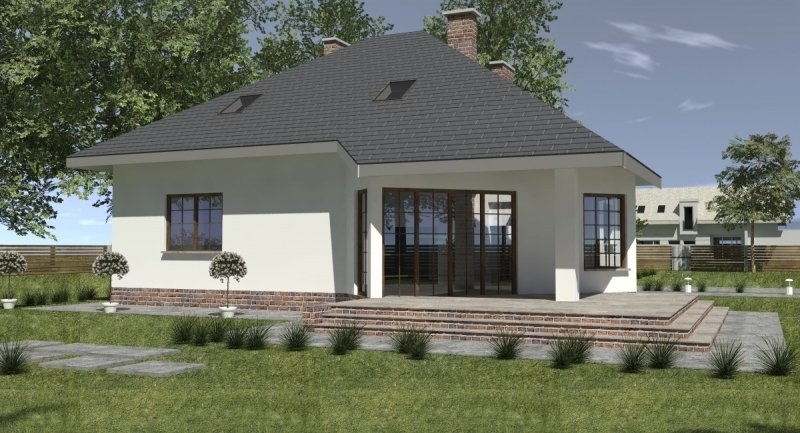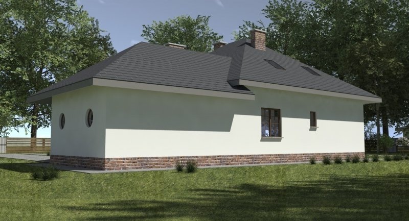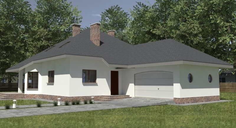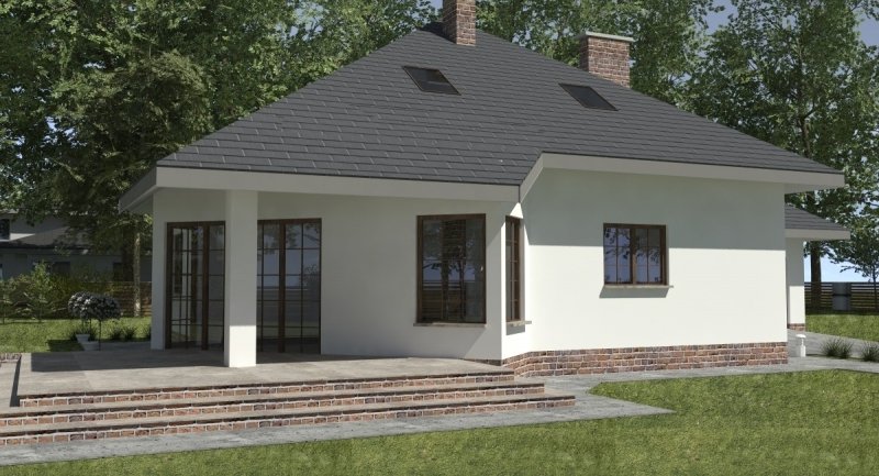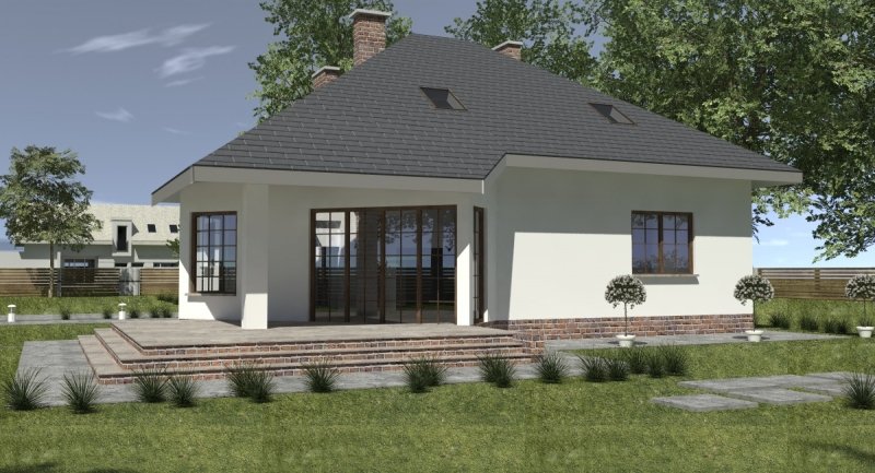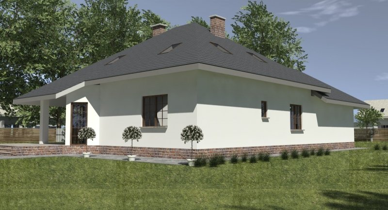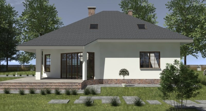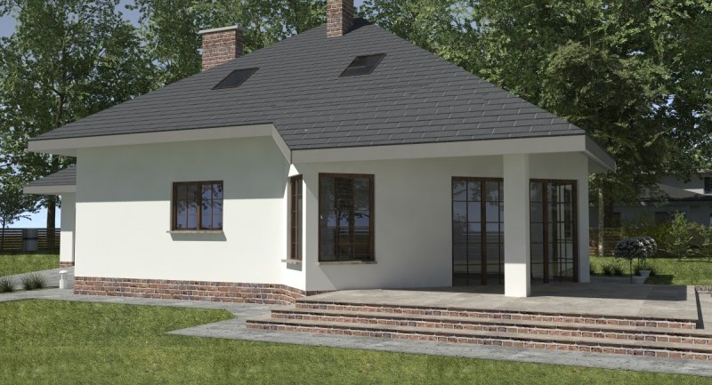 Dom z użytkowym poddaszem. architektura domu daje dużą mozliwość jak najlepszego dostosowania tego projektu do warunków miejscowych. Na parterze część dzienna z dużym, dobrze doświetlonym salonem i obszernym, częściowo zadaszonym tarasem, dodatkowo duża sypialnia 2 osobowa z osobnym dostępem do łazienki. Na poddaszu część nocna-sypialnie i pomieszczenia sanitarne/pomocnicze. Dom posiada garaż na 2 samochody osobowe. Nad garażem znajduje się mała przestrzeń, która może być wykorzystana jako schowek ( dostęp z garażu przez schody składane).