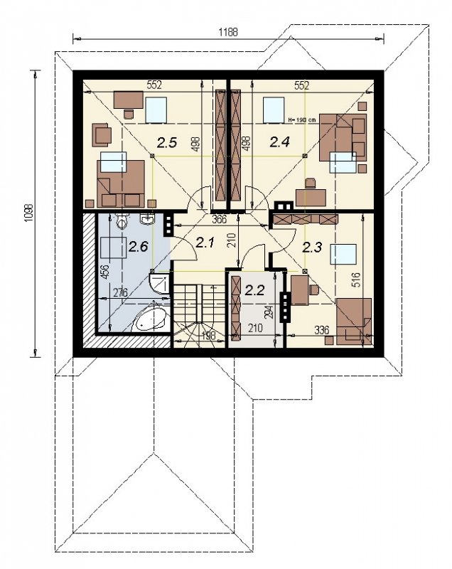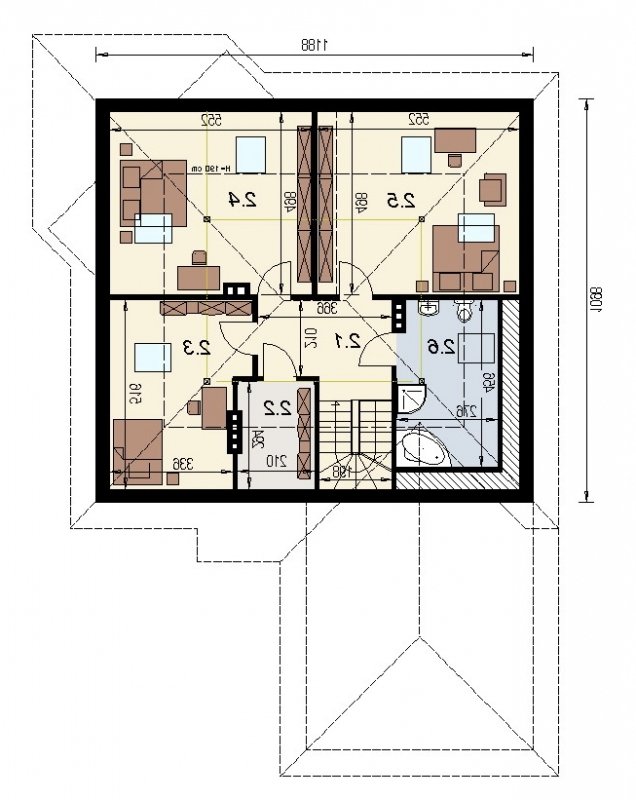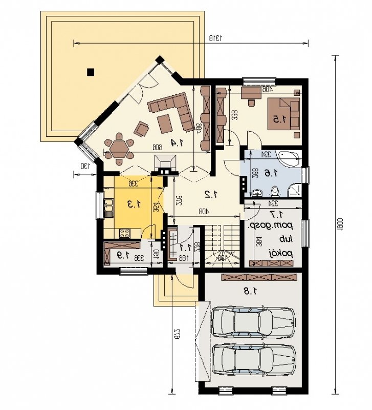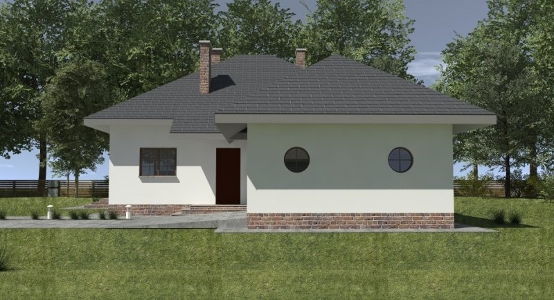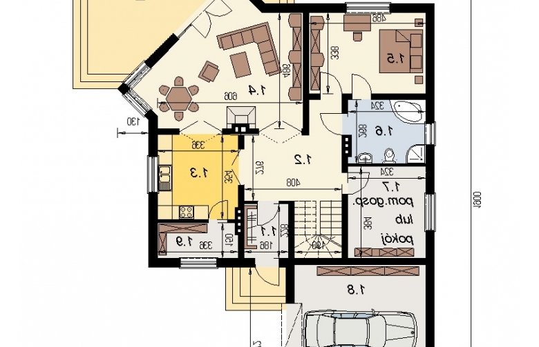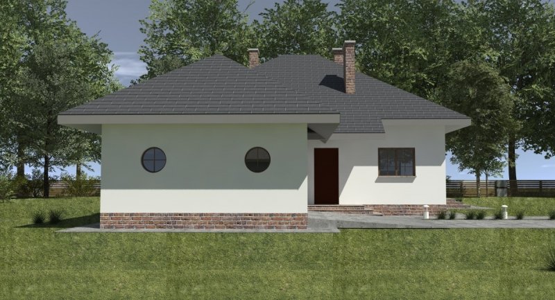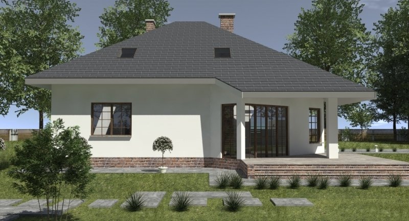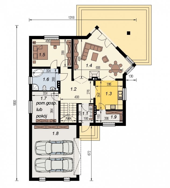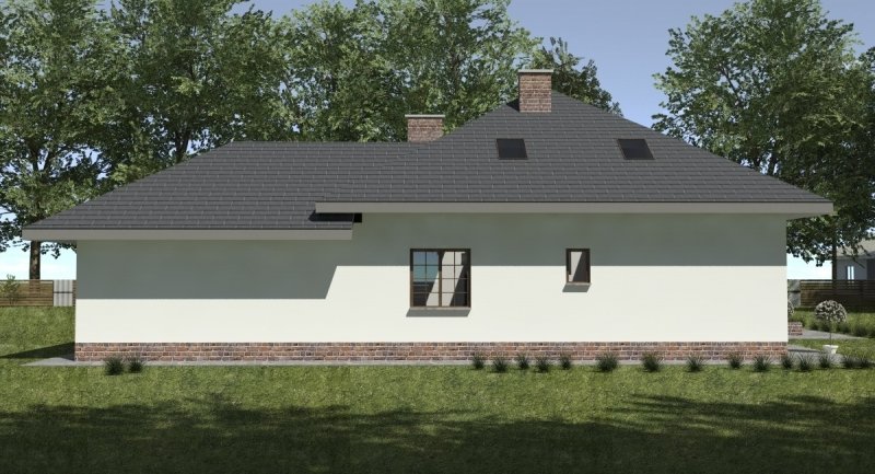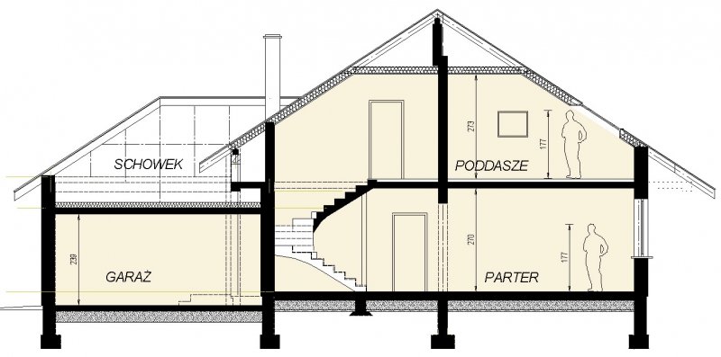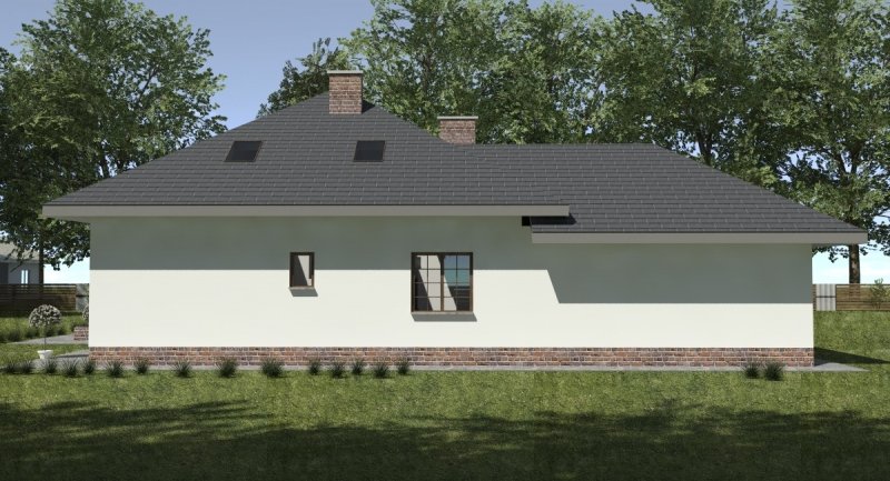 Dom z użytkowym poddaszem. architektura domu daje dużą mozliwość jak najlepszego dostosowania tego projektu do warunków miejscowych. Na parterze część dzienna z dużym, dobrze doświetlonym salonem i obszernym, częściowo zadaszonym tarasem, dodatkowo duża sypialnia 2 osobowa z osobnym dostępem do łazienki. Na poddaszu część nocna-sypialnie i pomieszczenia sanitarne/pomocnicze. Dom posiada garaż na 2 samochody osobowe. Nad garażem znajduje się mała przestrzeń, która może być wykorzystana jako schowek ( dostęp z garażu przez schody składane).