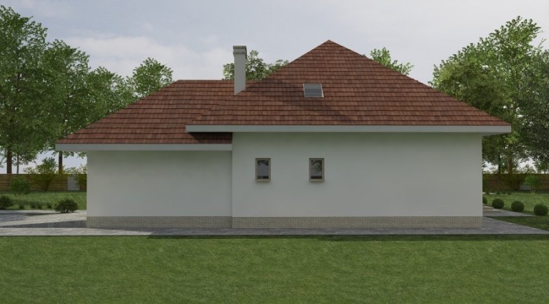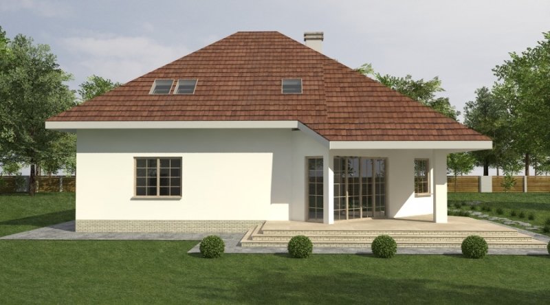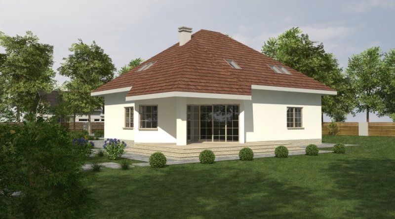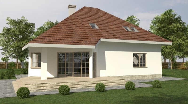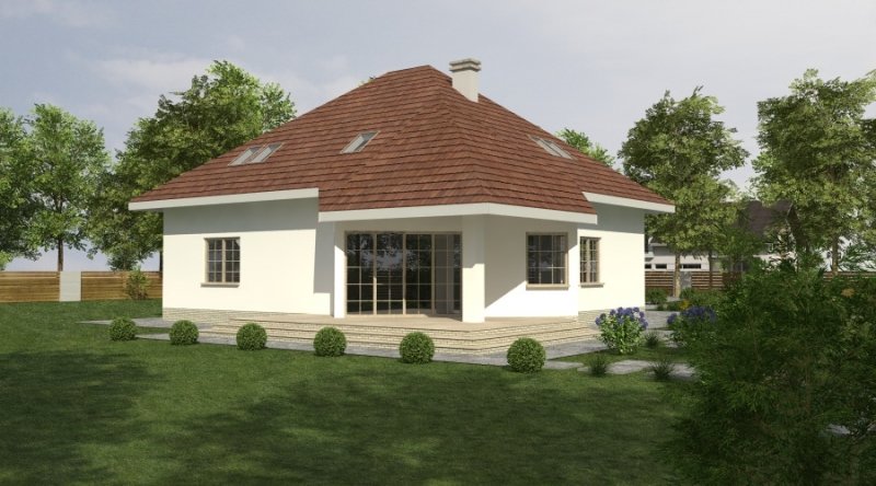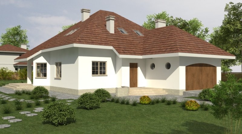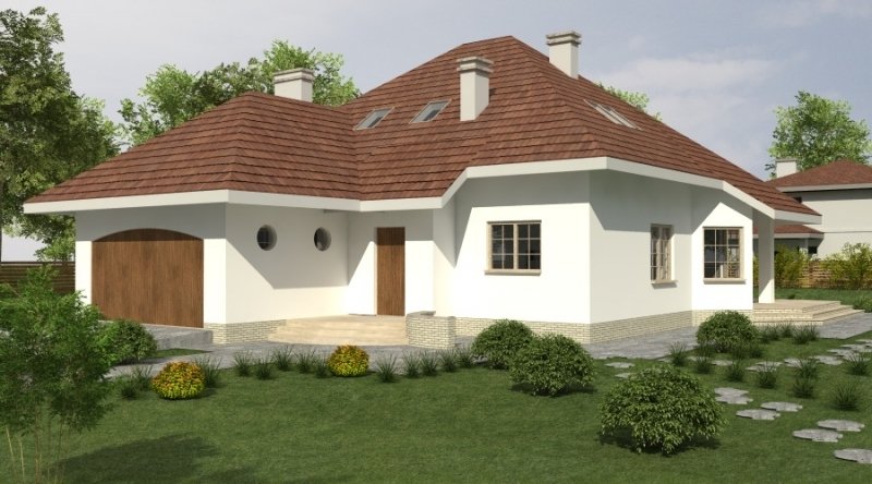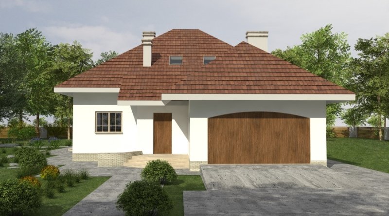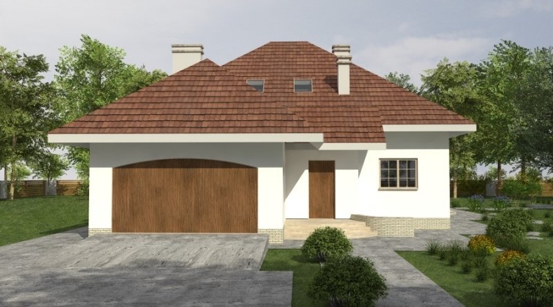 Dom jednorodzinny z poddaszem użytkowym z garażem na 2 samochody osobowe. Zaprojektowany dla 5-6 osobowej rodziny. na parterze znajduje się część dzienna z dużym, znakomicie doświetlonym salonem i obszernym, zadaszonym tarasem. Na parterze zaprojektowano sypialnie 2-osobową z własną łazienką doświetloną światłem naturalnym. Poddasze to częśc typowo nocna w skład której wchodzą sypialnie oraz pomieszczenia pomocnicze. dostępna jest wersja projektu z dachem o kącie nachylenia 33 stopni.