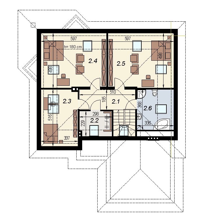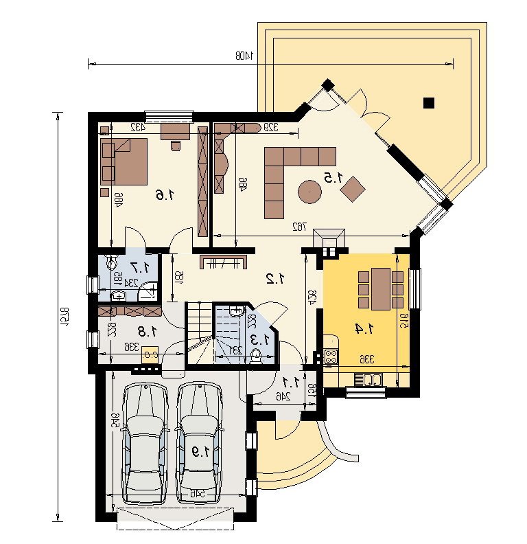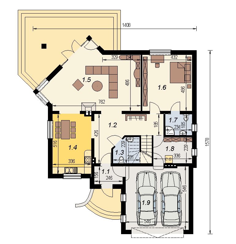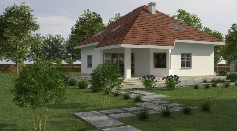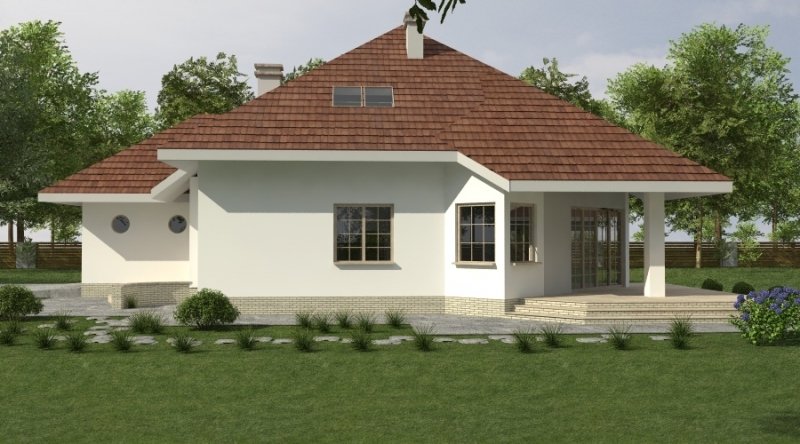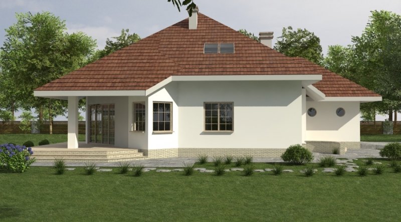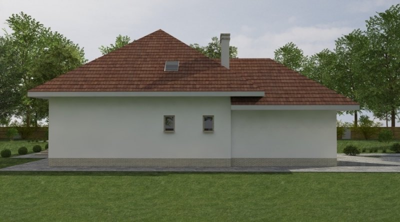 Dom jednorodzinny z poddaszem użytkowym z garażem na 2 samochody osobowe. Zaprojektowany dla 5-6 osobowej rodziny. na parterze znajduje się część dzienna z dużym, znakomicie doświetlonym salonem i obszernym, zadaszonym tarasem. Na parterze zaprojektowano sypialnie 2-osobową z własną łazienką doświetloną światłem naturalnym. Poddasze to częśc typowo nocna w skład której wchodzą sypialnie oraz pomieszczenia pomocnicze. dostępna jest wersja projektu z dachem o kącie nachylenia 33 stopni.