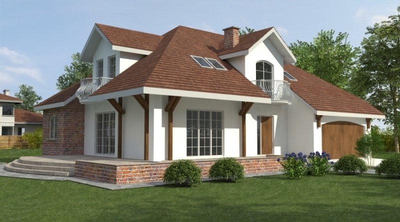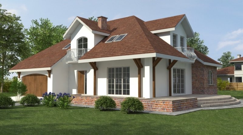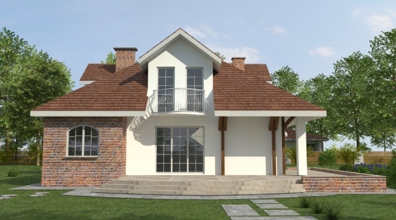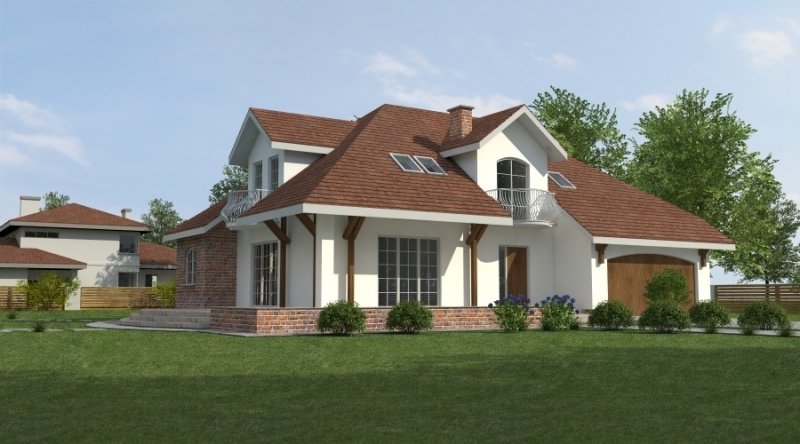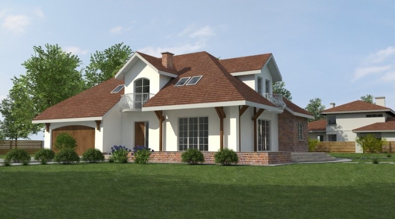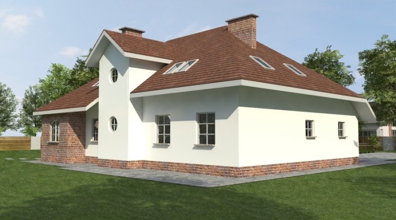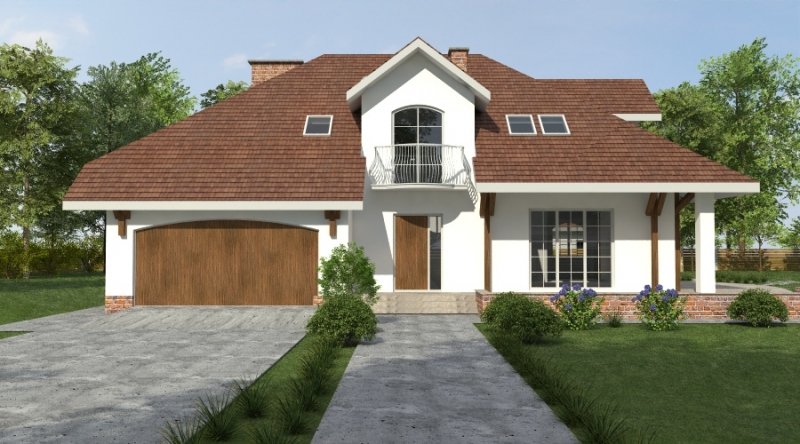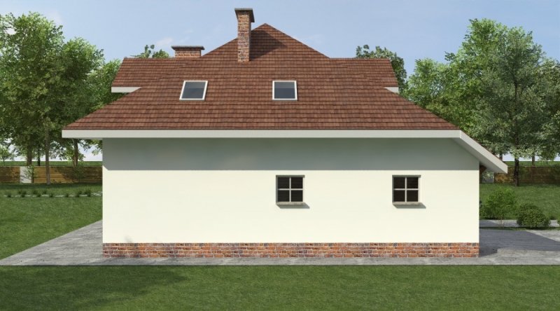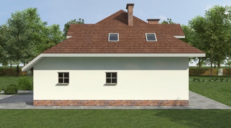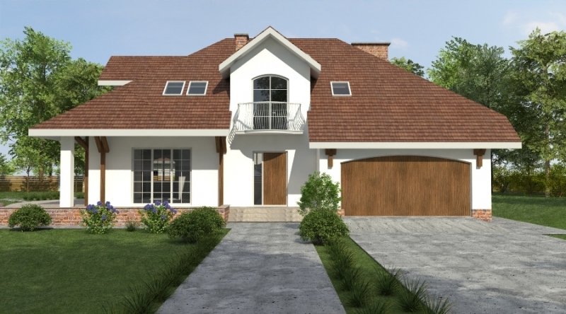 Dom z poddaszem użytkowym. Ten projekt należy do serii najbardziej popularnych projektów. Front domu może być sytuowany od strony południowej z uwagi na umiejscowienie salonu. Kuchnia z jadalnią znajdują się od strony ogrodu. Bryła budynku jest prosta w realizacji. Jak w większości projektów, strefa dzienna została zaprojektowana na parterze, strefa nocna w skład której wchodzą sypialnie i pomieszczenia sanitarne znajduje się na poddaszu. dom posiada garaż na 2 samochody osobowe.