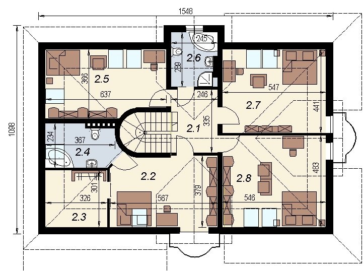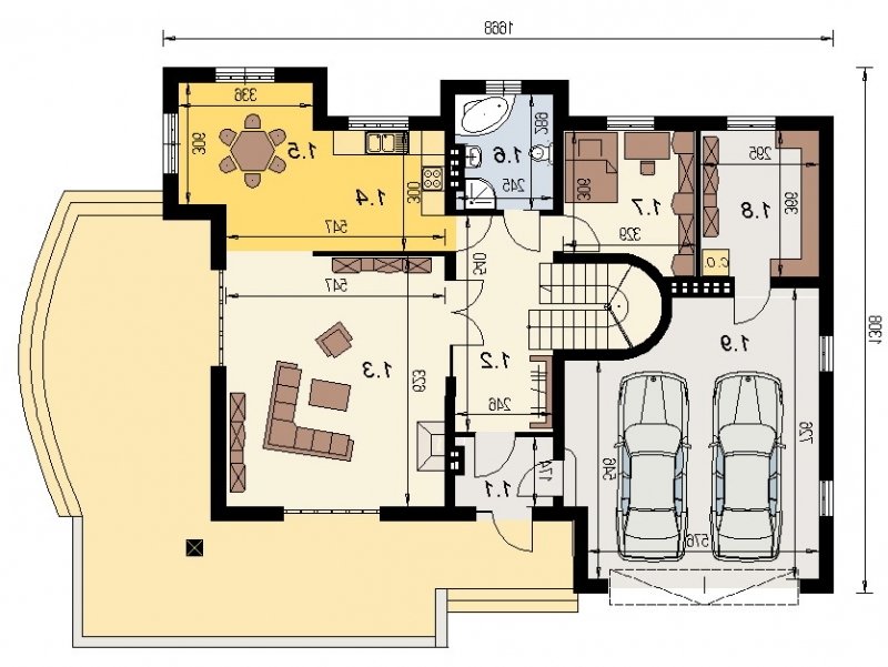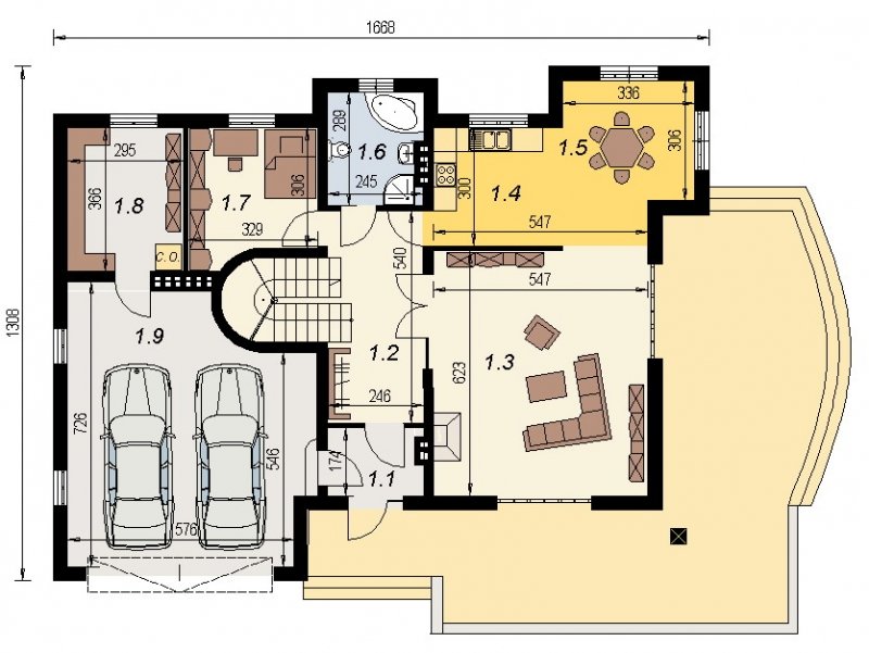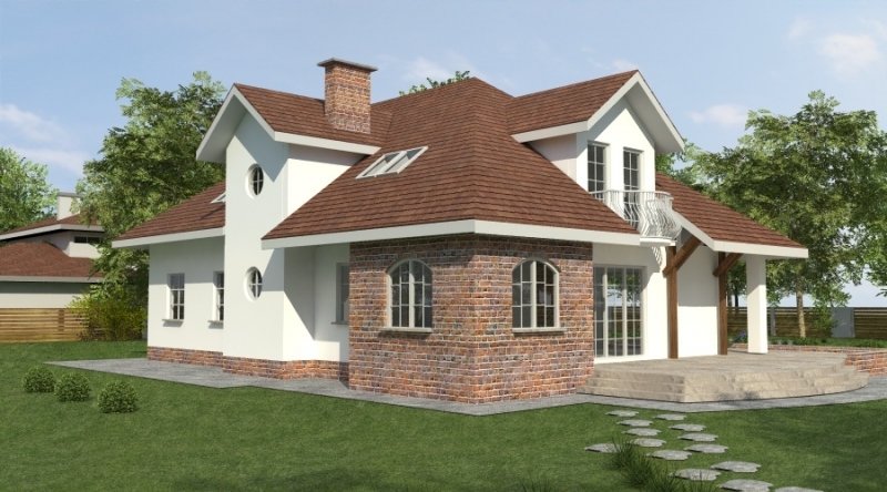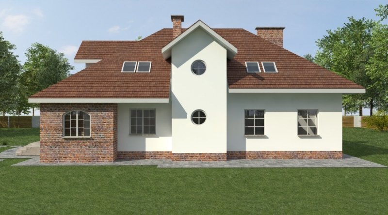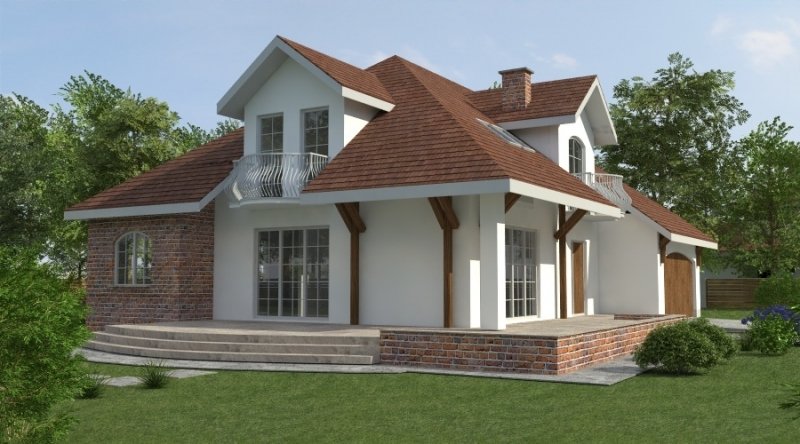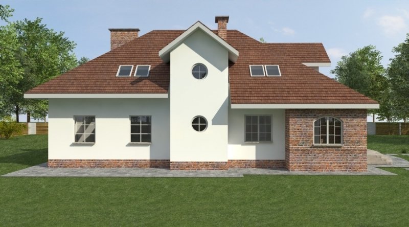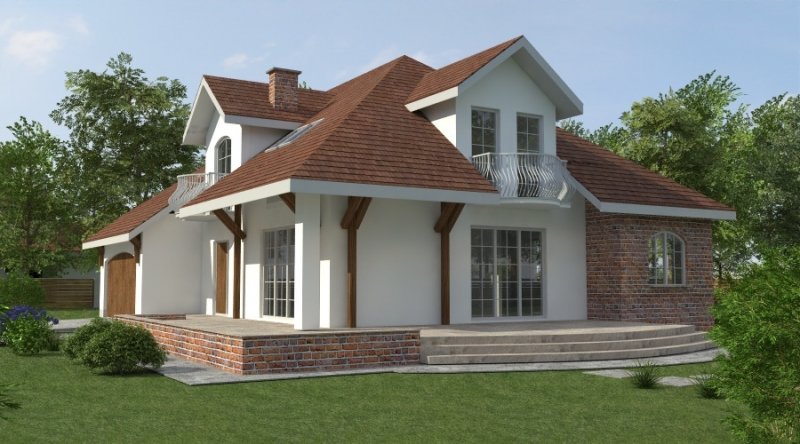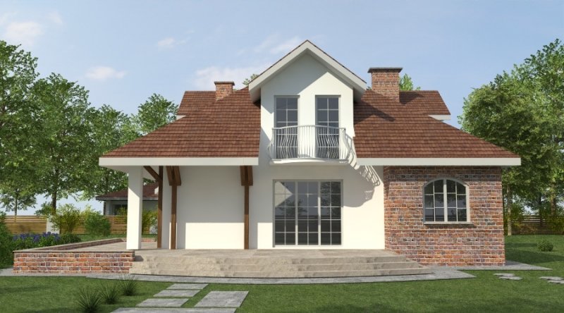 Dom z poddaszem użytkowym. Ten projekt należy do serii najbardziej popularnych projektów. Front domu może być sytuowany od strony południowej z uwagi na umiejscowienie salonu. Kuchnia z jadalnią znajdują się od strony ogrodu. Bryła budynku jest prosta w realizacji. Jak w większości projektów, strefa dzienna została zaprojektowana na parterze, strefa nocna w skład której wchodzą sypialnie i pomieszczenia sanitarne znajduje się na poddaszu. dom posiada garaż na 2 samochody osobowe.