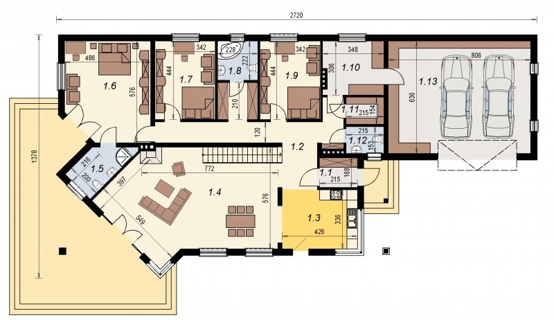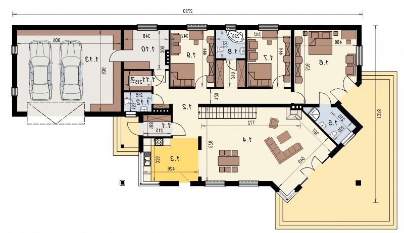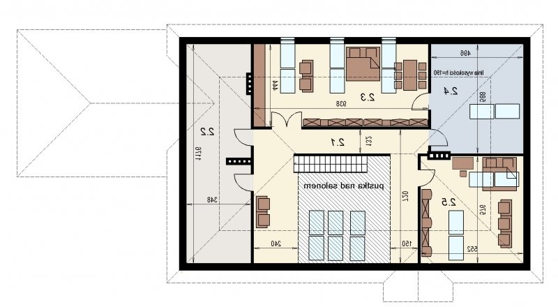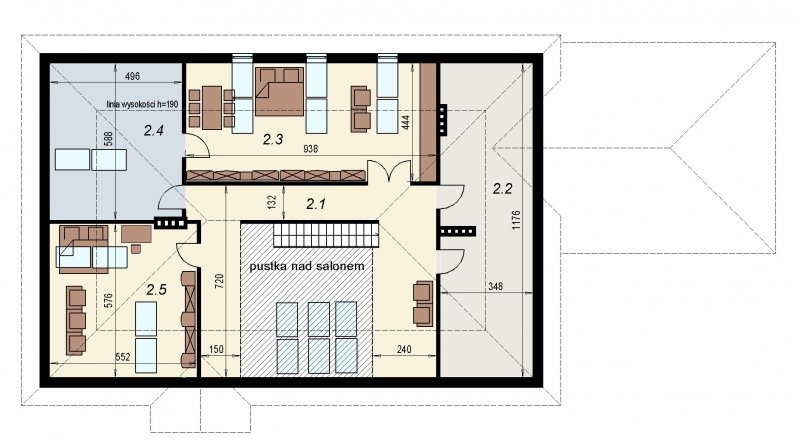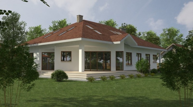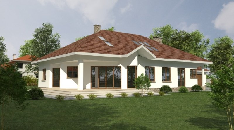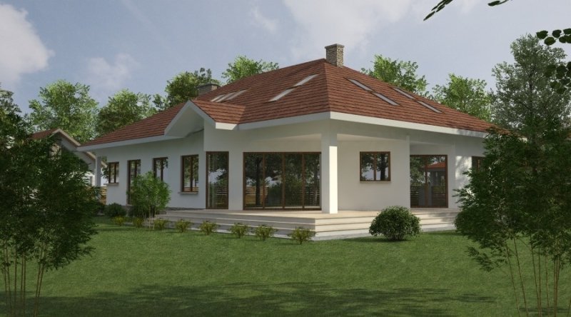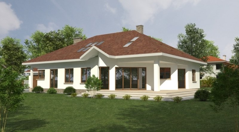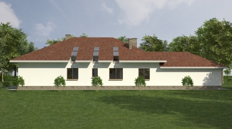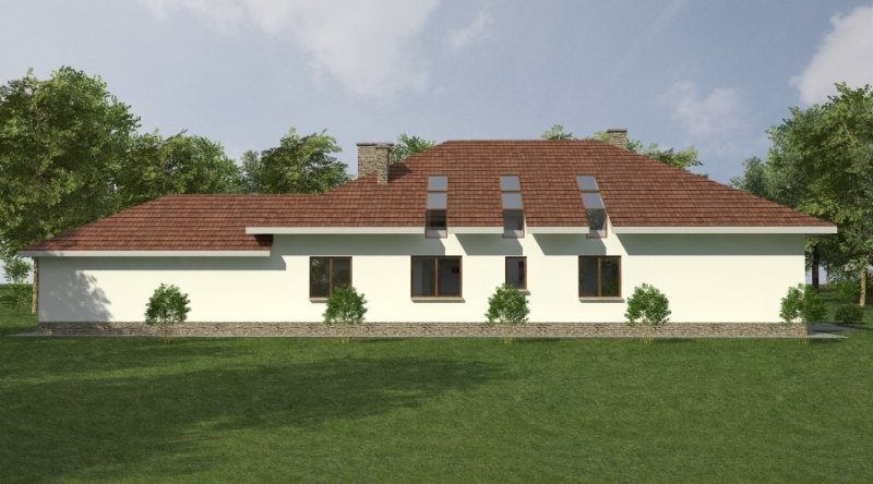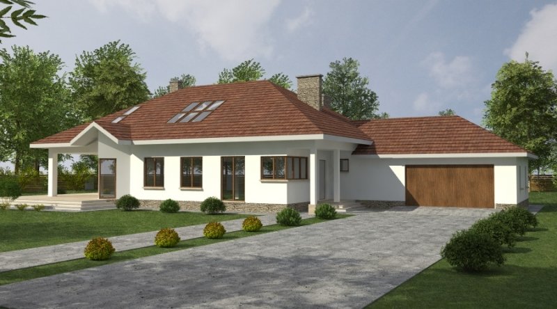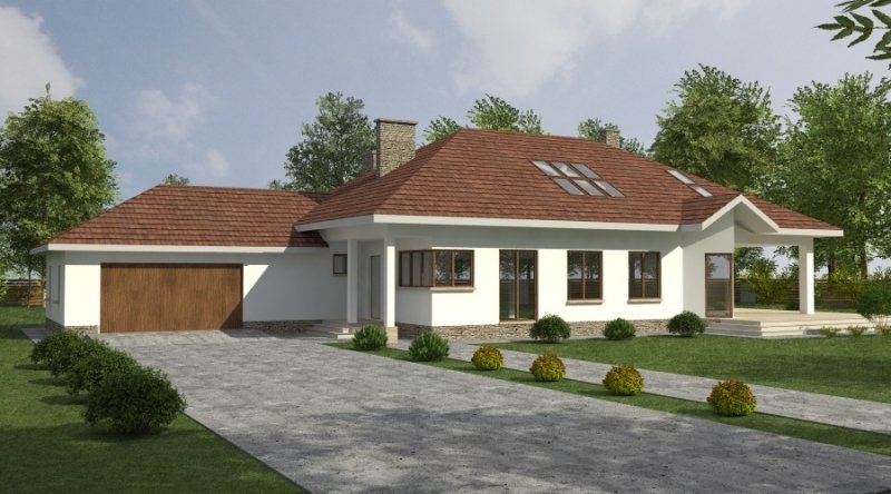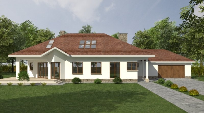 Obszerny dom parterowy z użytkowym poddaszem. Cechą charakterystyczną wnętrza stanowi pustka nad salonem. Projekty podobne : dj 18, dj 1.