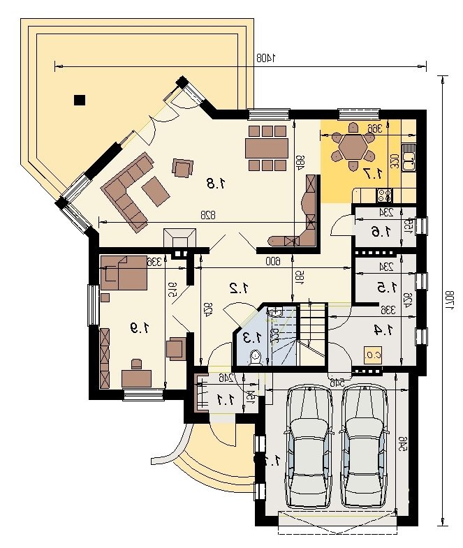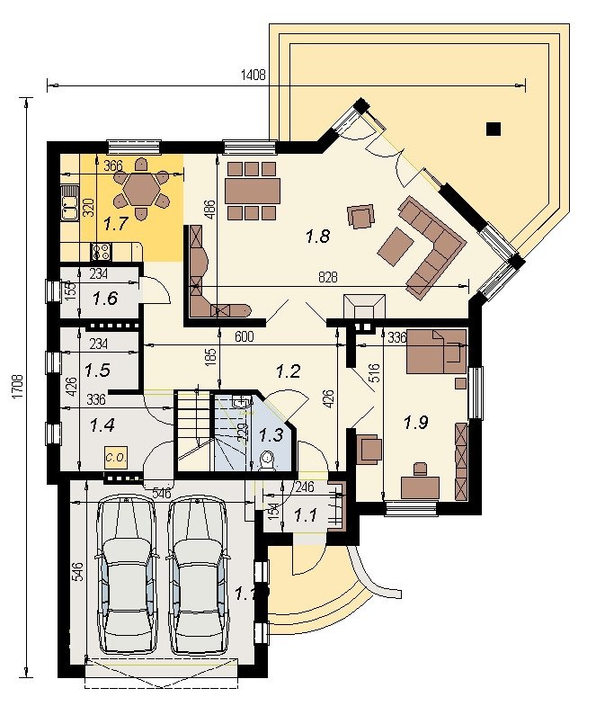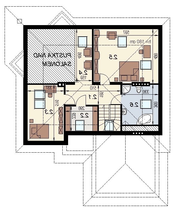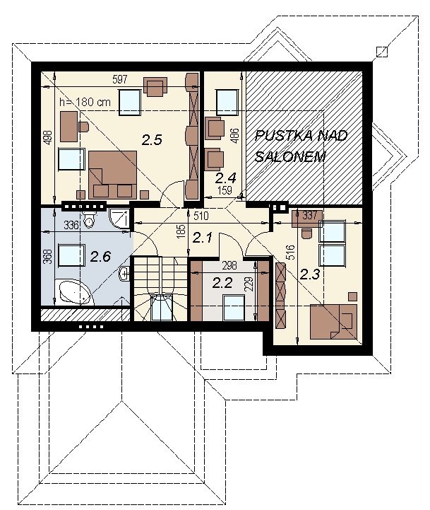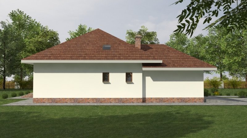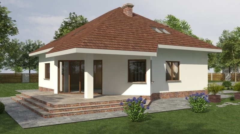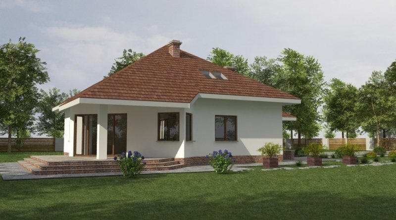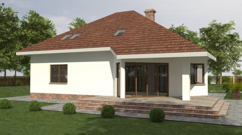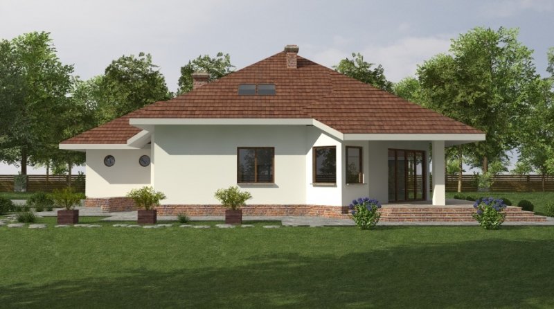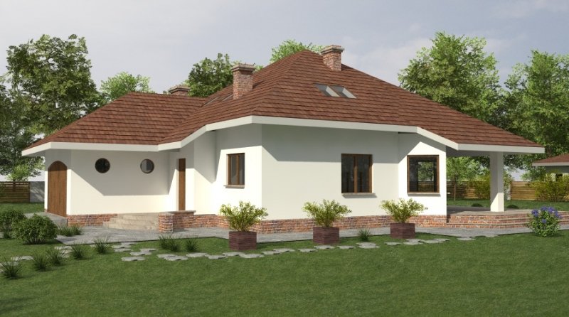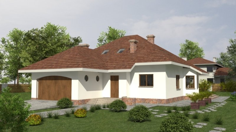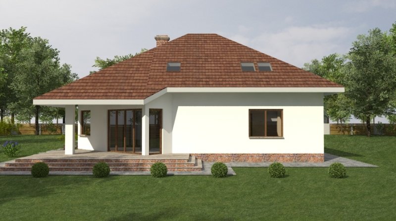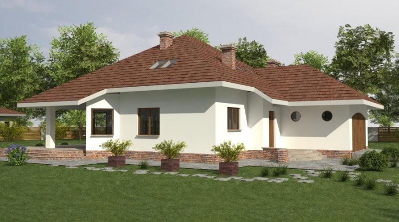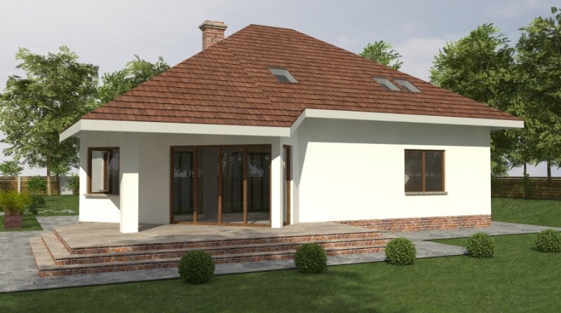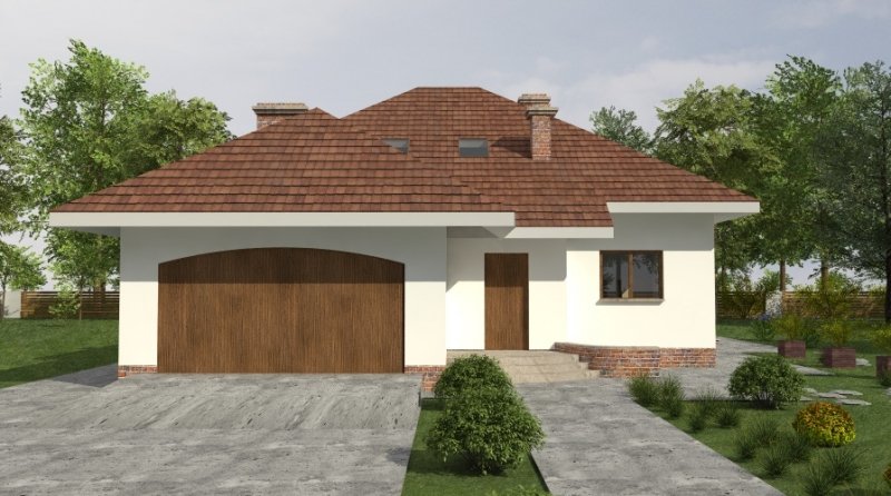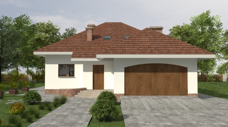 Dom jednorodzinny z poddaszem użytkowym przeznaczony dla 5-6 osobowej rodziny. Na parterze część dzienna z dużym, znakomicie doświetlonym salonem i obszernym tarasem, dodatkowo duża sypialnia z własną łazienką doświetloną światłem naturalnym. Na poddaszu znajduje się strefa nocna. Dostępna jest wersja projektu bez pustki nad salonem. Zamiast pustki nad salonem znajduje się dodatkowo duża sypialnia. Dom posiada garaż na 2 samochody osobowe. Nad garażem znajduje się schowek dostępny "z garażu".