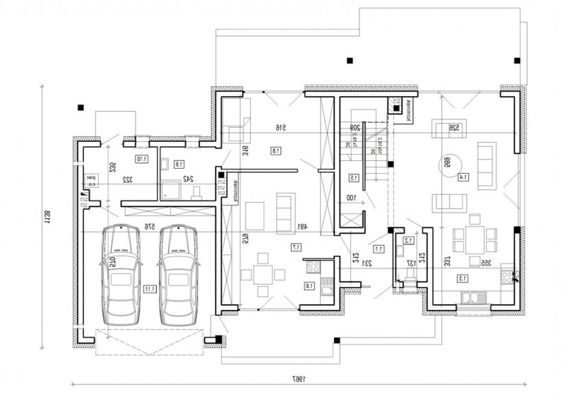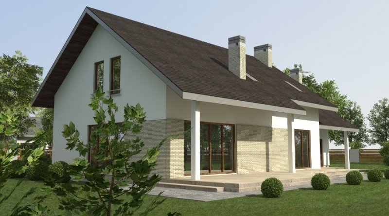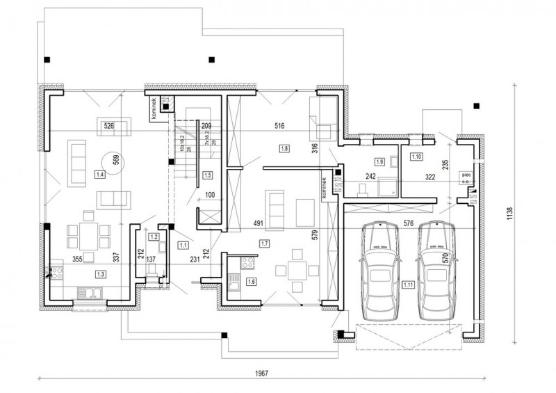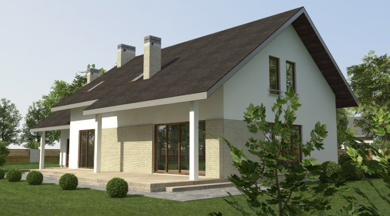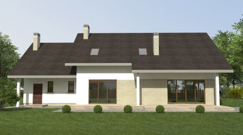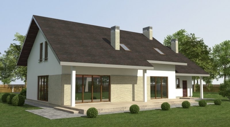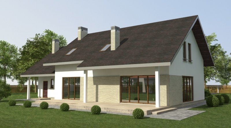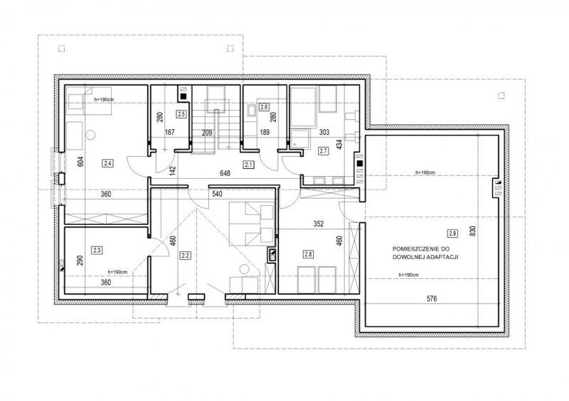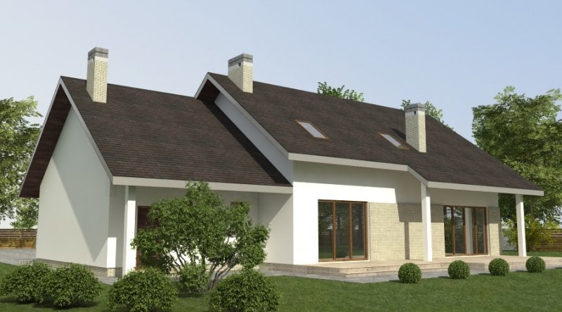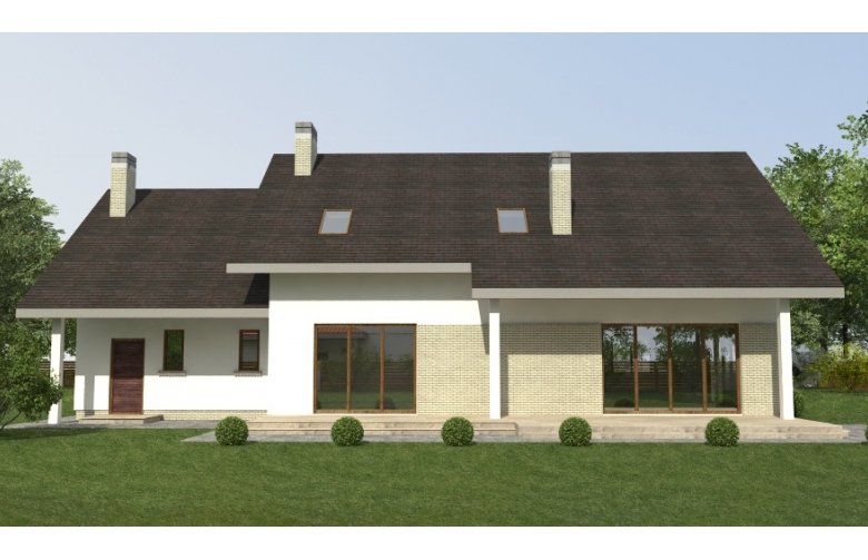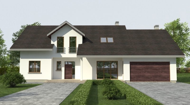 dom 2-pokoleniowy z poddaszem użytkowym. na parterze przewidziano dodatkowe mieszkanie (salon z aneksem kuchennym wraz z sypialnią ) dostępne ze wspólnego przedsionka. poddasze domu to część nocna z sypialniami oraz pomieszczeniami pomocniczymi. dom posiada garaż na 2 samochody osobowe.
