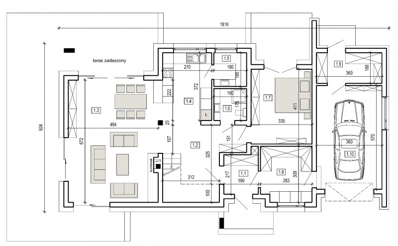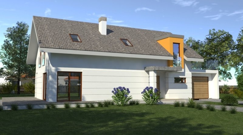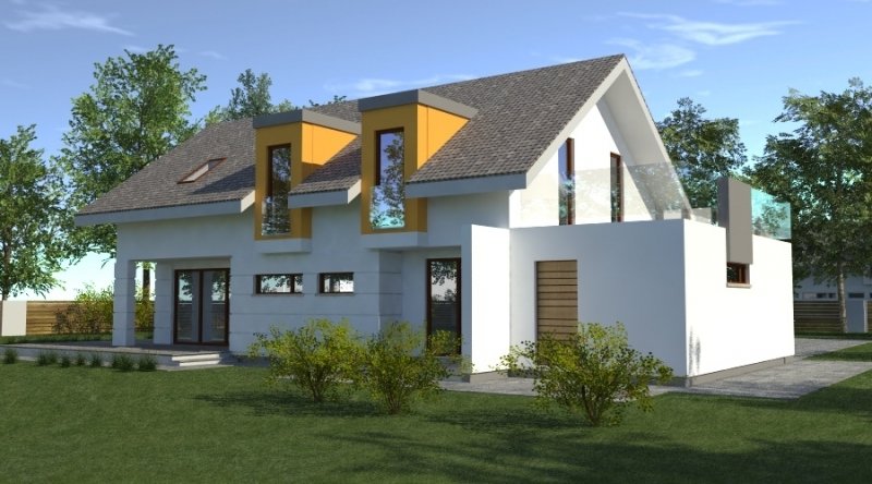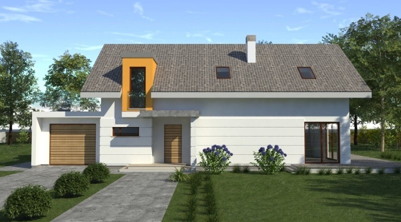 dom parterowy z poddaszem użytkowym. parter domu tworzy otwartą przestrzeń na którą składa się kuchnia z możliwością wykonania tzw."wyspy", salon oraz komunikacja.parter domu jest dobrze doświetlony. z salonu dostępne jest wyjście na zadaszony taras.kominek można wykonać jako nowoczesny z wkładem narożnym.poddasze to cześć nocna na którą składają się 4 sypialnie oraz pomieszczenia pomocnicze. dom posiada garaż na 1 samochód osobowy z możliwością jego powiększenia do 2 stanowisk.