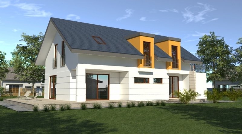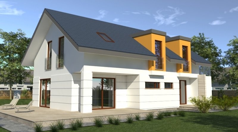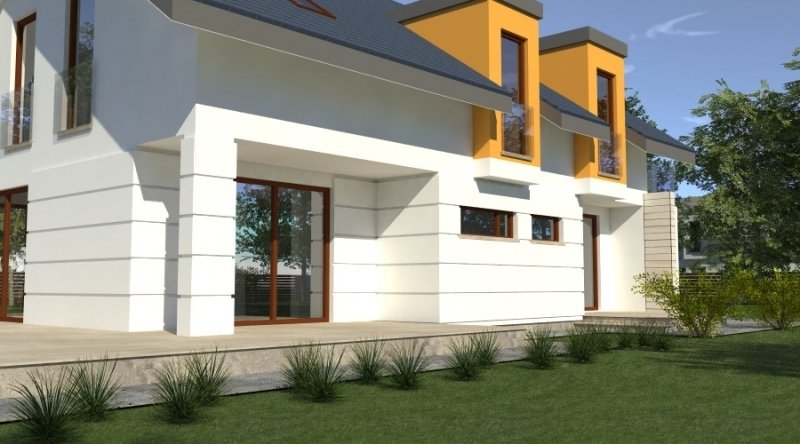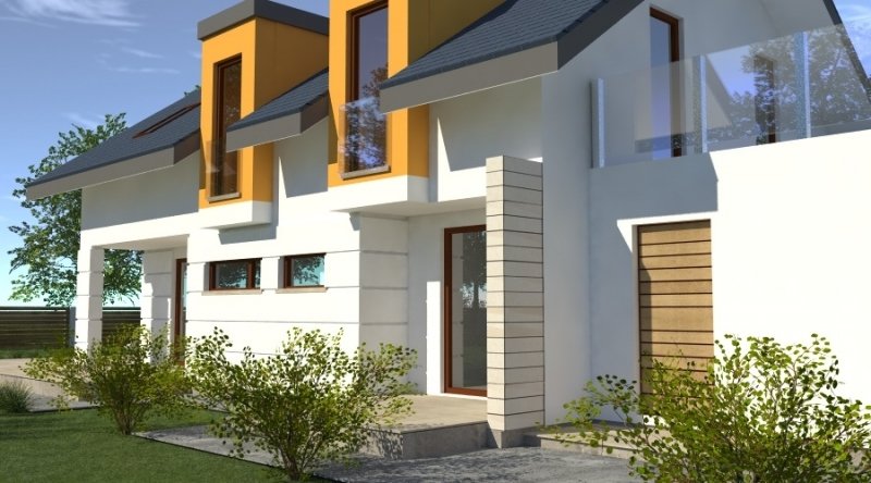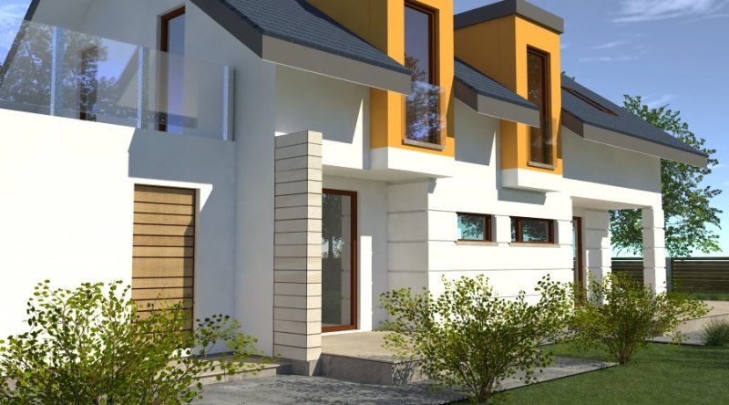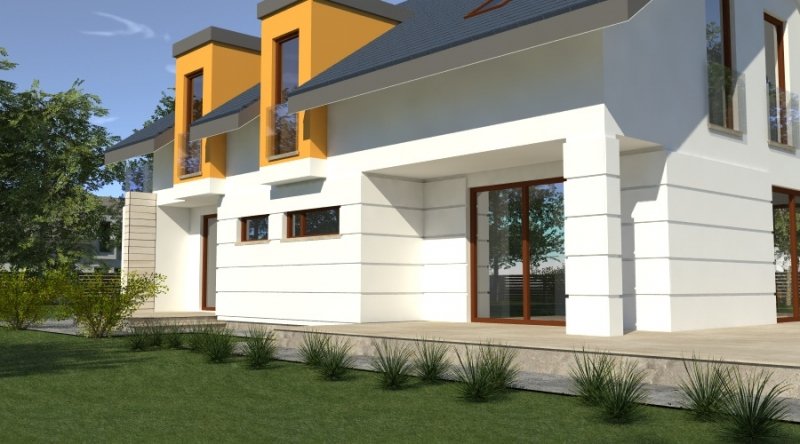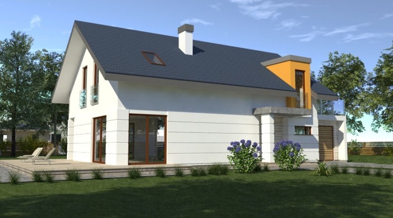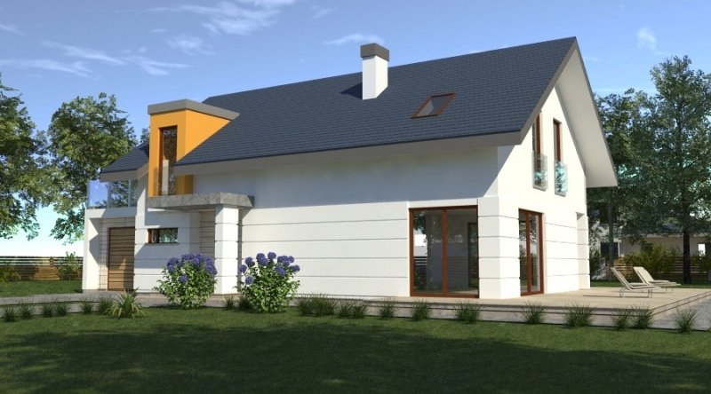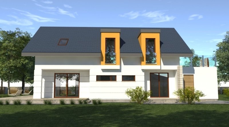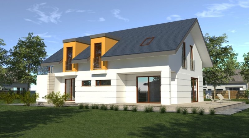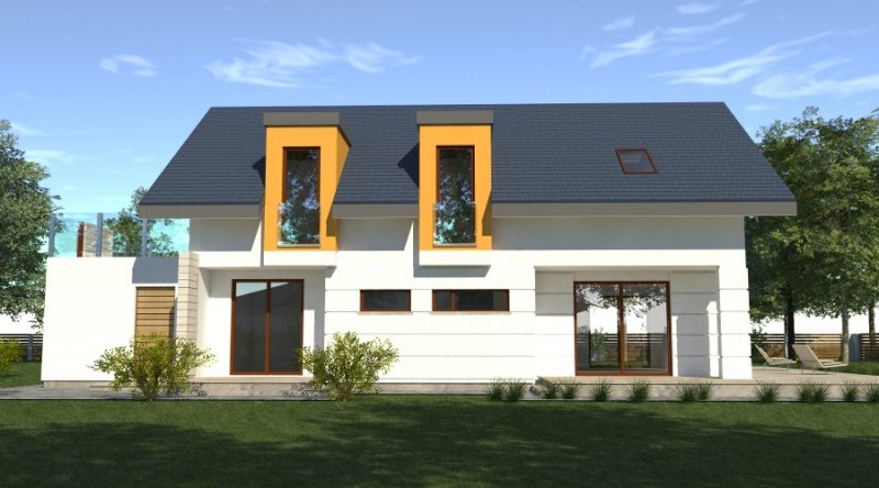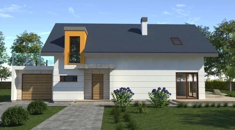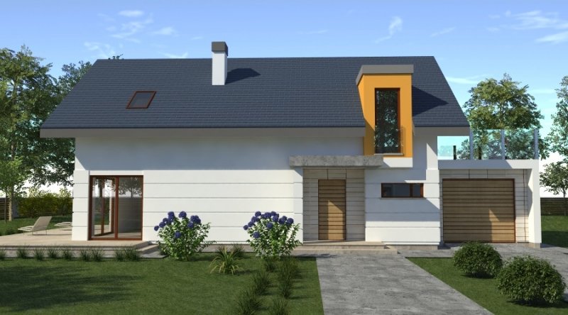 dom współczesny o tradycyjnej formie i z nowoczesnymi akcentami na elewacji. dostępna wersja z garażem 2-stanowiskowym. istnieje możliwość opracowania innej wersji tego projektu.