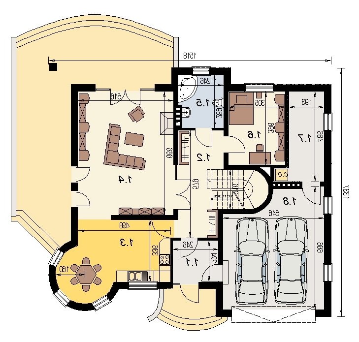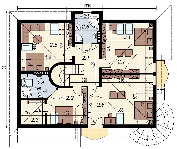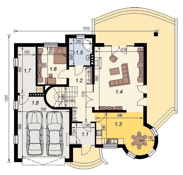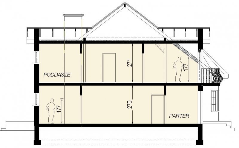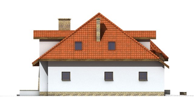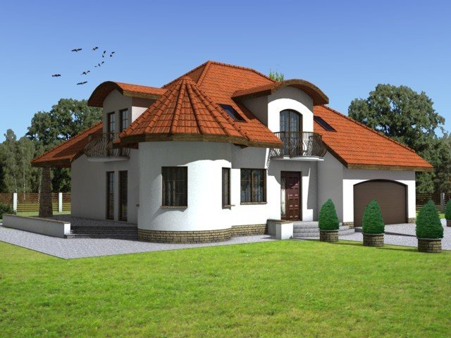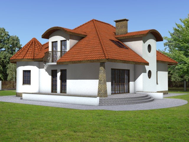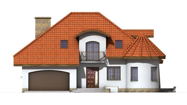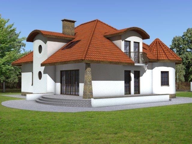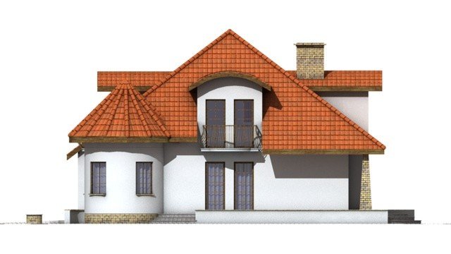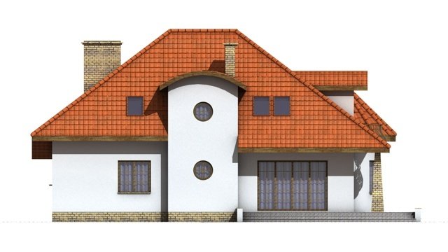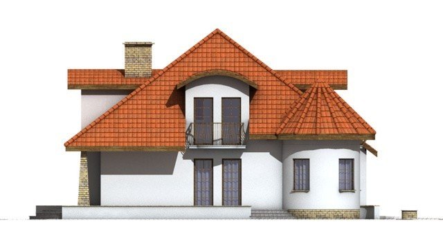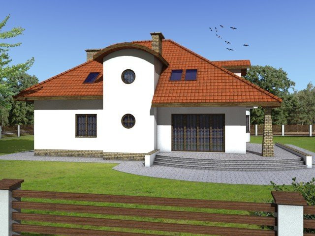 Elementami wyrózniającymi ten dom spośród innych o architekturze typowej jest okrągła wieżyczka w której znajduje się nastrojowa jadalnia dla 6 osób oraz lukarny z zaokrągloną połacią dachową. Łącznie elementy te tworzą ciekawy efekt. Dom został zaprojektowany dla 5-6 osobowej rodziny.Parter jest strefą typowo dzienną, na poddaszu zlokalizowano strefę nocną- sypialnie oraz pomieszczenia sanitarne. Dom posiada garaż na 2 samochody osobowe.