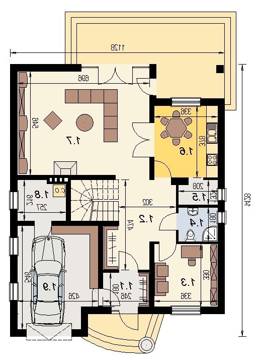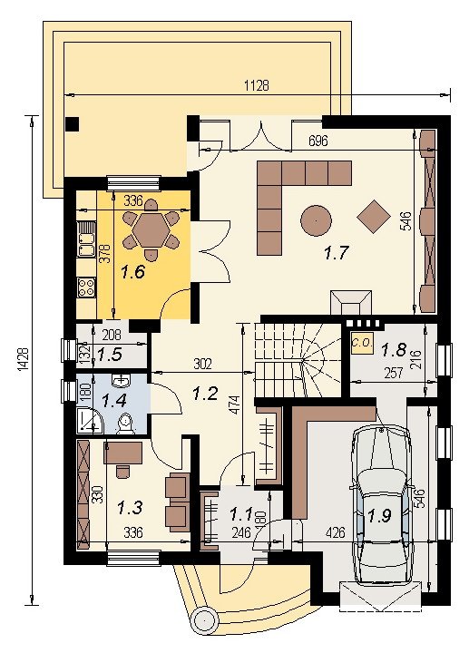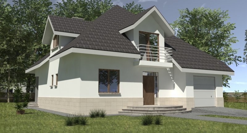 Cechą wyrózniająca ten projekt sposród innych projektów typowych o bardzo podobnej architekturze jest duży, ustawny salon o powierzchni 38 m2. Poddasze w tym projekcie posiada duże, przestrzenne sypialnie.Projekt powstał na bazie prostokąta zamiast kwadratu.Dzięki temu założeniu udało się opracować większe, kształtne pomieszczenia. Dom na wąską działkę , przeznaczony dla 5-6 osobowej rodziny. Na parterze zlokalizowano część dzienną z pomieszczeniem na biuro lub sypialnię, na poddaszu zlokalizowano część nocną z pomieszczeniami pomocnicznymi.Garaż zaprojektowano na 1 samochód ale istnieje możliwość powiększenia garażu do 2 stanowisk.