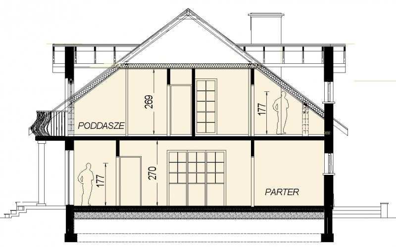 Dom został zaprojektowany dla 5-6 osobowej rodziny.Parter jest strefą typowo dzienną, na poddaszu zlokalizowano strefę nocną- sypialnie oraz pomieszczenia sanitarne. Dom posiada garaż na 2 samochody osobowe.