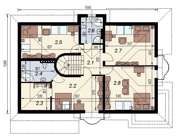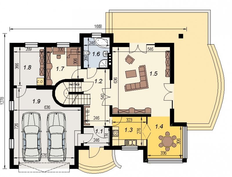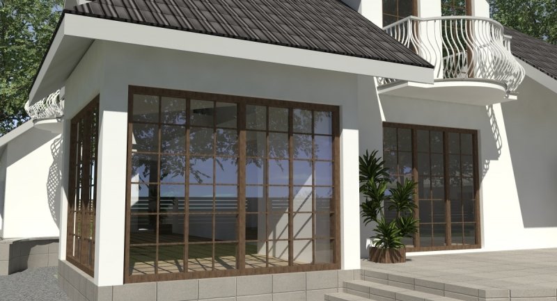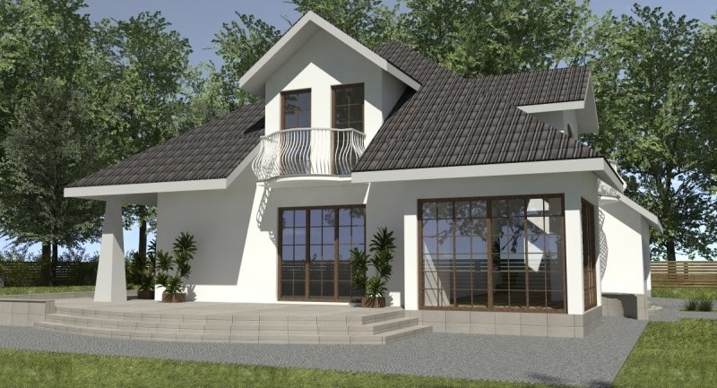 Elementami wyrózniającymi ten dom spośród innych o architekturze typowej jest jadalnia dla 6 osób która została wysunięta i wyeksponowana na elewacji frontowej i bocznej. Jadalnia została doświetlona dużymi oknami z podziałkami o wysokości 230 cm. Ciekawy efekt wizualny powstał równiez poprzez wydłużenie połaci dachu podpartej słupem od strony elewacji tylniej. Dzięki temu taras domu jest częściowo zadaszony. Dom został zaprojektowany dla 5-6 osobowej rodziny. Parter jest strefą typowo dzienną, na poddaszu zlokalizowano strefę nocną: sypialnie oraz pomieszczenia sanitarne. Dom posiada garaż na 2 samochody osobowe. Dostępna jest wersja z podpiwniczeniem jak również bez podpiwniczenia.