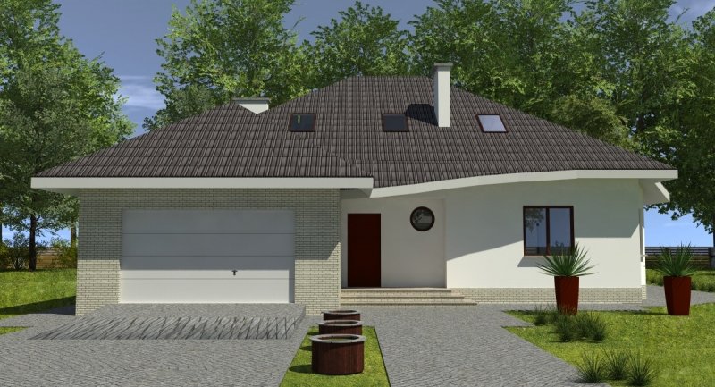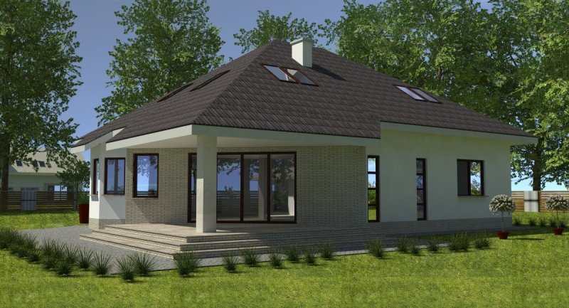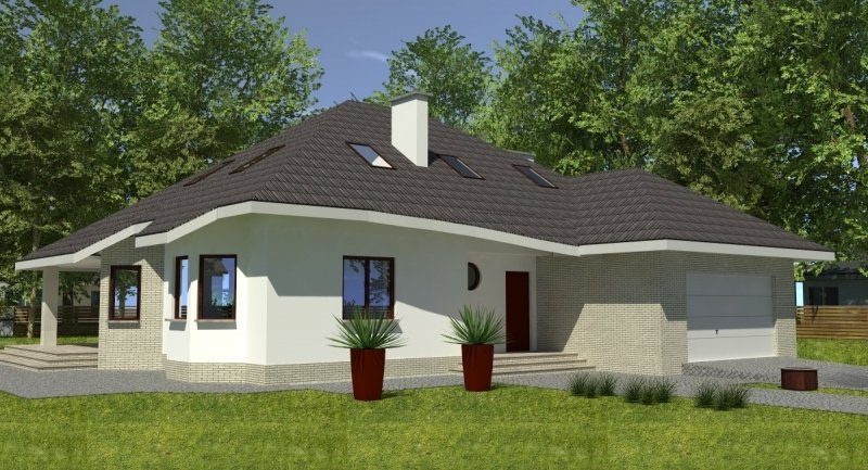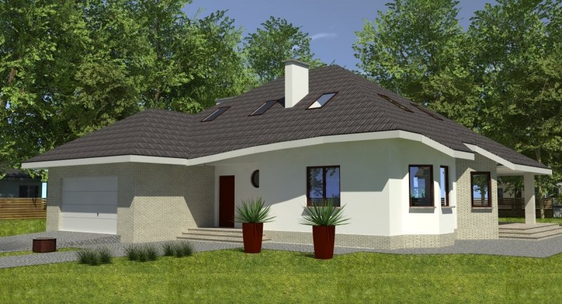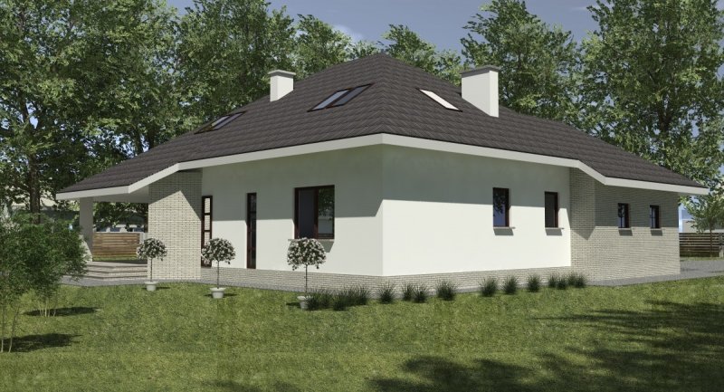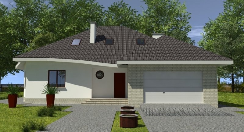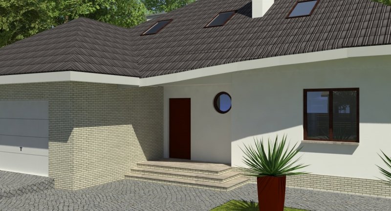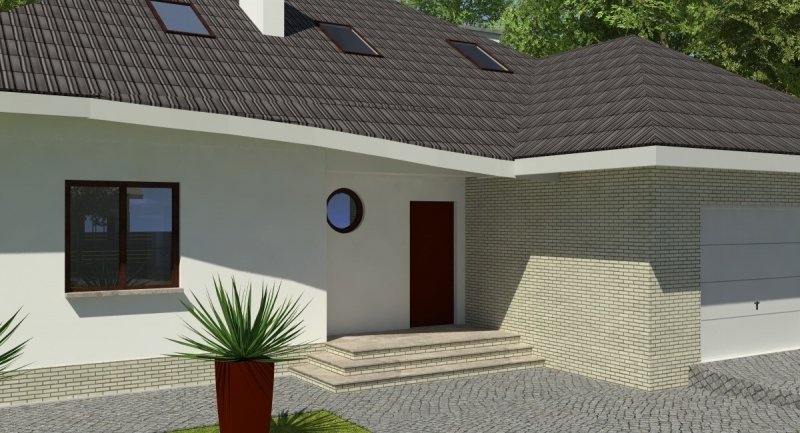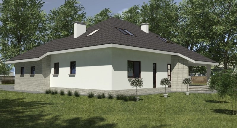 Projekt popularny wśród inwestorów z uwagi na bogaty program funkcjonalny wnętrza i mało skomplikowaną bryłę budynku, co wiąże się bezpośrednio z niewielkimi kosztami realizacji odnosząc się do m2 powierzchni użytkowej. Cechą wyróżniającą ten dom spośród innych jest ścięty narożnik części domu od strony pokoju dziennego, który powoduje że dom pasuje do nietypowych działek. Z salonu na taras prowadzą szerokie, czteroskrzydłowe drzwi balkonowe. Sam taras jest zadaszony przez wysuniętą konstrukcję dachu podpartą solidnym słupem. Na parterze wydzielono z dostępem od pokoju dziennego pomieszczenie przeznaczone do oglądania TV/kino domowe. Na parterze zlokalizowano także sypialnie z własną łazienka i garderobą która może służyć jako pokój gościnny. Na poddaszu znajdują się duże sypialnie z własnymi garderobami. Schody wewnętrzne zaprojektowano jako trzybiegowe ze spocznikami i stanowią nieodzowny element wnętrza w dość dużej jak przystało na dom tej klasy klatce schodowej. Dom posiada wygodny garaż na dwa samochody osobowe. Projekt jest dostępny z podpiwniczeniem lub bez podpiwniczenia.