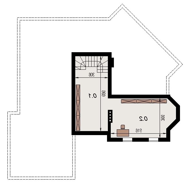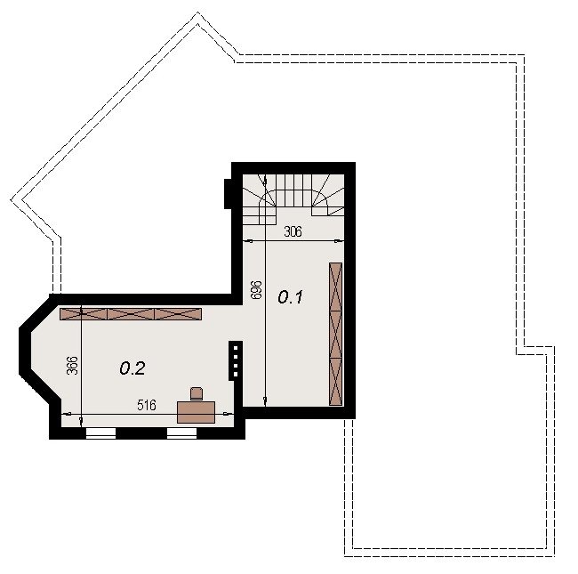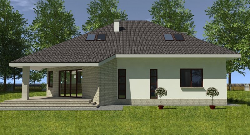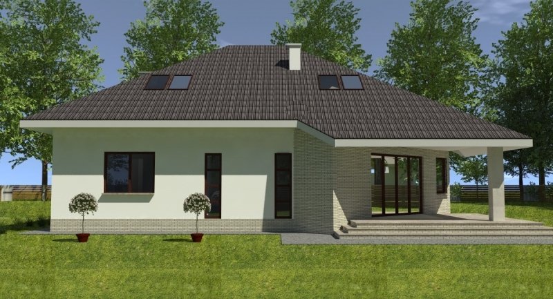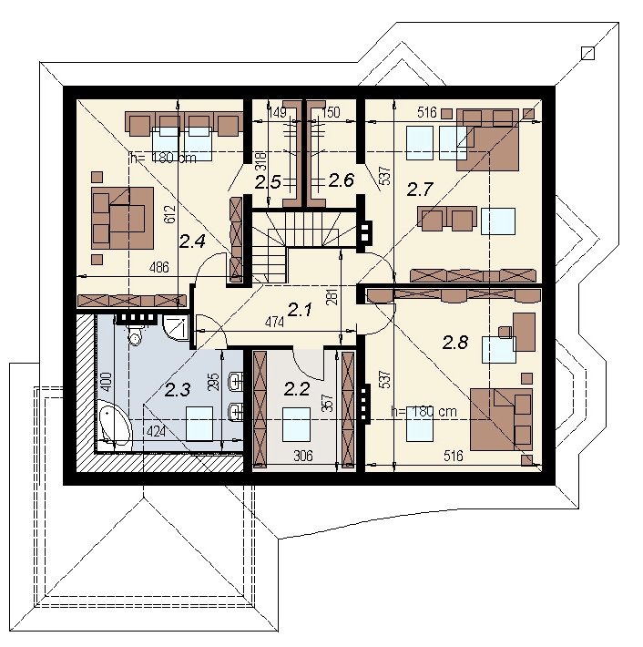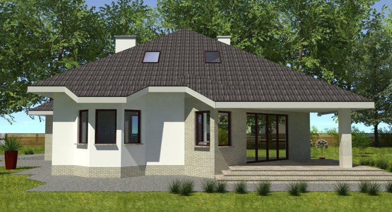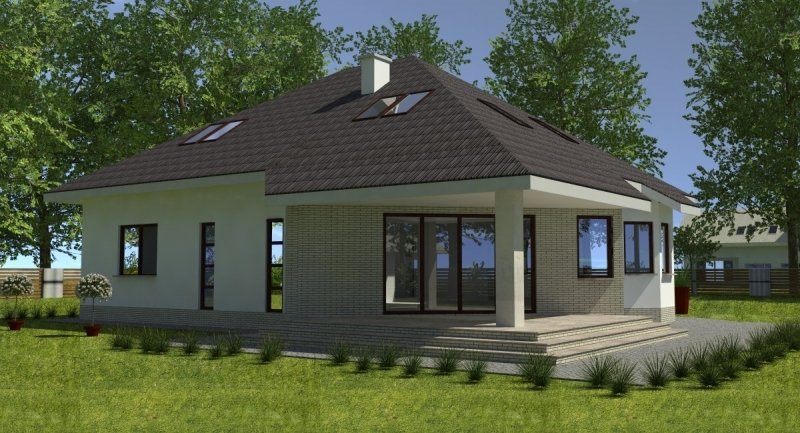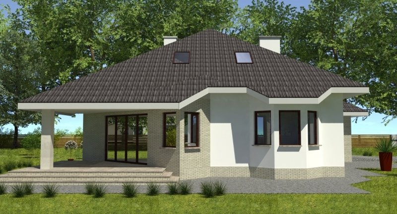 Projekt popularny wśród inwestorów z uwagi na bogaty program funkcjonalny wnętrza i mało skomplikowaną bryłę budynku, co wiąże się bezpośrednio z niewielkimi kosztami realizacji odnosząc się do m2 powierzchni użytkowej. Cechą wyróżniającą ten dom spośród innych jest ścięty narożnik części domu od strony pokoju dziennego, który powoduje że dom pasuje do nietypowych działek. Z salonu na taras prowadzą szerokie, czteroskrzydłowe drzwi balkonowe. Sam taras jest zadaszony przez wysuniętą konstrukcję dachu podpartą solidnym słupem. Na parterze wydzielono z dostępem od pokoju dziennego pomieszczenie przeznaczone do oglądania TV/kino domowe. Na parterze zlokalizowano także sypialnie z własną łazienka i garderobą która może służyć jako pokój gościnny. Na poddaszu znajdują się duże sypialnie z własnymi garderobami. Schody wewnętrzne zaprojektowano jako trzybiegowe ze spocznikami i stanowią nieodzowny element wnętrza w dość dużej jak przystało na dom tej klasy klatce schodowej. Dom posiada wygodny garaż na dwa samochody osobowe. Projekt jest dostępny z podpiwniczeniem lub bez podpiwniczenia.