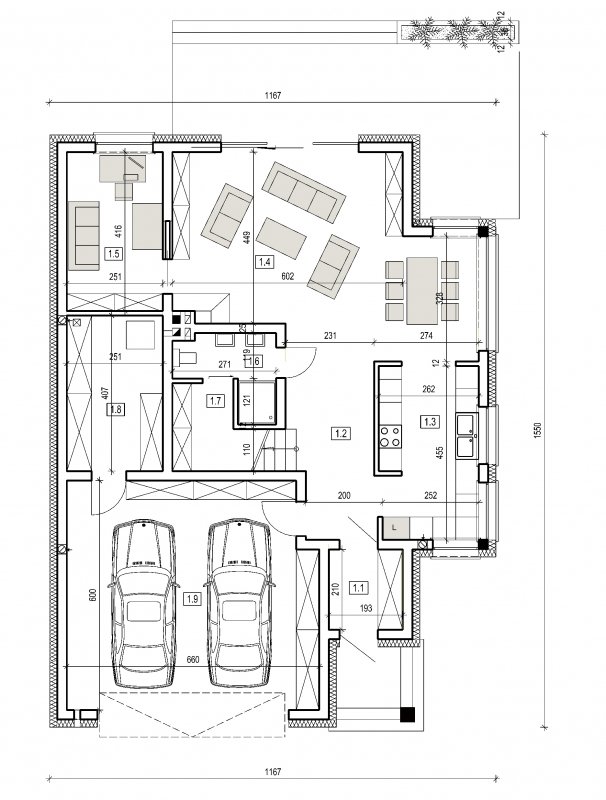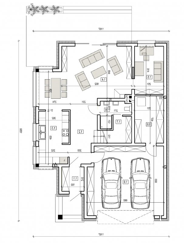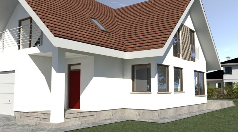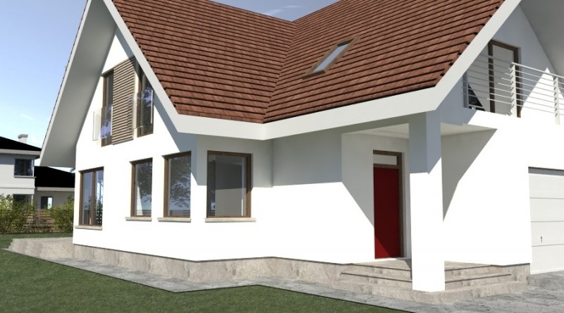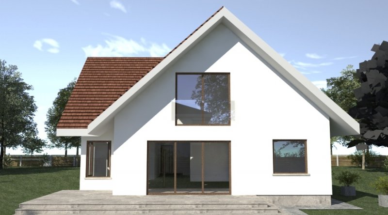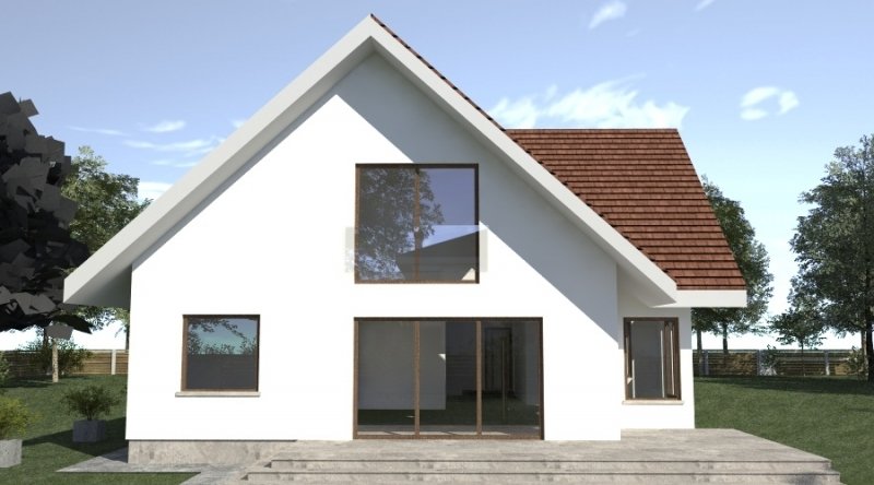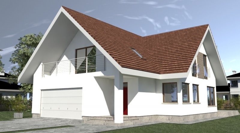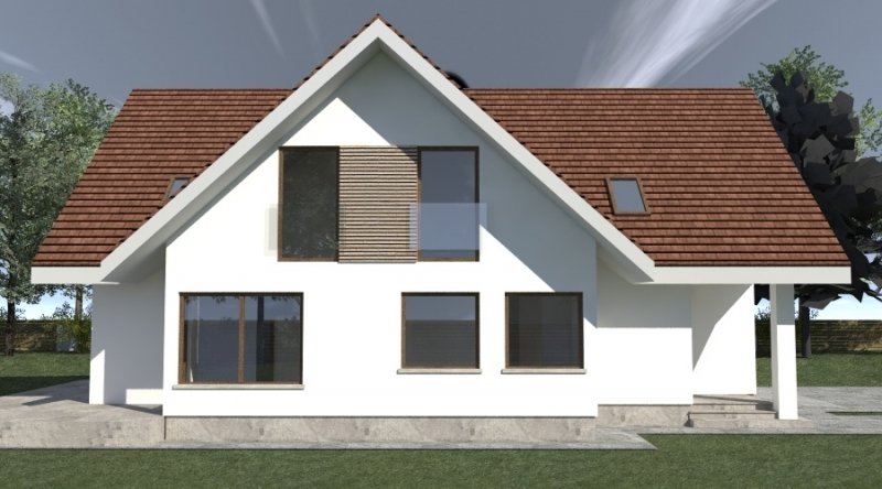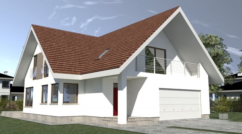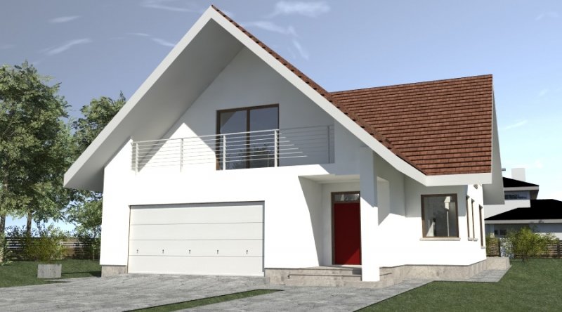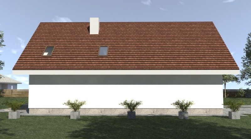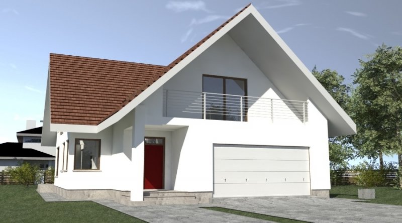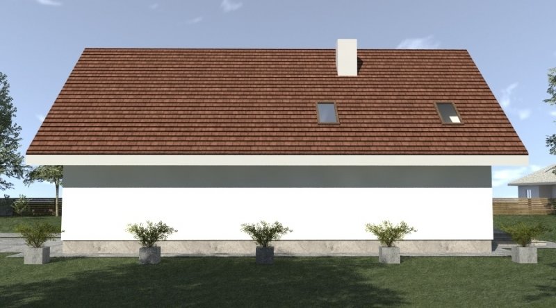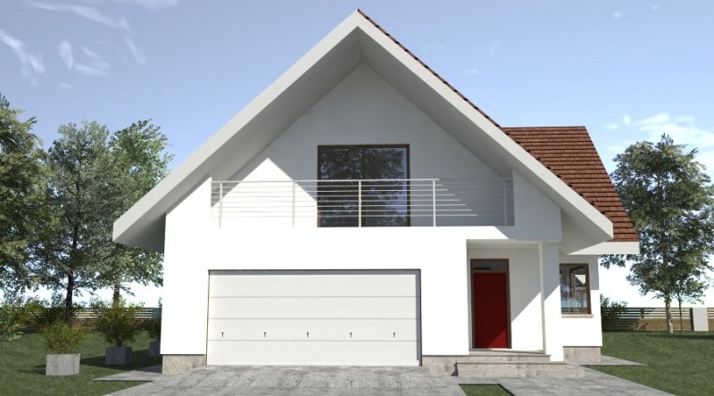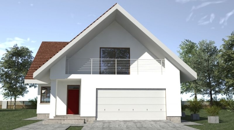 Dom parterowy z poddaszem użytkowym zaprojektowany na wąską działkę o szerokości minimalnej 18.67m. Parter domu ma charakter strefy dziennej, na którą składa się częściowo otwarta kuchnia, jadalnia, salon oraz mały gabinet. Poddasze to część nocna z sypialniami i garderobami. Dom posiada wbudowany garaż na 2 samochody osobowe oraz dość duże pomieszczenie gospodarcze.