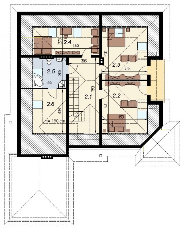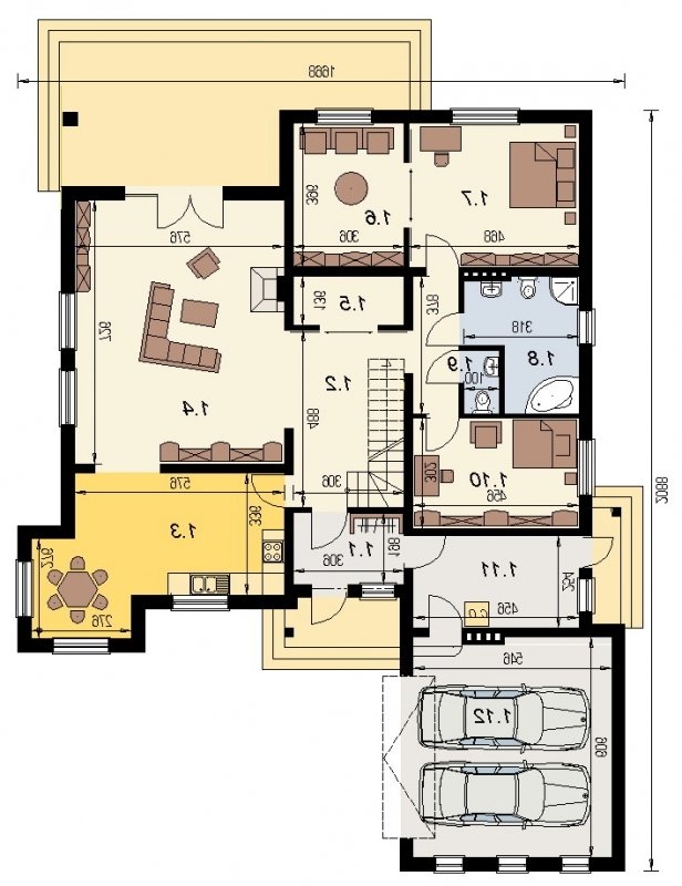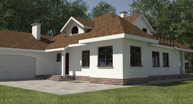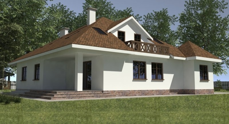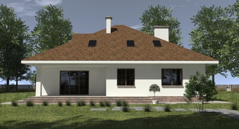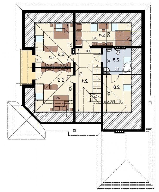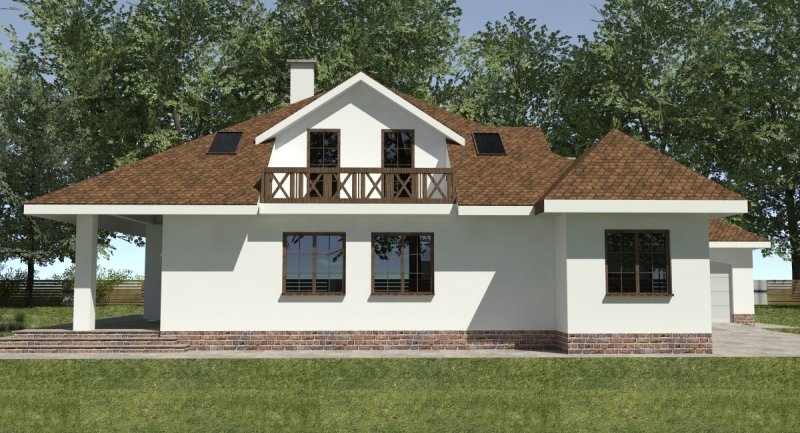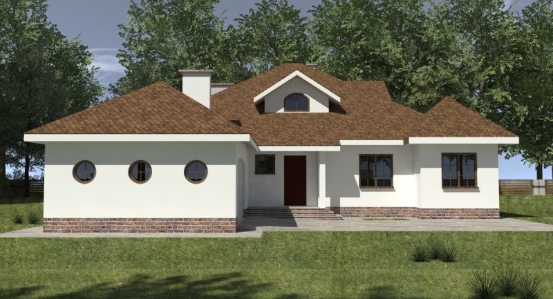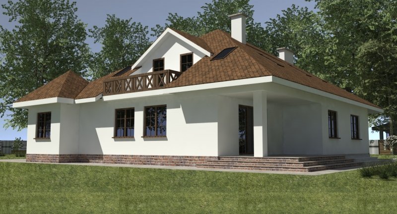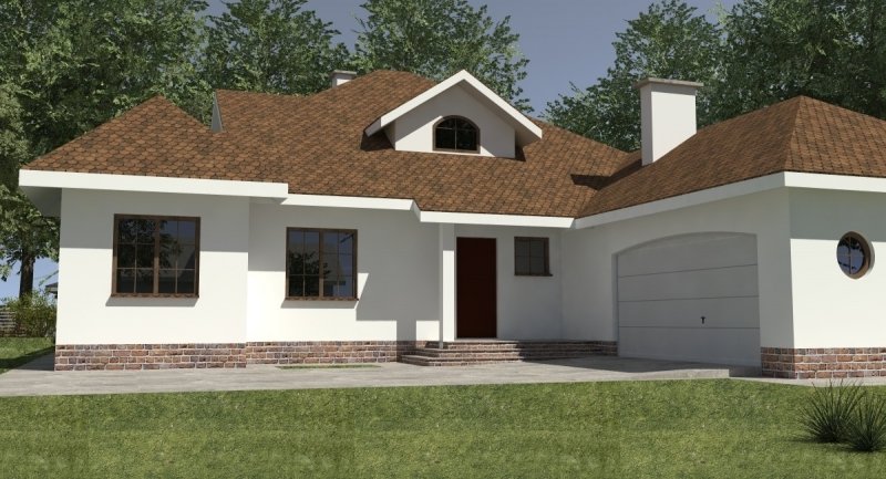 dom z poddaszem użytkowym. parter ma dość bogaty układ pomieszczeń. strefa nocna składająca się z 3 sypialni i łazienek jest całkowicie odizolowana od strefy dziennej. kuchnia jest dość obszerna. salon ma metraż ponad 41 m2. dodatkowo dom posiada wygodny garaż na 2 samochody osobowe. poddasze w tym projekcie można zagospodarować w późniejszym okresie jako 2 etap inwestycji. na poddaszu znajdują się obszerne sypialnie oraz pomieszczenia sanitarne. dom posiada bardzo ładną i gustowną architekturę tradycyjną.