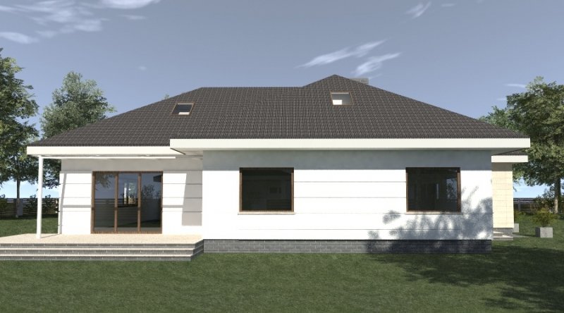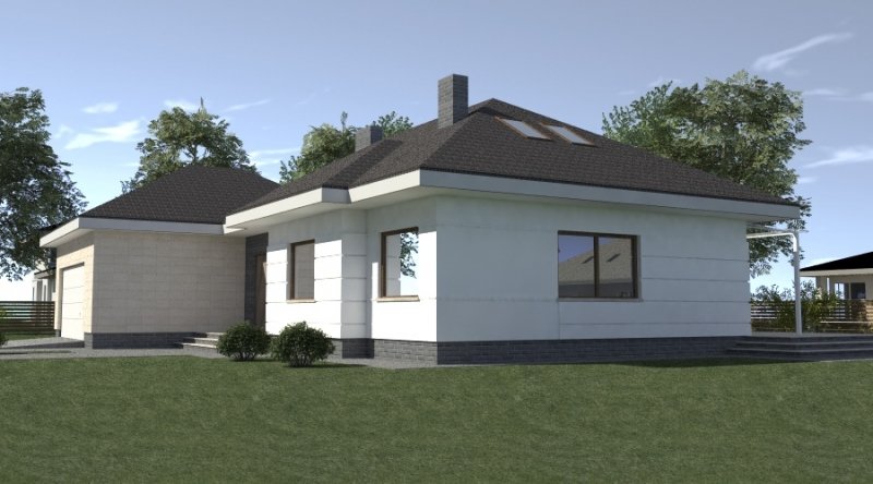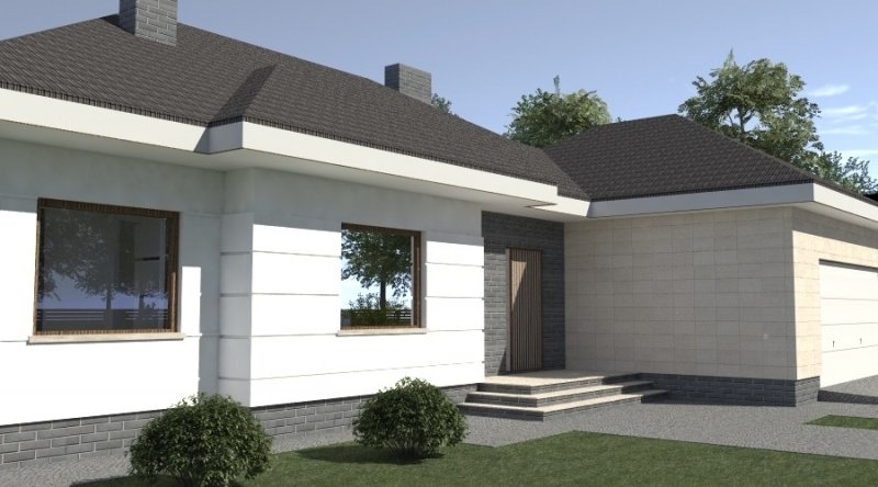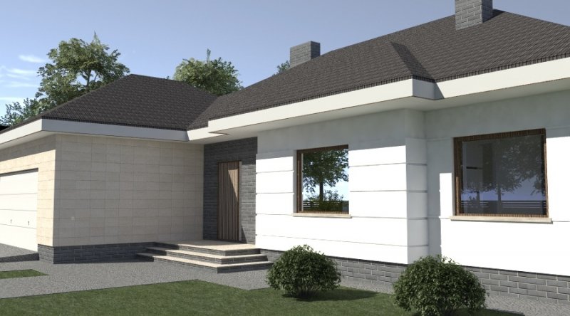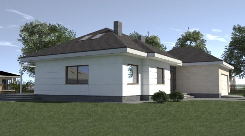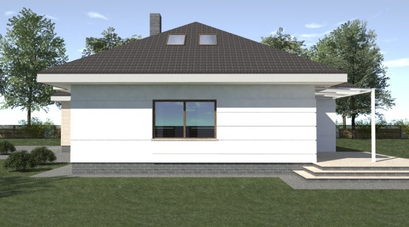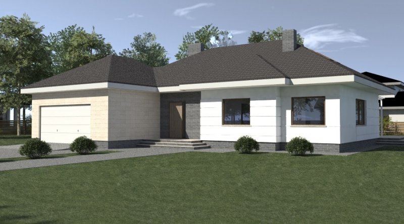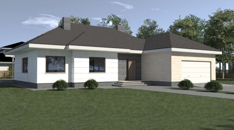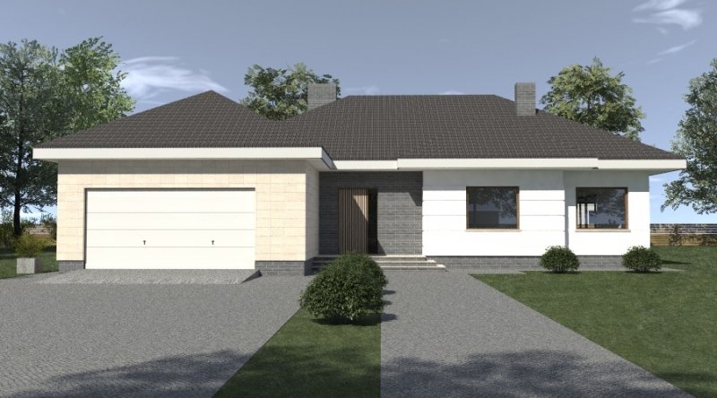 dom parterowy z poddaszem użytkowym, możliwym do późniejszej adaptacji. parter został podzielony na strefę dzienną z salonem, kuchnią i jadalnią oraz część nocną, składającą się z dwóch sypialni, łazienki i garderoby.część nocną można całkowicie oddzielić od strefy dziennej. na poddaszu zlokalizowano dwie sypialnie z pomieszczeniami pomocniczymi. ustawienie pomieszczeń na poddaszu jest w zasadzie do dowolnej aranżacji. dom posiada wbudowany garaż na 2 samochody osobowe oraz dość duże pomieszczenie gospodarcze.
