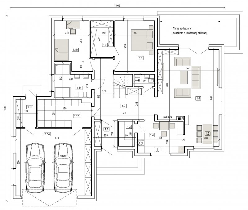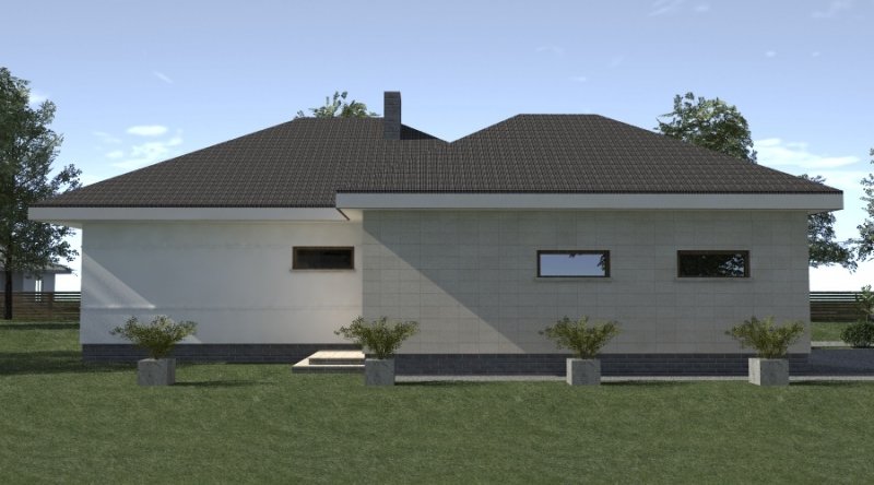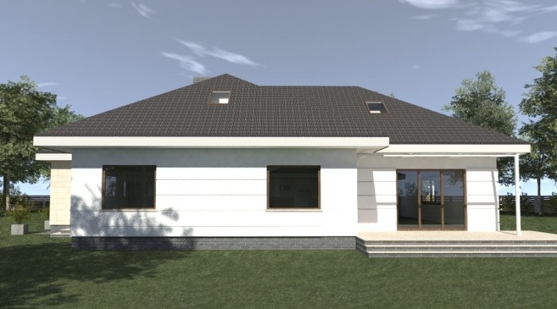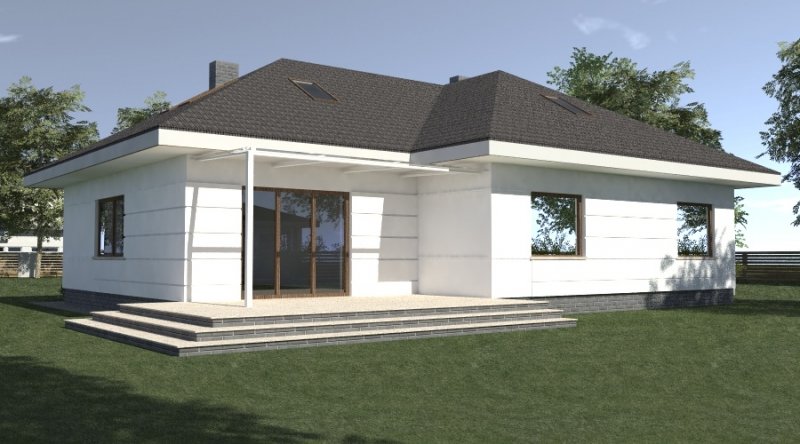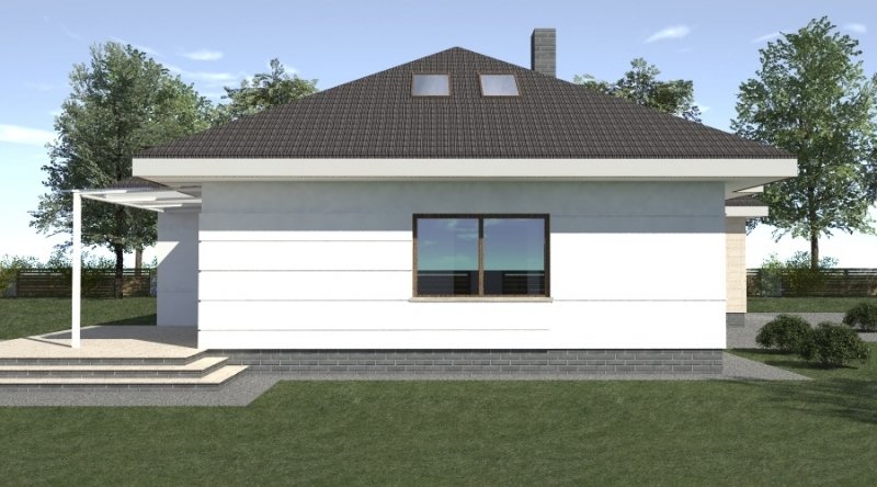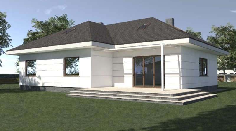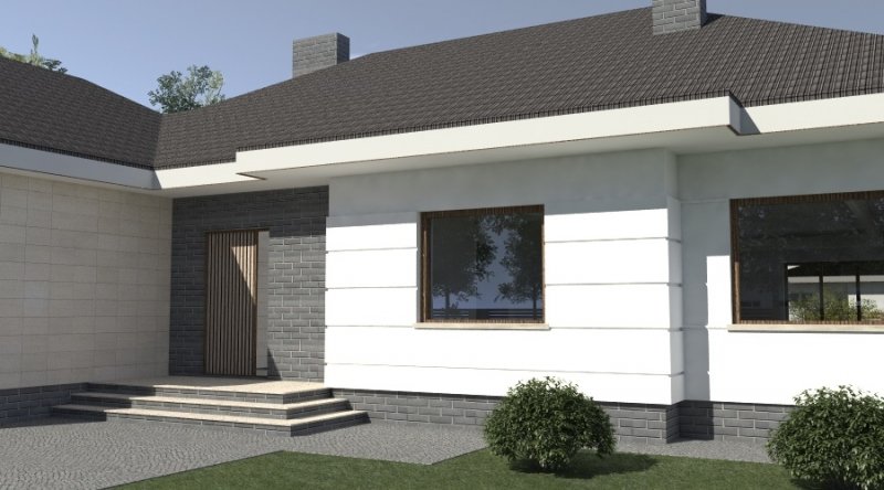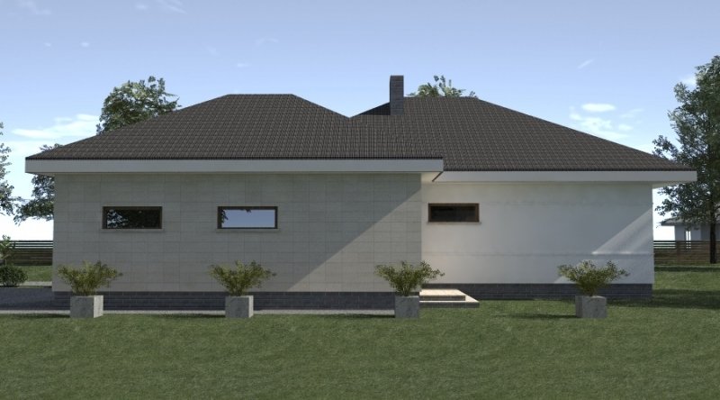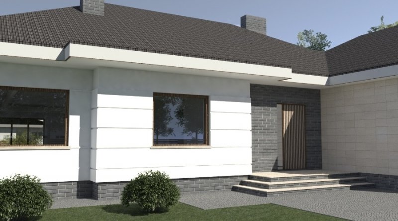 dom parterowy z poddaszem użytkowym, możliwym do późniejszej adaptacji. parter został podzielony na strefę dzienną z salonem, kuchnią i jadalnią oraz część nocną, składającą się z dwóch sypialni, łazienki i garderoby.część nocną można całkowicie oddzielić od strefy dziennej. na poddaszu zlokalizowano dwie sypialnie z pomieszczeniami pomocniczymi. ustawienie pomieszczeń na poddaszu jest w zasadzie do dowolnej aranżacji. dom posiada wbudowany garaż na 2 samochody osobowe oraz dość duże pomieszczenie gospodarcze.