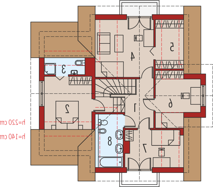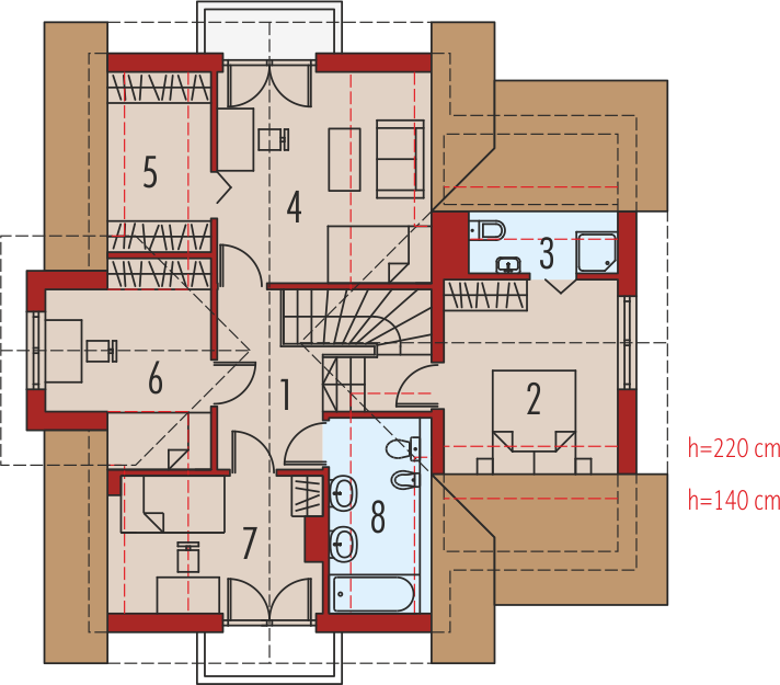 Strefa nocna – poddasze: cztery duże sypialnie, w tym jedna z garderobą i jedna z łazienką, osobna łazienka