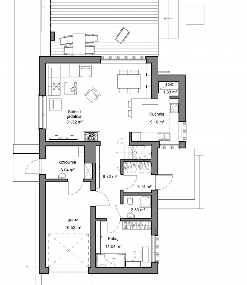 Parter wyraźnie podzielono przestrzennie na dwie strefy – dzienną oraz odizolowaną od niej część z dodatkowym pokojem i łazienką. Dzięki temu może on pełnić rolę gabinetu, do którego przychodzą osoby z zewnątrz, nie zakłócając wypoczynku domownikom, a także pokoju gościnnego. W razie potrzeby można strefę z dodatkowym pokojem odciąć drzwiami od reszty domu.