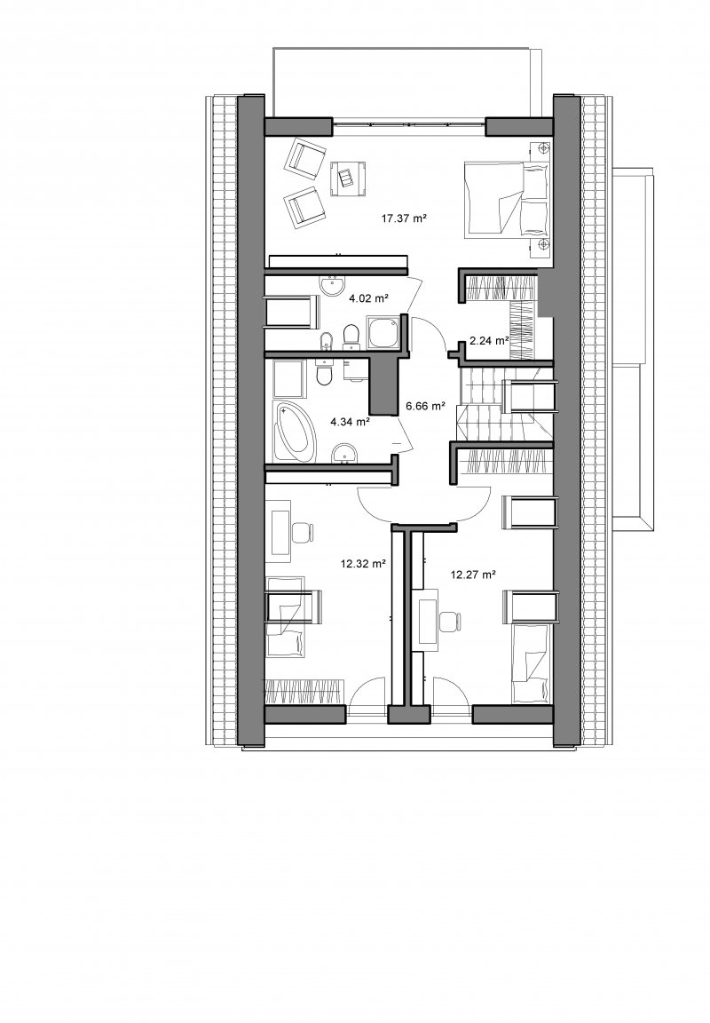 Niewielki, ale bardzo wygodny, dokładnie przemyślany dom z przestronnymi, funkcjonalnymi pomieszczeniami. Od wejścia wita wchodzących spory jasny hall ze schodami prowadzącymi na poddasze. Okno dachowe nad schodami doświetla przestrzeń.
