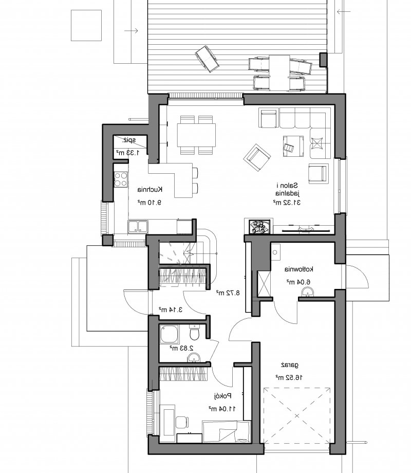 Dom posiada tylko jeden komin, poprzez zgrupowanie przewodów dymowych i spalinowych, co pozwala obniżyć koszty realizacji.