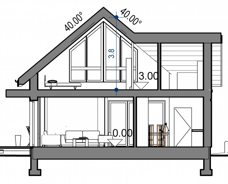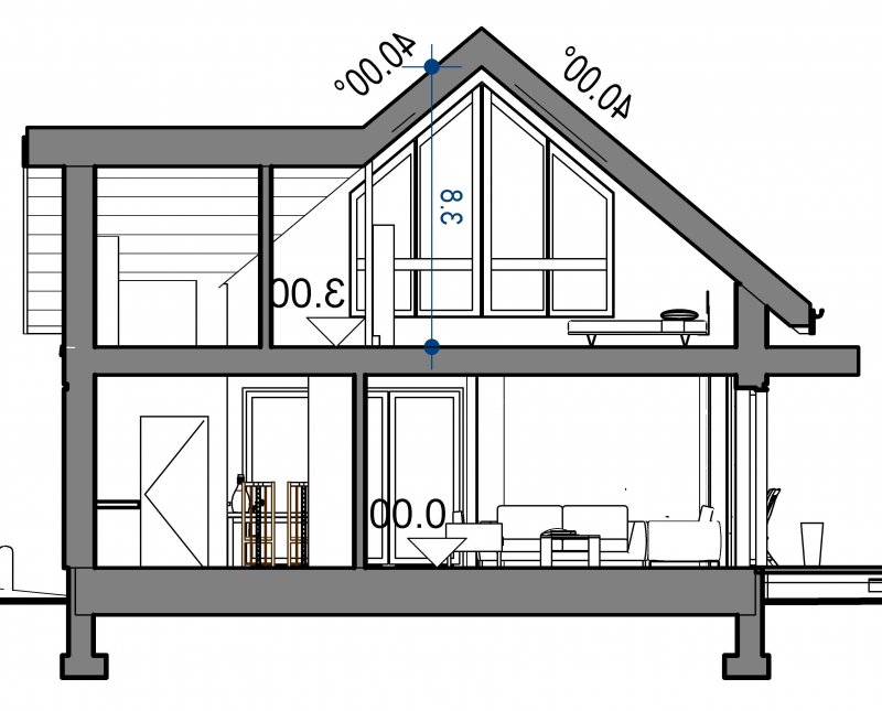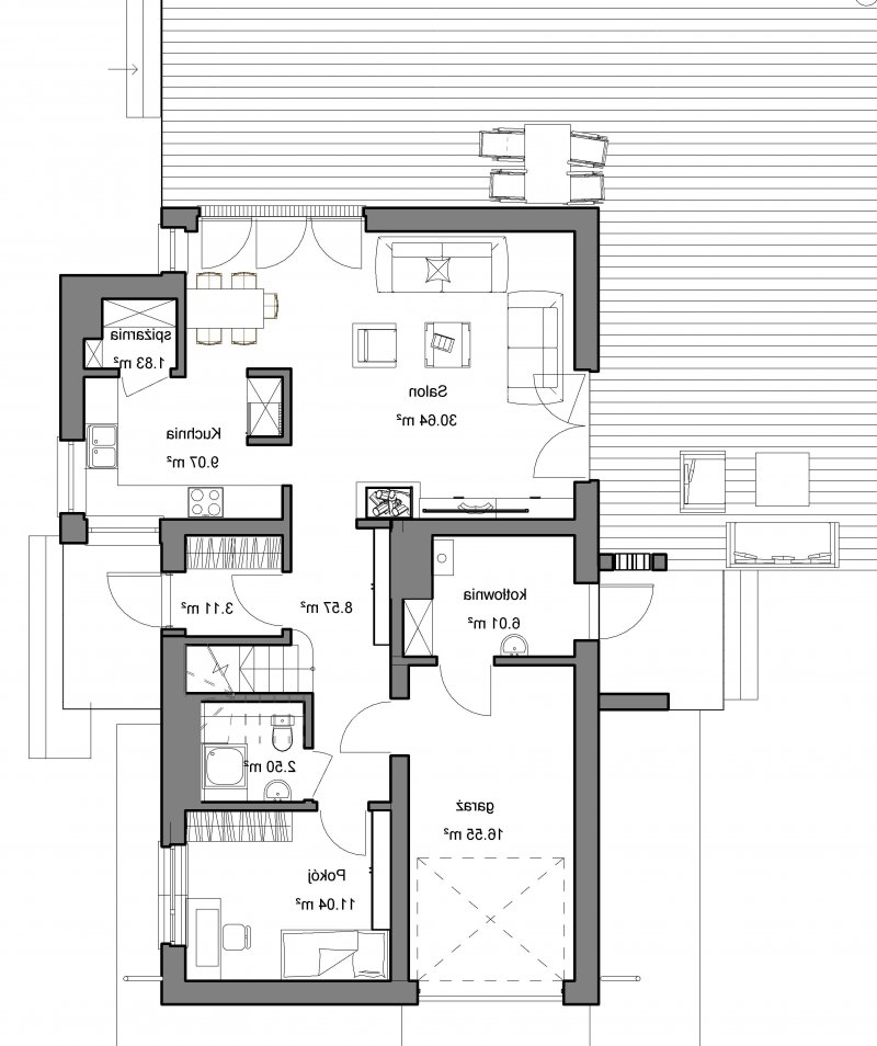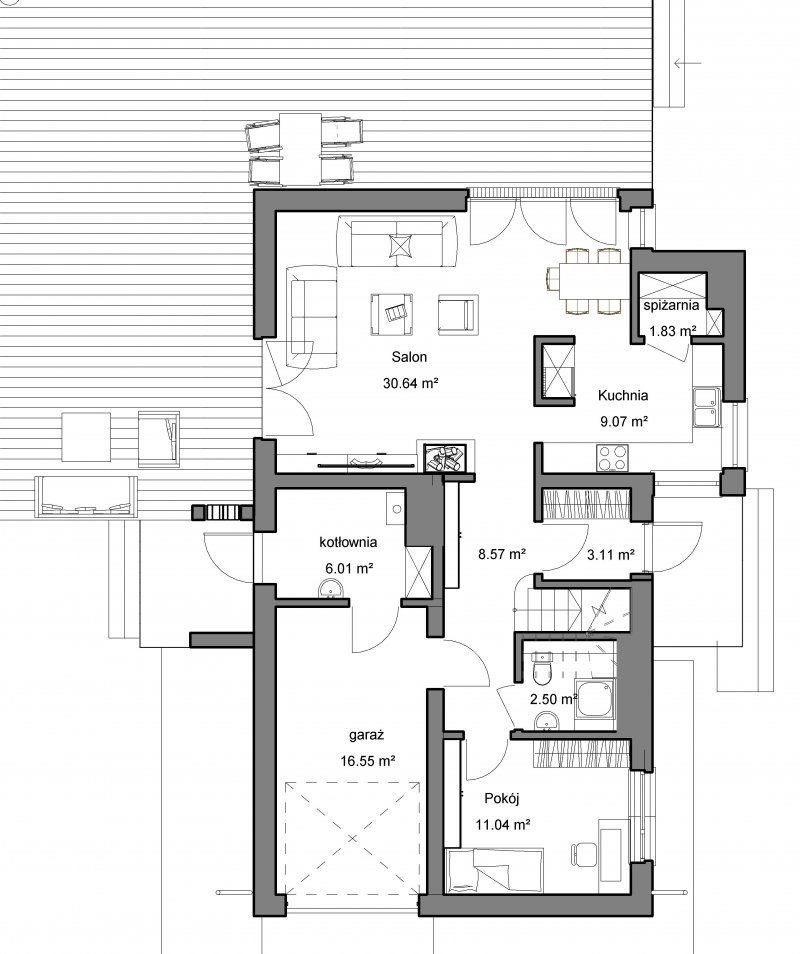 Parter wyraźnie podzielono przestrzennie na dwie strefy – dzienną oraz odizolowaną od niej część z dodatkowym pokojem i łazienką. Dzięki temu może on pełnić rolę gabinetu, do którego przychodzą osoby z zewnątrz, nie zakłócając wypoczynku domownikom, a także pokoju gościnnego. W razie potrzeby można strefę z dodatkowym pokojem odciąć drzwiami od reszty domu. Wygodna kuchnia ze spiżarnią może zostać zamknięta i oddzielona od salonu. Ustawny 30-to metrowy salon doświetlony został ze wszystkich stron, co zapewnia możliwość ustawienia domu na każdej działce.