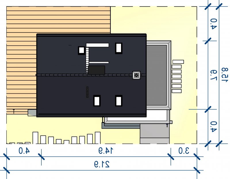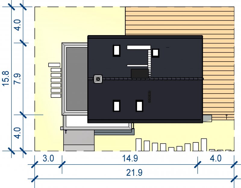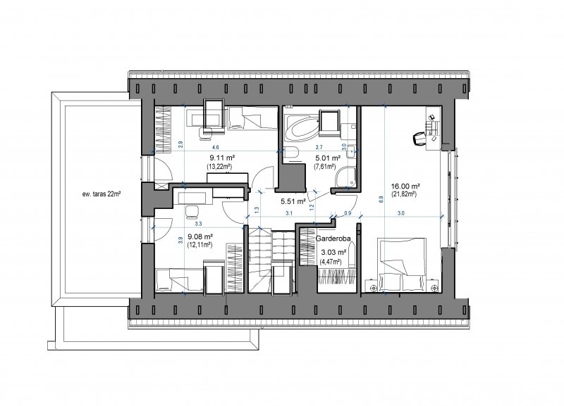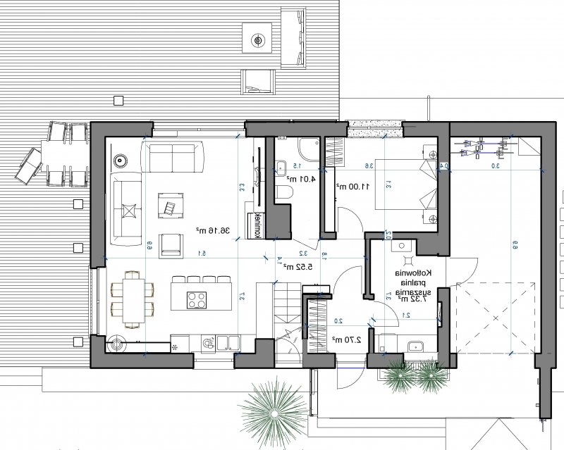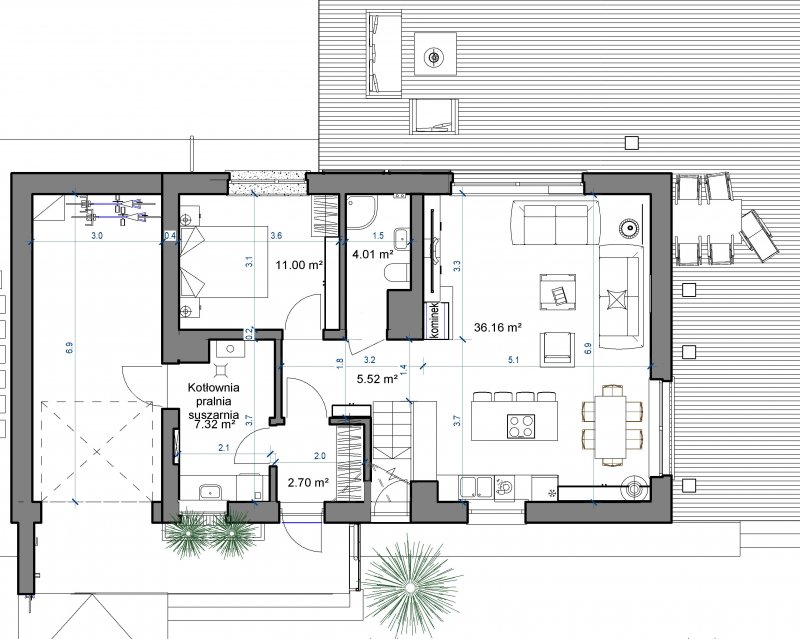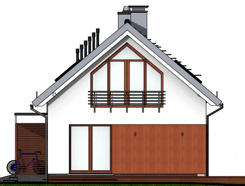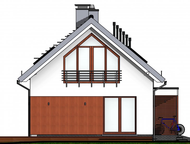 Wygodny, 5-pokojowy dom z poddaszem użytkowym. Na parterze znajduje się przestronny salon połączony z kuchnią oraz 11-metrowy pokój. Oprócz tego zaprojektowane jest także pomieszczenie przeznaczone na kotłownię oraz pralnię i suszarnię, przez które jest przejście do jednostanowiskowego garażu.