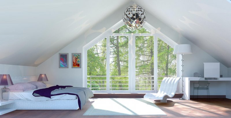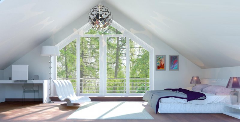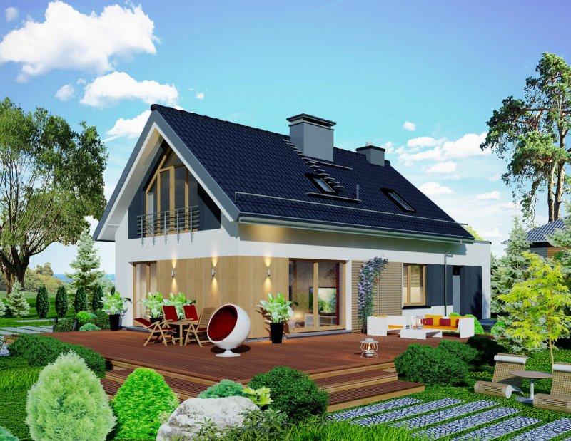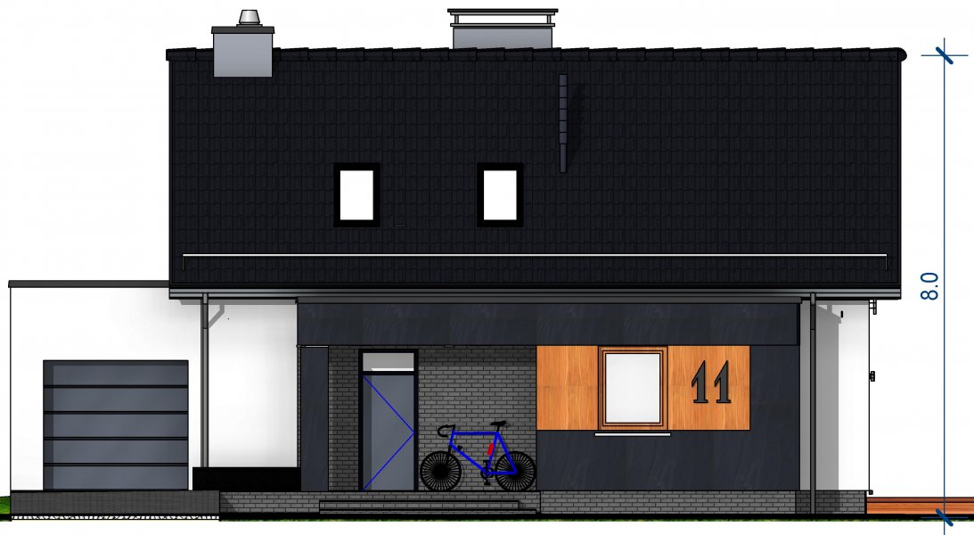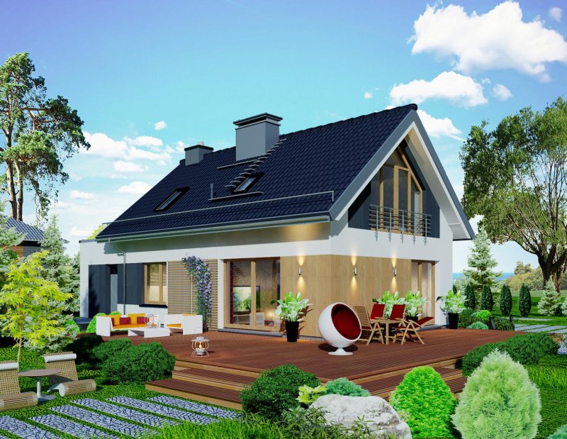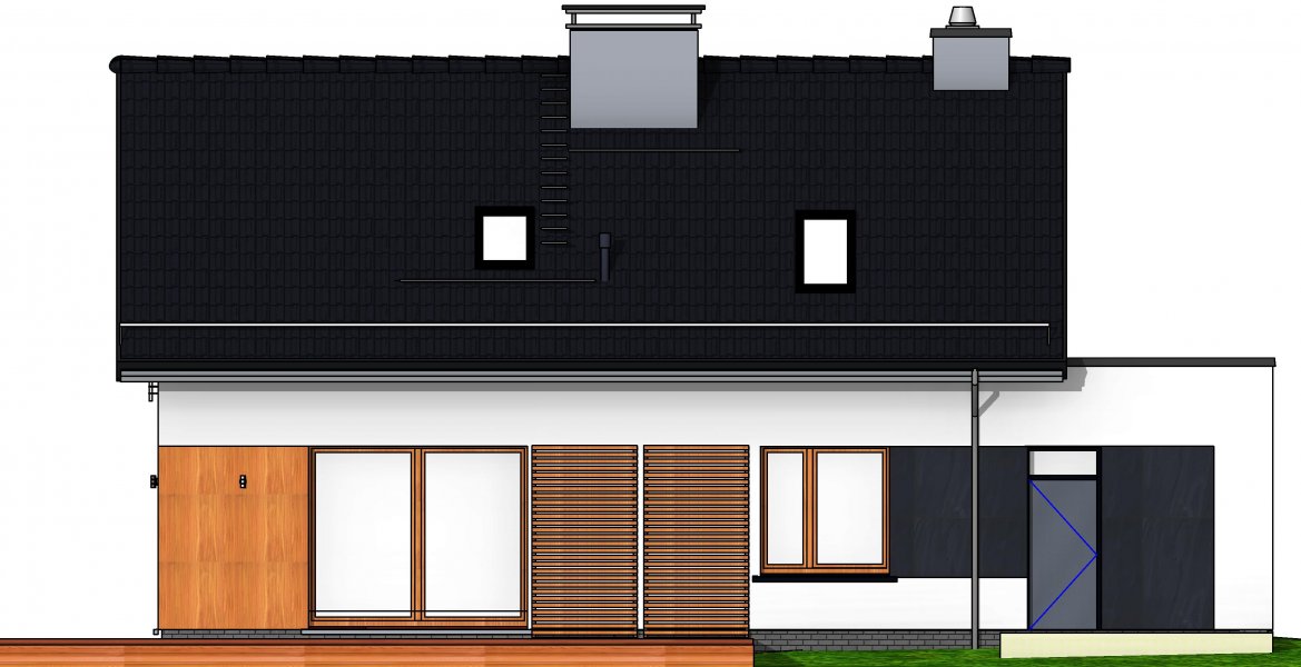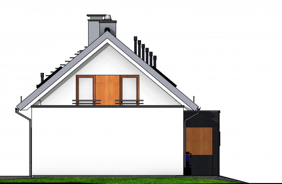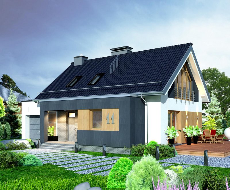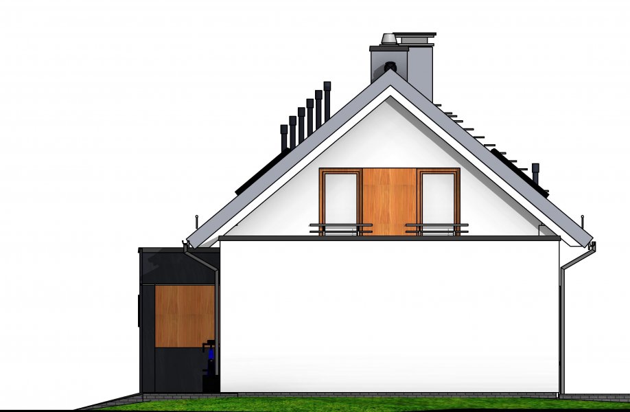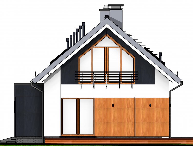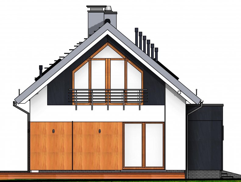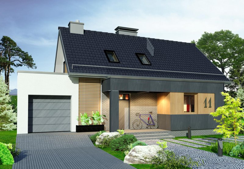 Projekt domu z poddaszem Domidea 60G z garażem 1-st., dachem dwuspadowym oraz tarasem i wykuszem.