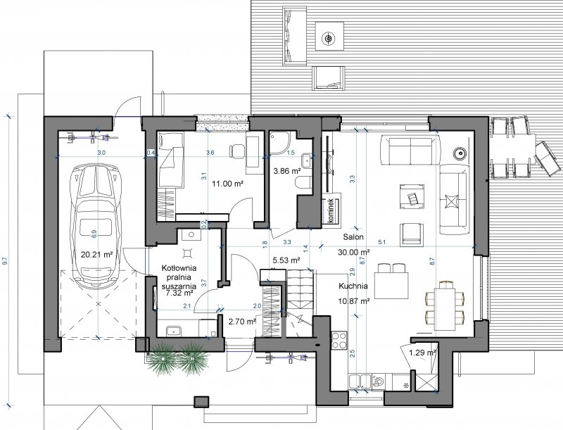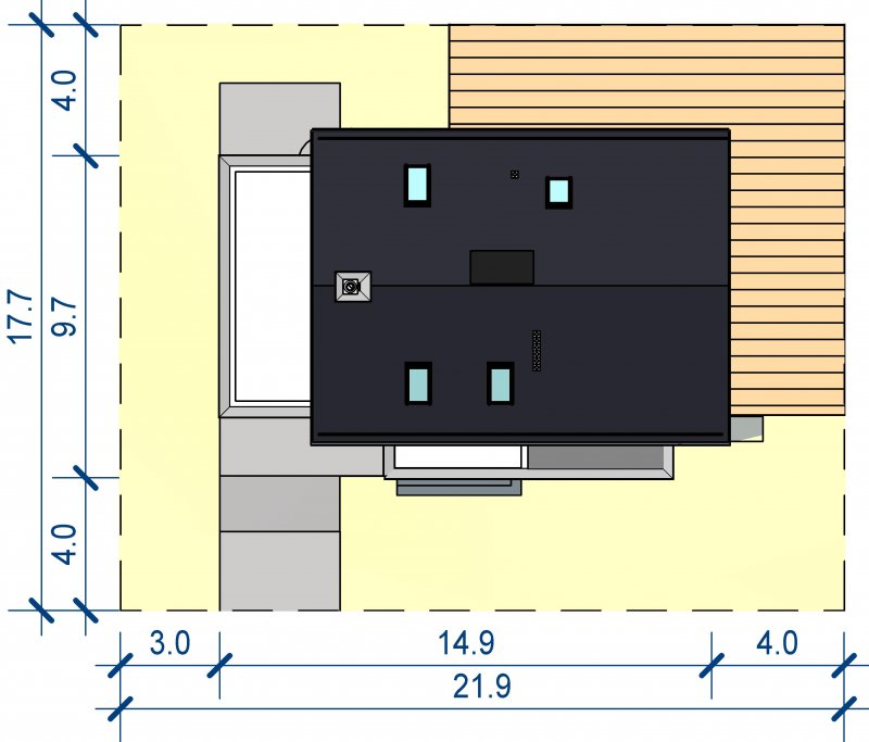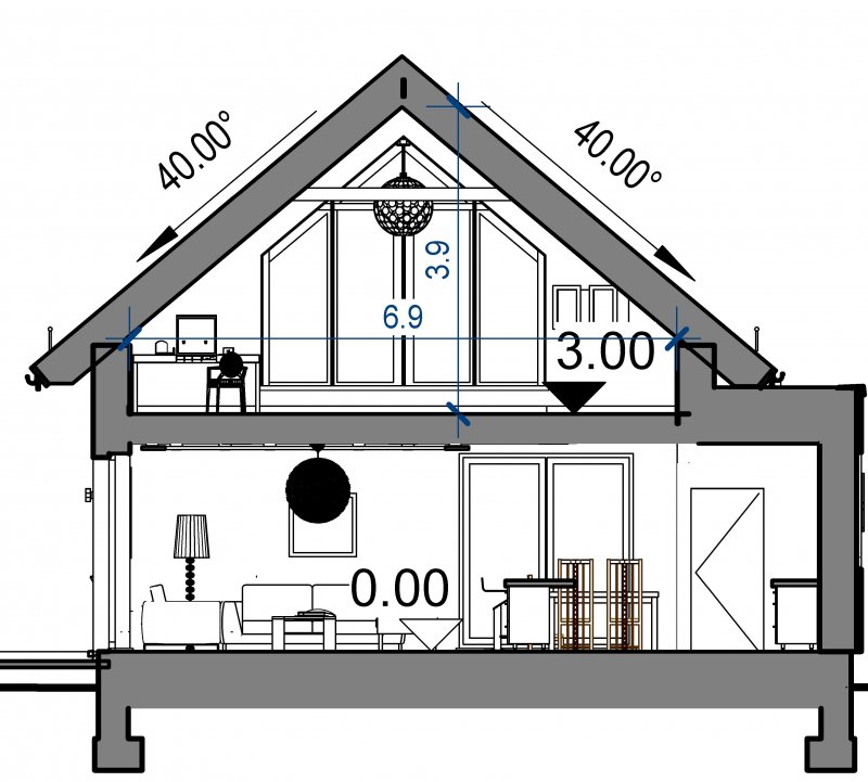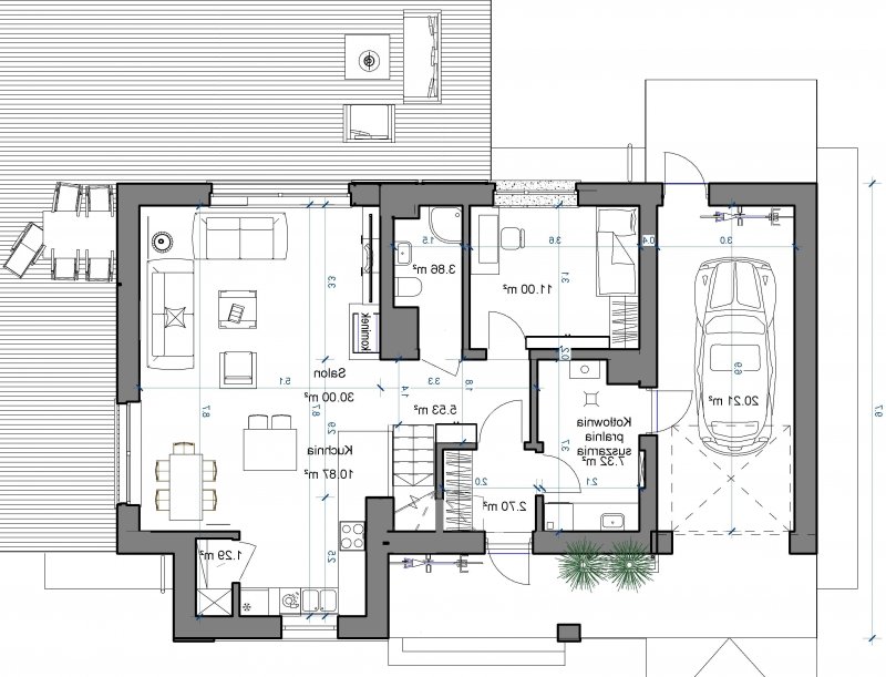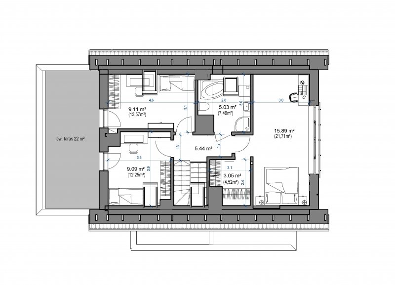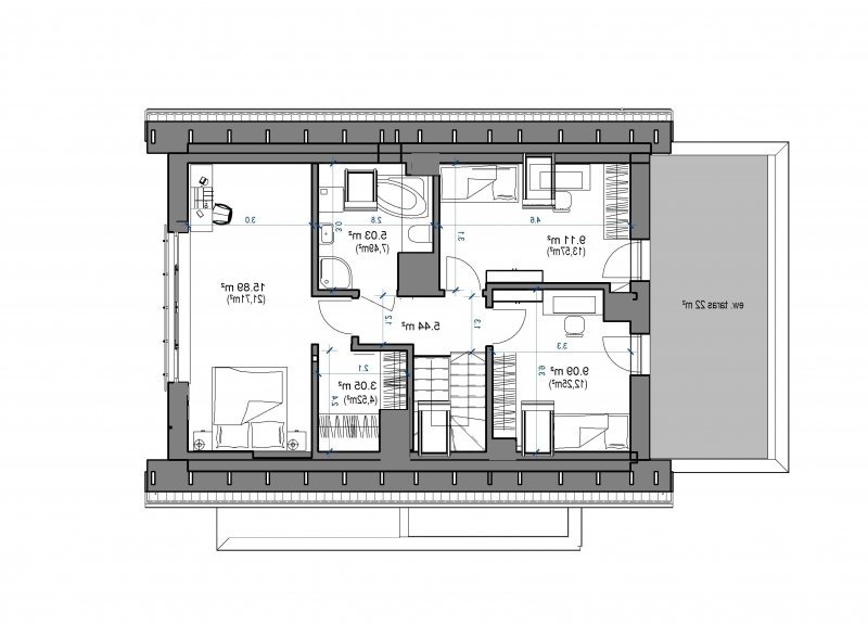 Strop gęstożebrowy. Schody monolityczne. Dach o konstrukcji drewnianej z pokryciem z dachówki ceramicznej, cementowej lub blachodachówki.