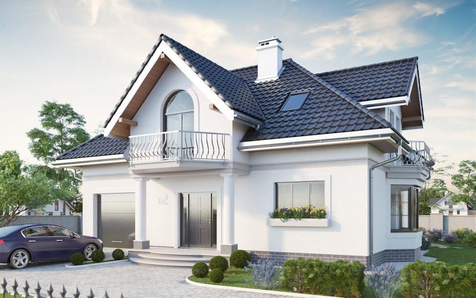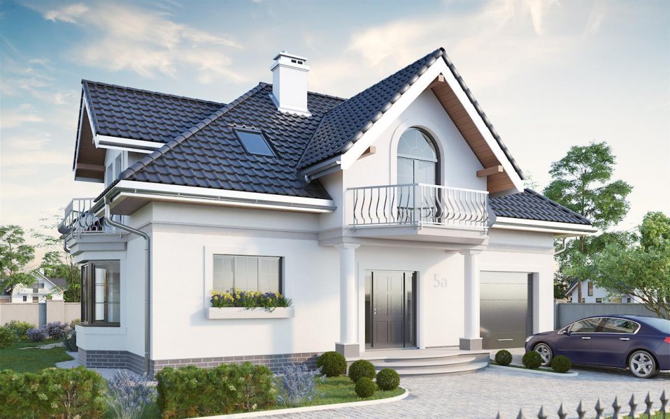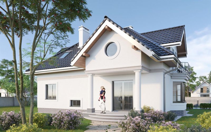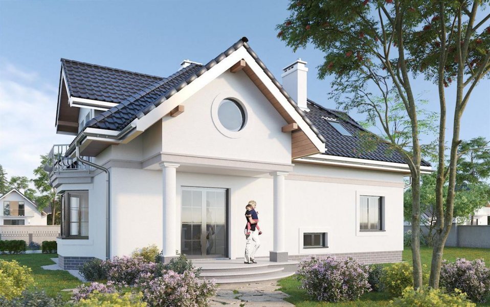 Projekty domów średniej wielkości z użytkowym poddaszem z Rodziny Dymszy charakteryzuje zwarta bryła i jeden dach dla części mieszkalnej i garażowej. Energooszczędny prostopadłościan urozmaica efektowna lukarna od frontu, wsparta na słupach oraz balkony. Projekty różni wielkość pomieszczeń, kształt dachu i wariantowanie fragmentów planu. Projekt domu Dymsza Karo jest średnim w rodzinie, a przy tym mniejszym z dwóch wersji o czterospadowym dachu z lukarnami w każdej połaci. We wszystkich rozwiązaniach Dymszy parter podzielono konstrukcyjnie i funkcjonalnie na mieszkalną strefę dzienną oraz na część gospodarczą. Otwarta kuchnia jest wyraźnie zaznaczona i łączy się z salonem przez jadalnię umieszczoną w ryzalicie jednej ze ścian bocznych Przestrzeń pod schodami wykorzystana została w projekcie domu Dymsza Karo na schowek przy małym gabinecie, a połączenie z garażem i dużą kotłownią przewidziano w sieni. Poddasze przewiduje 4 pokoje i łazienkę. Zaprojektowano tu wyjątkową w Rodzinie Dymszy garderobę przy głównej sypialni, ulokowaną w jednej z czterech lukarn. Wsparta słupami nad wyjściem z salonu stanowi jednocześnie osłonę tarasu ogrodowego.