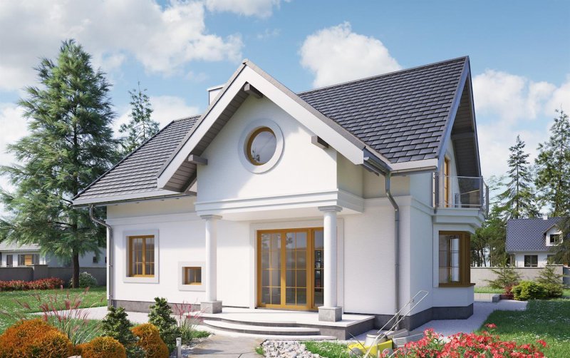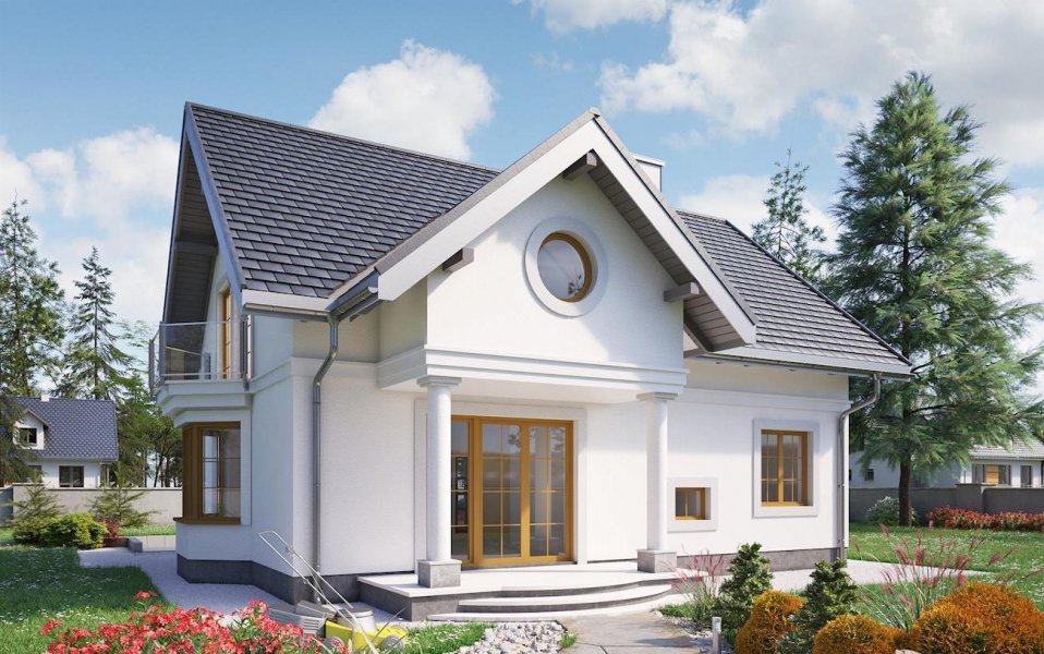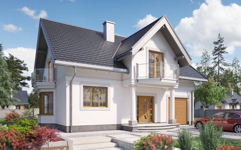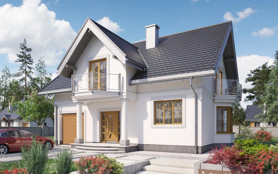 Wszystkie średniej wielkości projekty domów z użytkowym poddaszem z Rodziny Dymszy, charakteryzuje zwarta bryła i jeden, ekonomiczny dach dla części mieszkalnej i garażowej. Energooszczędny prostopadłościan urozmaica efektowna lukarna od frontu, wsparta na słupach oraz balkony, z których jeden wieńczy dekoracyjny ryzalit w ścianie bocznej. Projekty różni wielkość pomieszczeń, kształt dachu i wariantowanie fragmentów planu. W najmniejszym projekcie domu Dymsza Rex, tak jak we wszystkich wersjach, parter podzielono konstrukcyjnie i funkcjonalnie na mieszkalną strefę dzienną oraz na część gospodarczą. Otwarta kuchnia łączy się z salonem przez jadalnię umieszczoną w ryzalicie. Przestrzeń pod schodami wykorzystana została na powiększenie kotłowni za garażem. Projekt domu Dymsza Rex ma dwuspadowy dach. Wszystkie cztery pokoje poddasza mają zbliżoną wielkość i wyjścia na balkon, a przedpokój - foremny kształt. Główna sypialnia wyróżniona została (jak w większych wersjach: Karo z czterospadowym dachem i Polo) garderobą. Ulokowano ją w lukarnie wspartej na słupach i osłaniającej wyjście z salonu na taras ogrodowy.