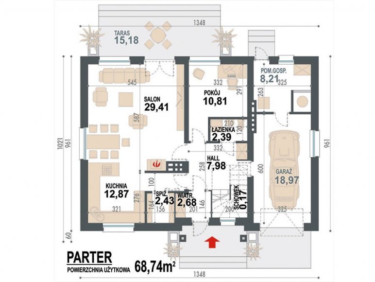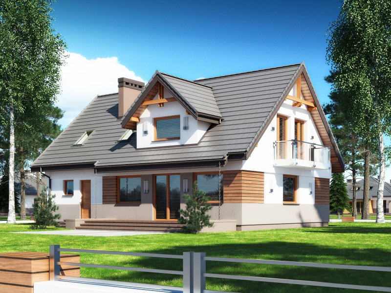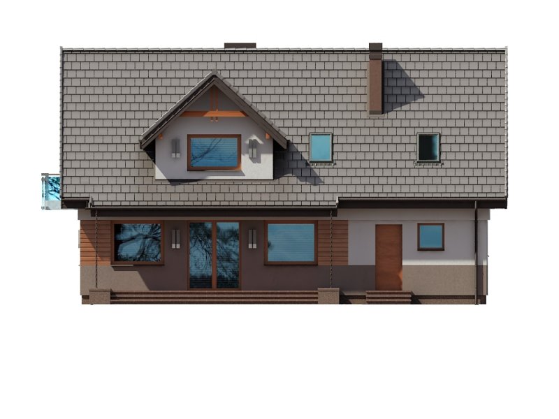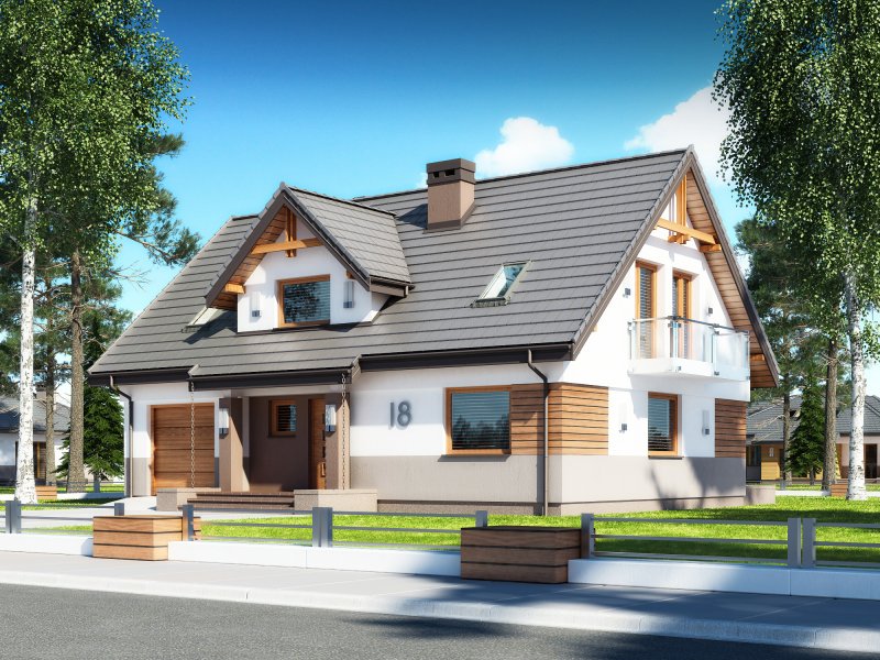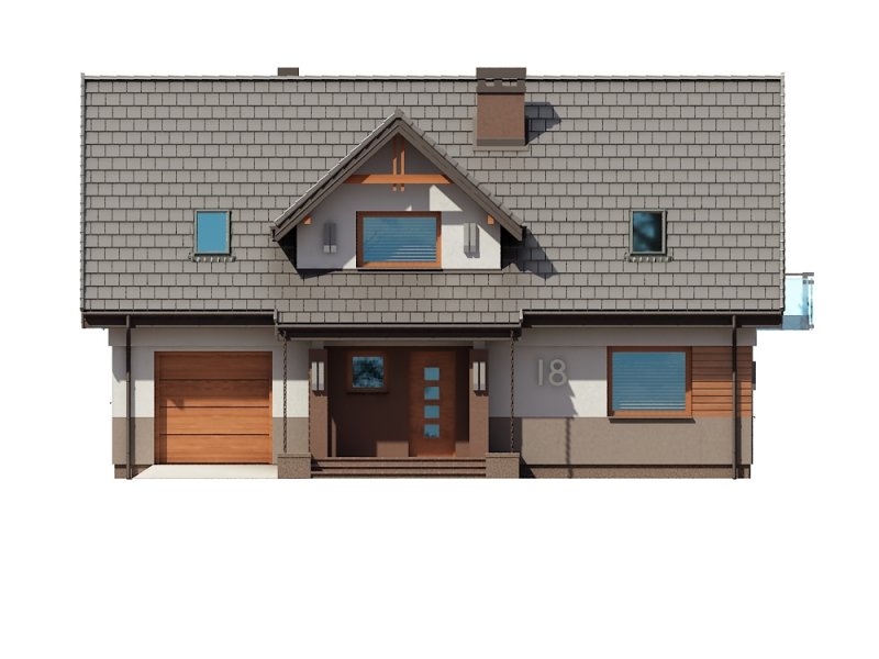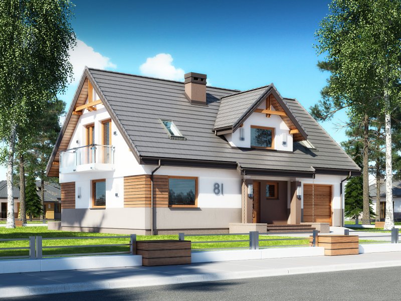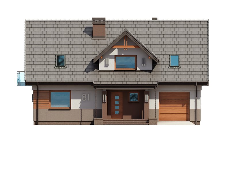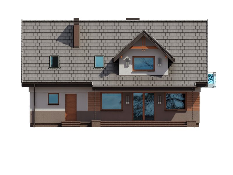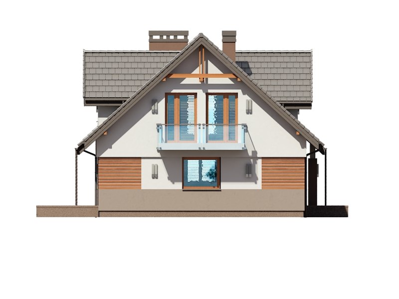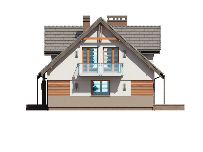 Projekt Dżin N prezentuje nowy wariant opracowania elewacji w wersji z garażem jednostanowiskowym (istnieje wersja z garażem dwustanowiskowym). Wersja N została przygotowana z nową kolorystyką tynków oraz pokrycia dachowego. Zarówno kolorystyka jak i nowe materiały są odpowiedzią na aktualnie modne trendy w architekturze projektów typowych. Z uwagi na bardzo udany układ funkcjonalny budynku, nie wprowadzono żadnych zmian w stosunku do klasycznej wersji poprzedniej. Na parterze proponowanego projektu znajdują się: otwarta kuchnia ze spiżarnią, przestronny salon z aneksem jadalnym i kominkiem oraz wyjściem na duży taras częściowo zadaszony. Kondygnację dolną stanowią także: dodatkowy pokój mogący pełnić funkcję gabinetu lub sypialni dla gości, wiatrołap i hol ze schowkiem pod schodami oraz łazienka, zaś w części tachnicznej garaż jednostanowiskowy z pomieszczeniem kotłowni dostępnym zarówno z samego garażu jak i z zewnątrz budynku od strony ogrodowej. Na poddaszu zaprojektowano 3 sypialnie. Jedna z sypialni przeznaczona dla rodziców jest powiązana funkcjonalnie z pomieszczeniem garderoby i posiada port-fenetre zaś pozostałe sypialnie dla dzieci mają możliwość wyjścia na wspólny balkon. Przewidziano tutaj także przestronną łazienkę ogólnodostępną i miejsce na szafę do zabudowy otwartą na hol i pełniącą funkcję garderoby ogólnodostępnej. Projekt posiada także strych nieużytkowy ze schodami opuszczanymi.