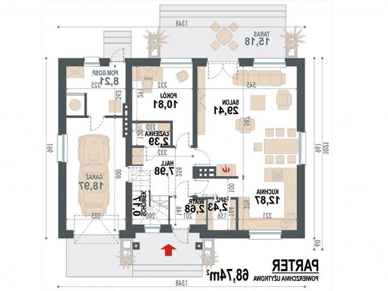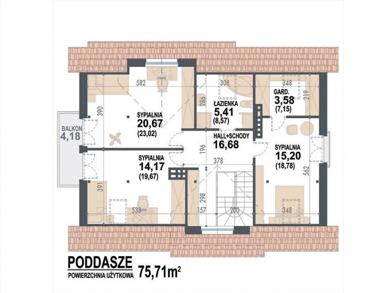 | dach | o konstrukcji drewnianej, pokryty dachówką ceramiczną, cementową lub blachodachówką |