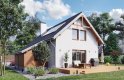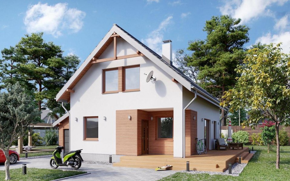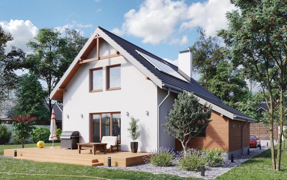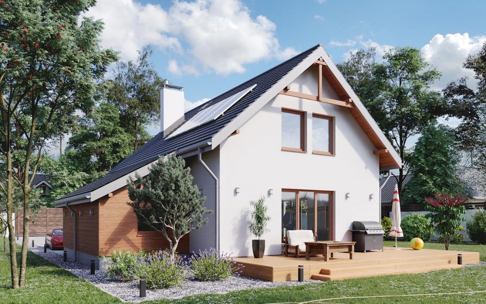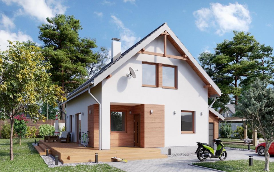 Na parterze zaprojektowano hol, pokój dzienny, kuchnię z jadalnią, łazienkę, kotłownię z pralnią, wiatrołap (sień) i garaż. Na poddaszu znajdują się 3 pokoje, przedpokój i łazienka. Garaż dostępny jest z poziomu terenu. Zasadniczą bryłę budynku tworzy prostopadłościan z wyciętym podcieniem wejścia. Budynek przykrywa dach dwuspadowy o kącie nachylenia połaci 40°. Do budynku dostawiono garaż kryty dachem pulpitowym.