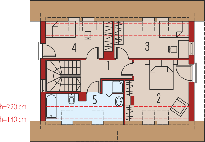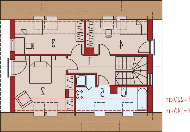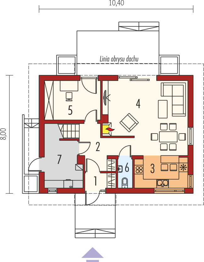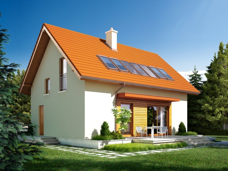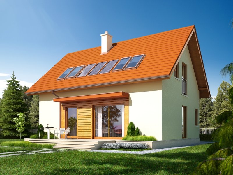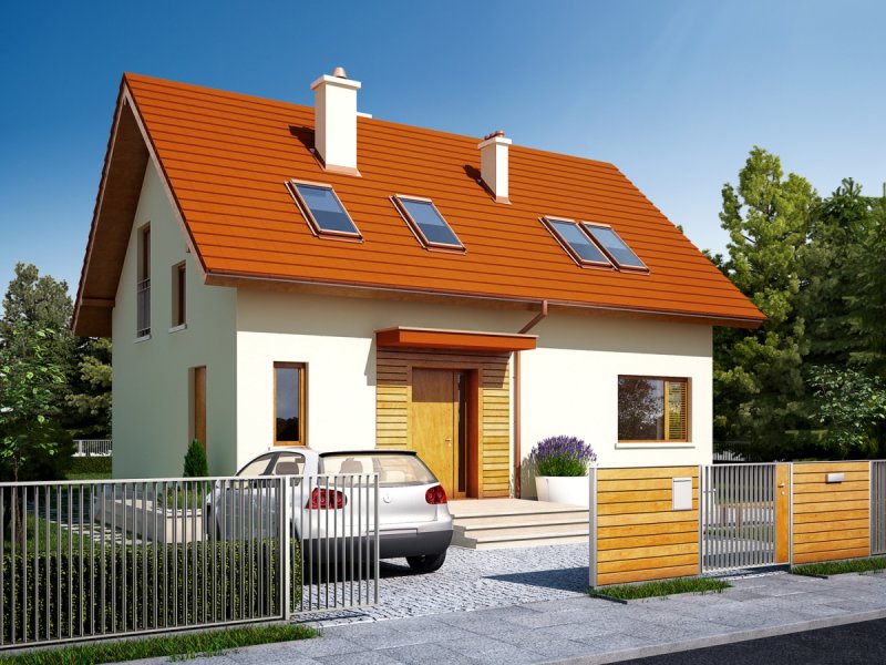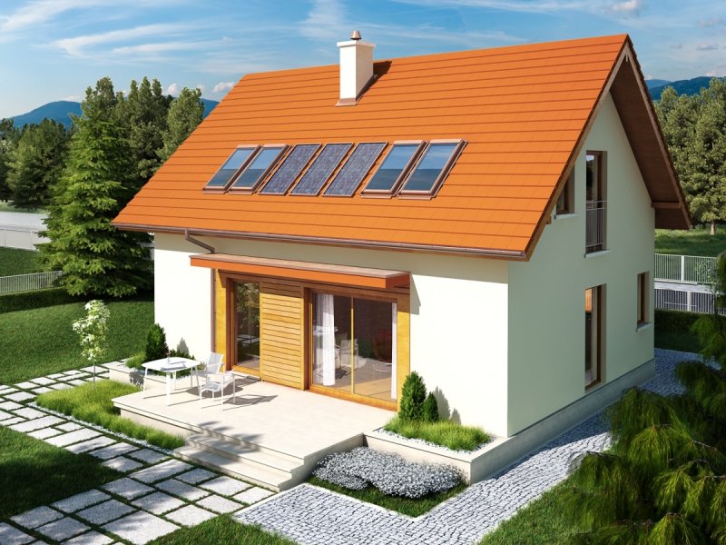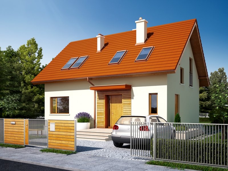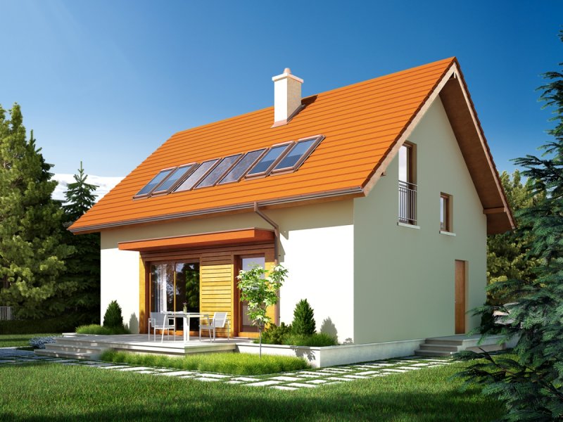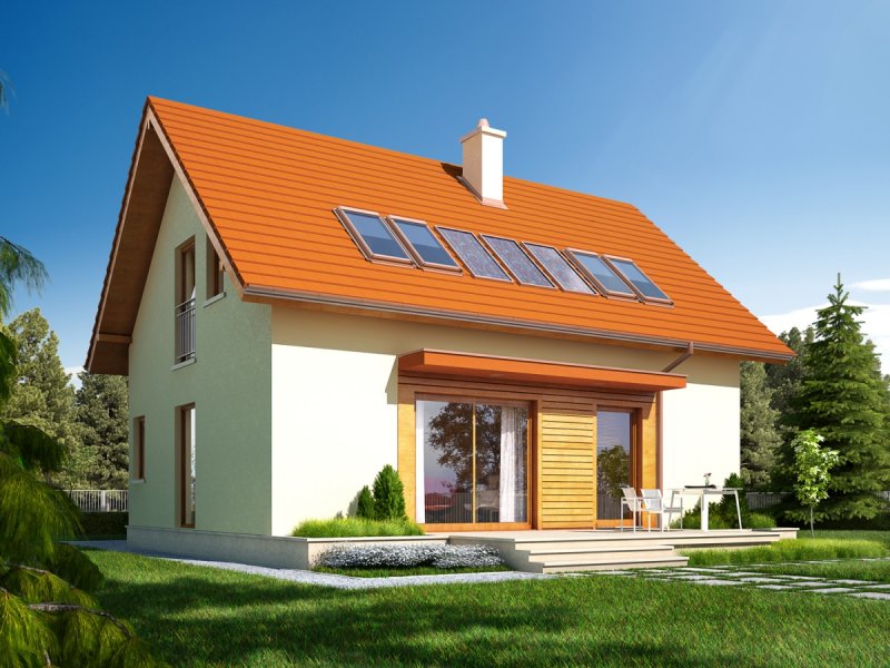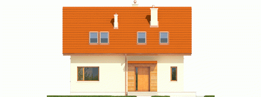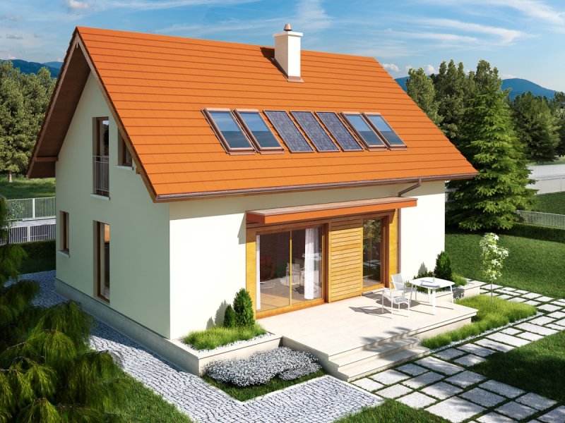 Dom parterowy z poddaszem użytkowym, niepodpiwniczony, przeznaczony dla 3-4 osobowej rodziny. Strefę dzienną tworzy otwarta kuchnia połączona z pokojem dziennym i jadalnią, gabinet oraz toaleta. Strefa nocna to trzy sypialnie z wygodną łazienką. Pomieszczenie gospodarcze, które spełnia również funkcję kotłowni umożliwia przejście do strefy mieszkalnej i na zewnątrz budynku. Dom E1 od pierwszego wejrzenia czaruje swoim słonecznym charakterem. Nad strefą wejściową oraz częścią tarasu zaplanowano zadaszenia, które kolorystycznie korespondują z dachem budynku. Elewacja utrzymana w tonacji jasnego beżu, została wzbogacona naturalnym odcieniem drewna. Atutem domu jest czytelny podział na strefy. Dzięki perfekcyjnie rozplanowanemu układowi okien, w tym okien połaciowych wnętrze jest maksymalnie doświetlone i przytulne. E1 to dom zaprojektowany w duchu tradycyjnej architektury – ekonomiczny w realizacji i późniejszej eksploatacji. Kolekcja ECONOMIC - domy ładne i tanie w budowie Kolekcja ECONOMIC została zaprojektowana z troską o ekonomiczny charakter budowy. Prosta bryła, ograniczona ilość detali architektonicznych oraz zminimalizowana liczba pionów instalacyjnych sprawia, że domy z Kolekcji ECONOMIC są tanie w realizacji i późniejszej eksploatacji. Atuty Kolekcji ECONOMIC • Prosta konstrukcja domu – niskie koszty budowy • Standardowe wymiary stolarki okiennej – najtańsze rozwiązania profili okiennych • Brak okrągłych okien, rozbudowanych przeszkleń i rolet • Nowoczesna interpretacja klasycznej bryły domu • Optymalny układ funkcjonalny • Idealne proporcje budynku – atrakcyjny efekt estetyczny • Czysta forma bez zbędnych detali Istnieje możliwość: - podpiwniczenia budynku