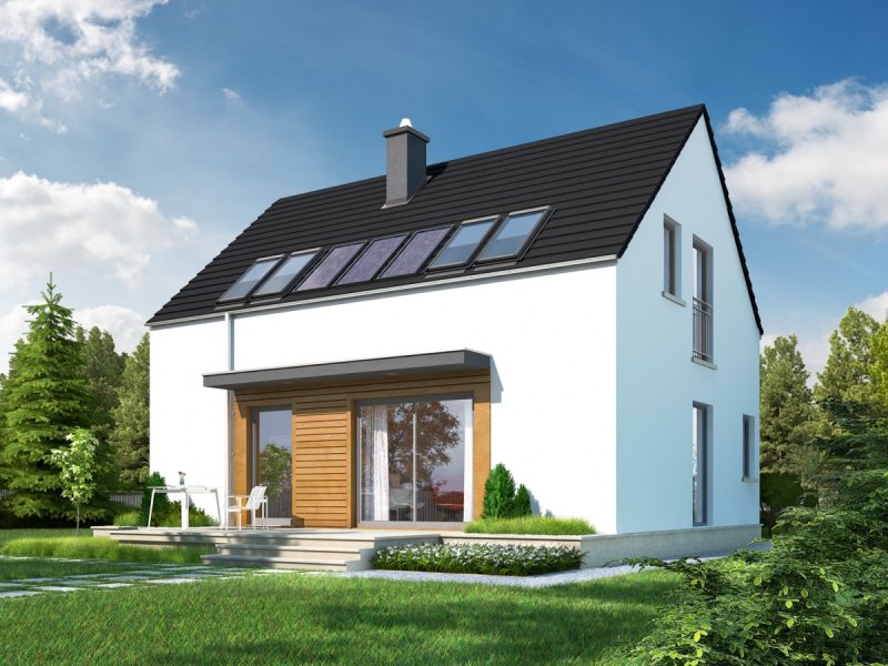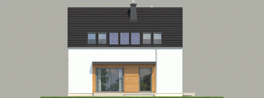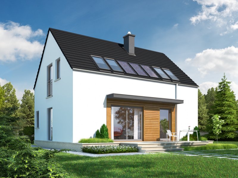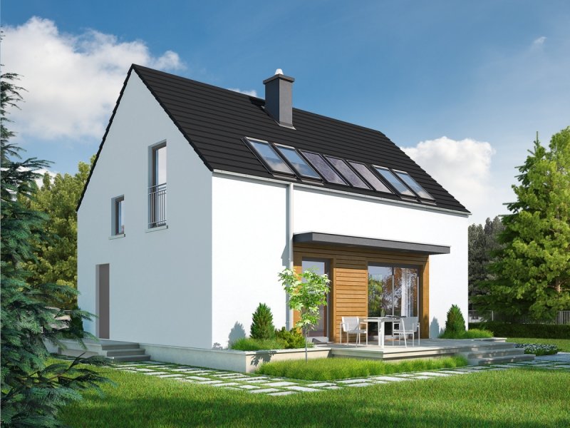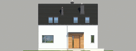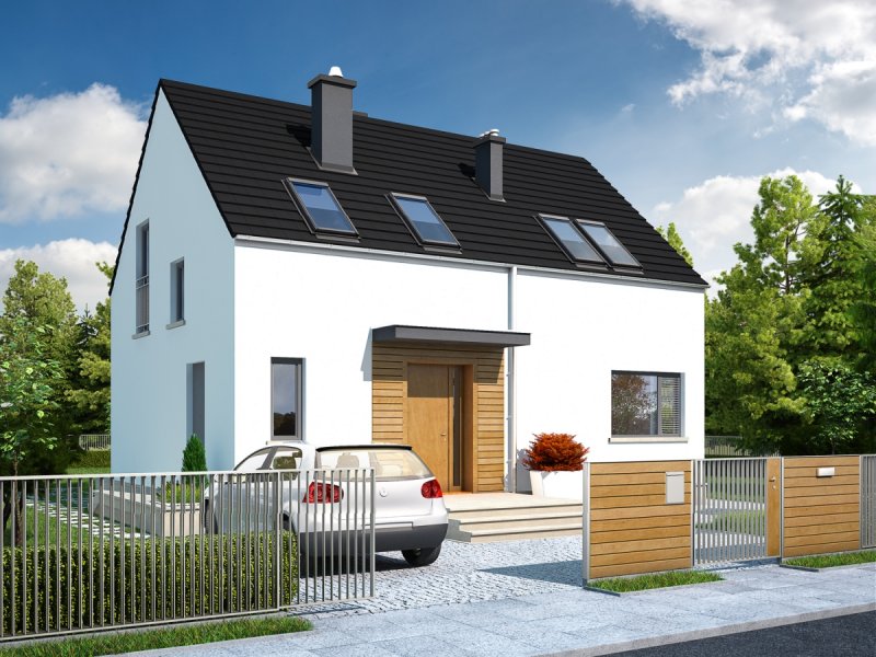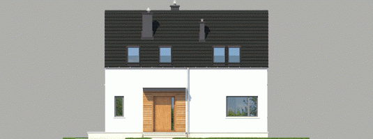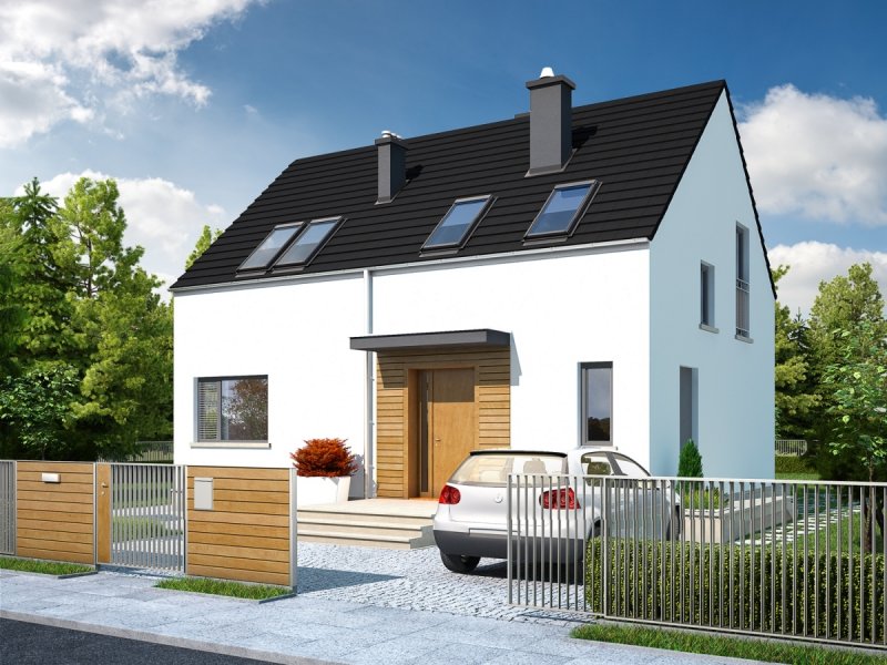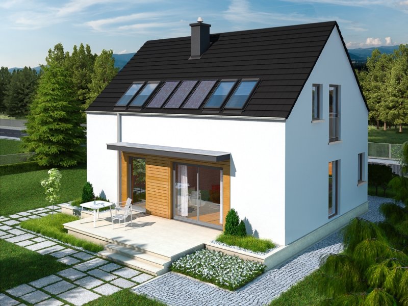 Dom E1 (wersja A) MULTI-COMFORT uwodzi czystą elegancją i klasycznym pięknem formy. Nad strefą wejściową oraz częścią tarasu zaplanowano zadaszenia, które kolorystycznie korespondują z dachem budynku. Elewacja, utrzymana w tonacji ascetycznej bieli, została wzbogacona naturalnym odcieniem drewna. Atutem domu jest czytelny podział na strefy. Dzięki perfekcyjnie rozplanowanemu układowi okien, w tym okien połaciowych, wnętrze jest maksymalnie doświetlone i przytulne. E1 ECONOMIC (wersja A) to dom zaprojektowany w duchu nowoczesności – ekonomiczny w realizacji i późniejszej eksploatacji.