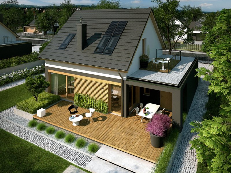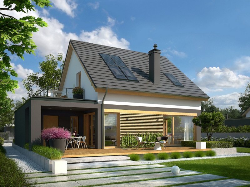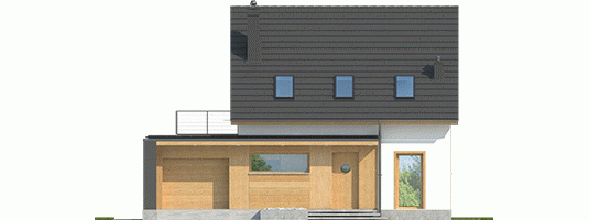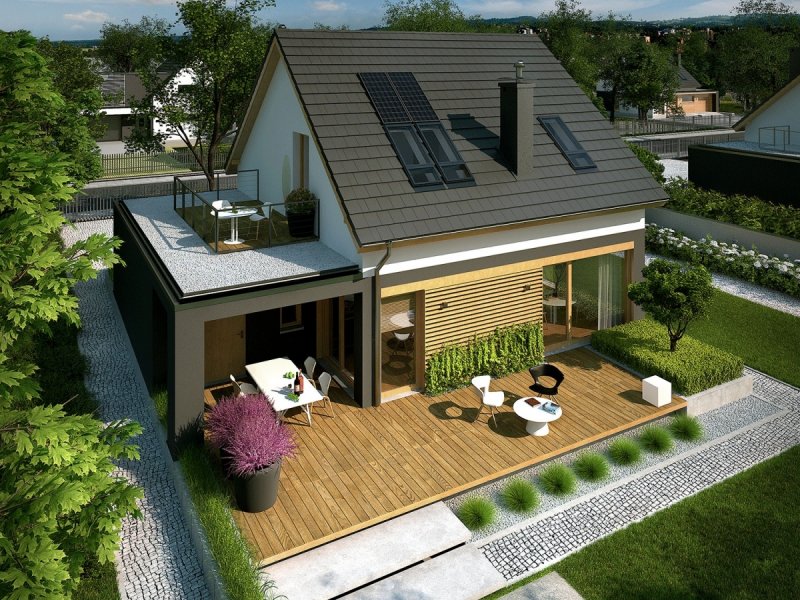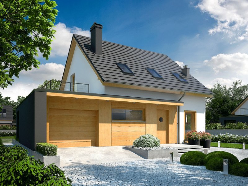 Dom E14 G1 ECONOMIC to przytulna wygoda w nowoczesnym wydaniu. Architektura budynku dekoruje otoczenie, a modne zestawienie bieli, szarości i drewna stanowi doskonałe dopełnienie formy. Dom czytelnie podzielono na strefy, zapewniając domownikom codzienny komfort. Uwagę zwracają atrakcyjne tarasy, będące naturalnym przedłużeniem salonu i jadalni. Pomysłowe wykorzystanie przestrzeni nad garażem, pozwoliło zaaranżować dodatkową strefę rekreacyjną na poziomie poddasza, dzięki której rodzina może podziwiać piękno okolicy i delektować się widokiem zachodzącego słońca.