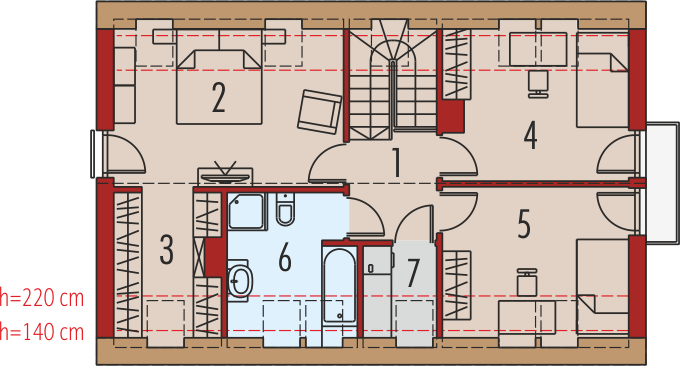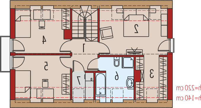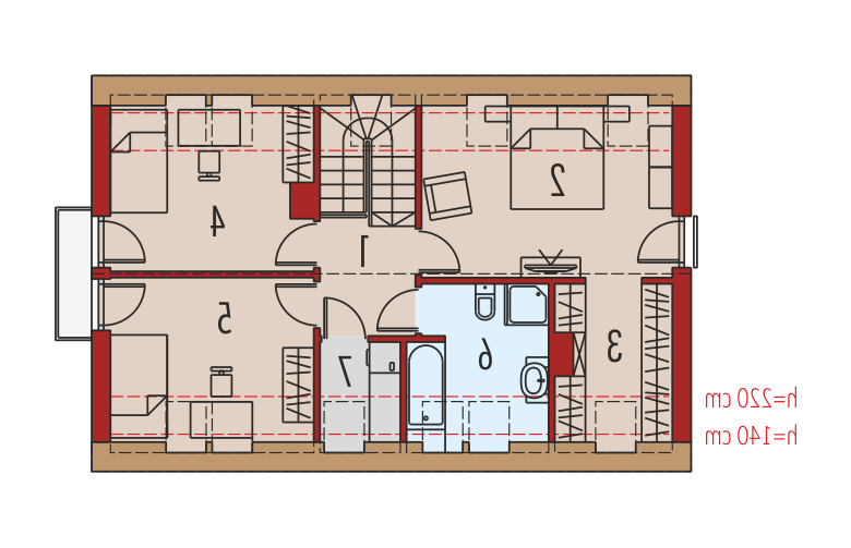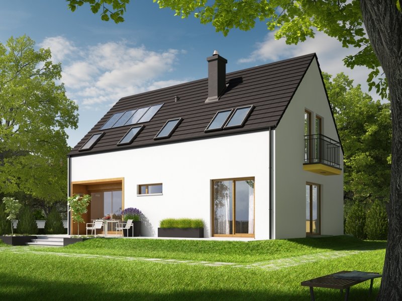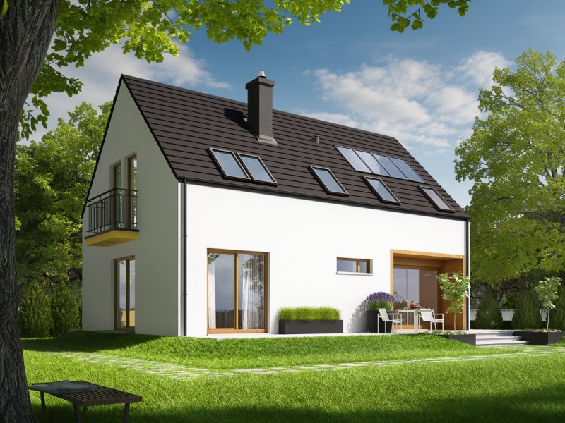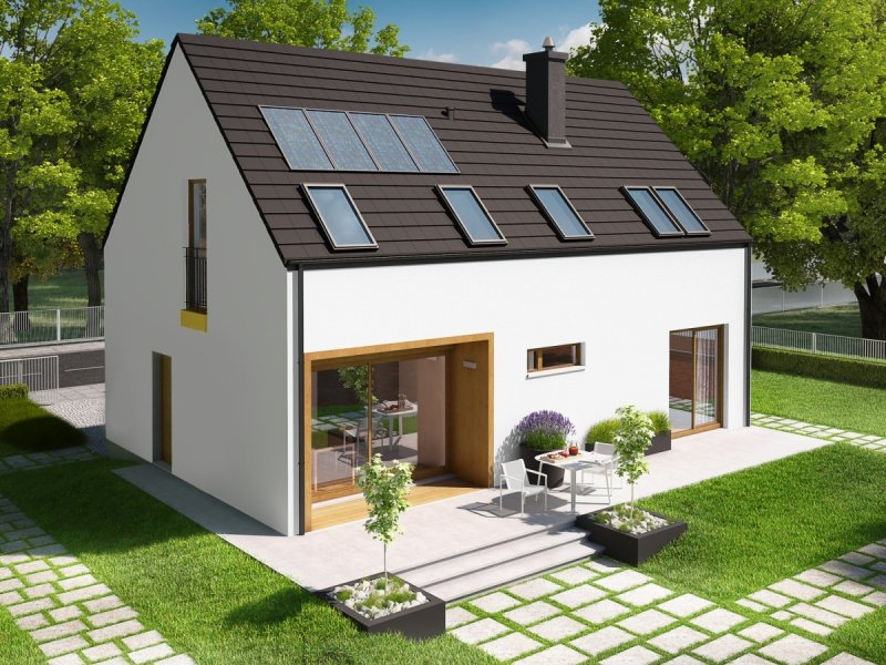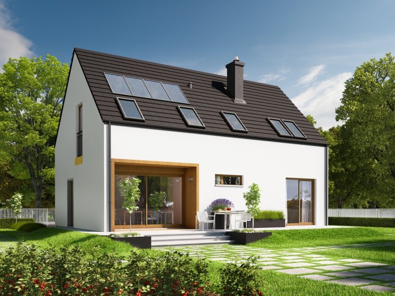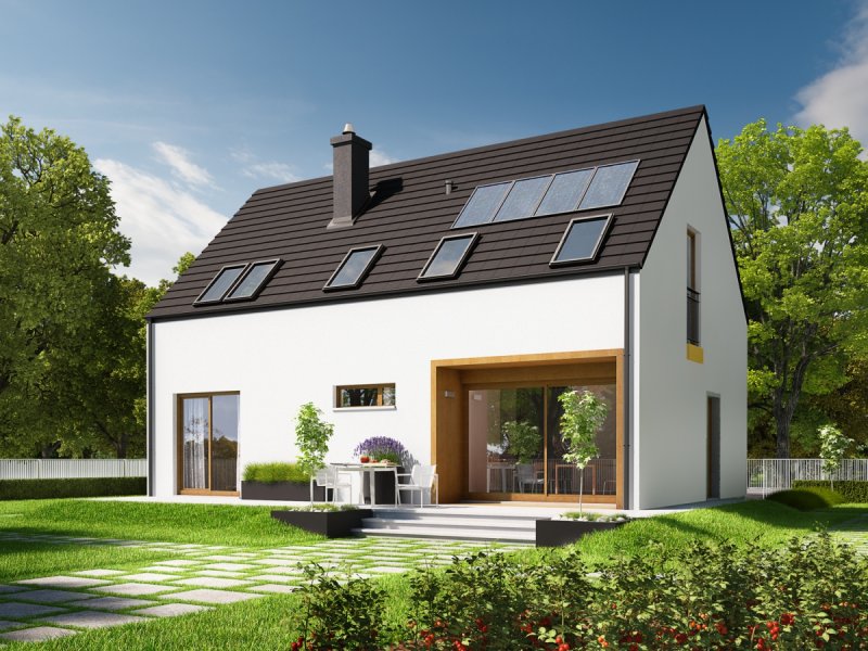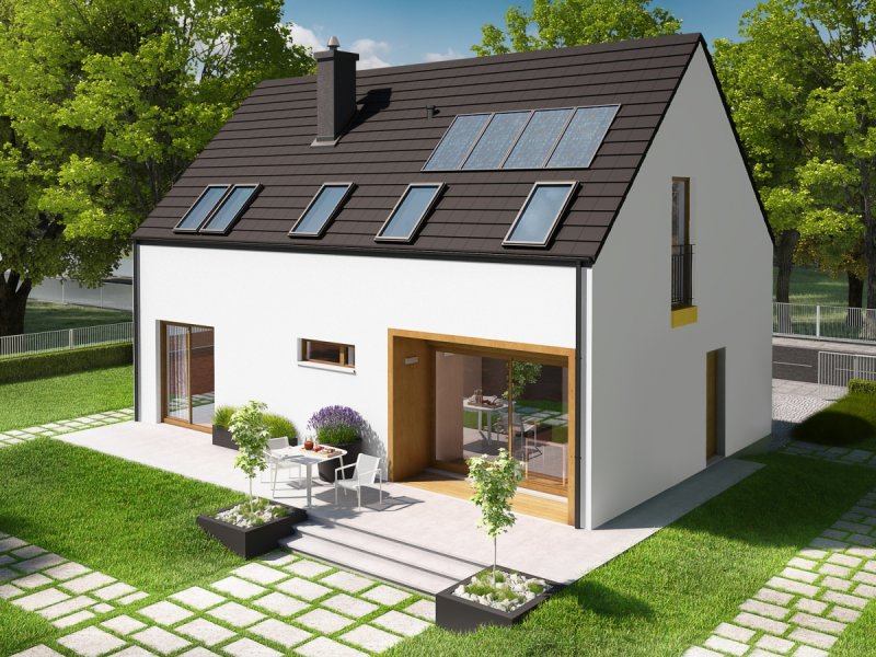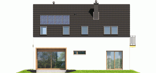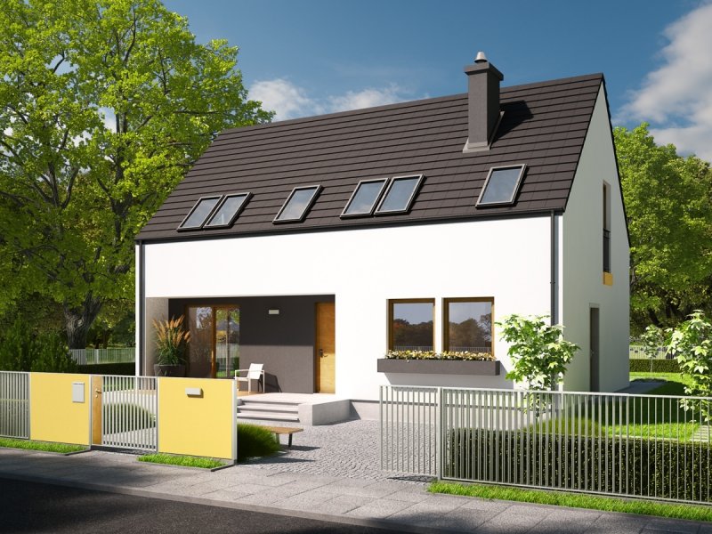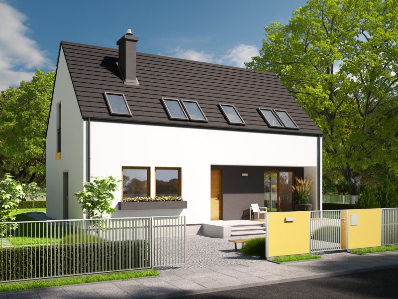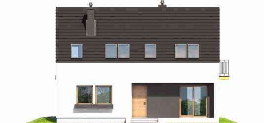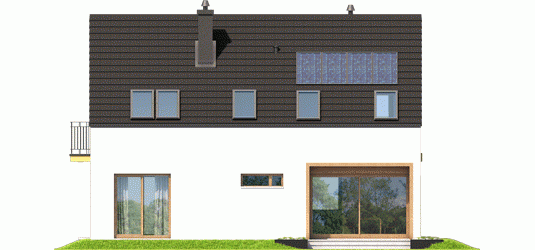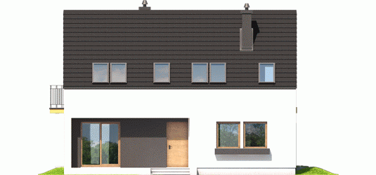 Dom parterowy z poddaszem użytkowym, niepodpiwniczony, przeznaczony dla 4-5 osobowej rodziny. Pięknie przeszklona jadalnia usytuowana w pobliżu kuchni, wydzielony salon z kominkiem oraz mała toaleta tworzą strefę dzienną domu. Znajduje się tu również miejsce na szafy w strefie wejściowej i duże pomieszczenie gospodarcze dostępne ze strefy mieszkalnej i z zewnątrz budynku. Wejście do domu oraz wyjście na taras przy jadalni jest zadaszone. Na poddaszu mieszczą się dwie sypialnie dla dzieci oraz wygodna sypialnia rodziców z garderobą, łazienka i pralnia. Dom E2 ECONOMIC (wersja A) został zaprojektowany w duchu energooszczędności. Zwarta bryła, prosty, dwuspadowy dach oraz optymalnie zaplanowane przeszklenia sprawiają, że budynek jest ekonomiczny w realizacji i późniejszej eksploatacji. Atrakcyjnym elementem domu jest ciekawy podcień, który zdobi elewację, tworząc jednocześnie czarujące połączenie jadalni z ogrodem. Wygodny układ funkcjonalny z czytelnym podziałem na strefy spełni oczekiwania nawet najbardziej wymagających inwestorów. Kolekcja ECONOMIC – domy ładne i tanie w budowie Kolekcja ECONOMIC została zaprojektowana z troską o ekonomiczny charakter budowy. Prosta bryła, ograniczona ilość detali architektonicznych oraz zminimalizowana liczba pionów instalacyjnych sprawia, że domy z Kolekcji ECONOMIC są tanie w realizacji i późniejszej eksploatacji. Atuty Kolekcji ECONOMIC • Prosta konstrukcja domu – niskie koszty budowy • Standardowe wymiary stolarki okiennej – najtańsze rozwiązania profili okiennych • Brak okrągłych okien, rozbudowanych przeszkleń i rolet • Nowoczesna interpretacja klasycznej bryły domu • Optymalny układ funkcjonalny • Idealne proporcje budynku – atrakcyjny efekt estetyczny • Czysta forma bez zbędnych detali Istnieje możliwość: - podpiwniczenia budynku