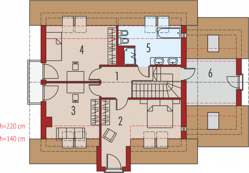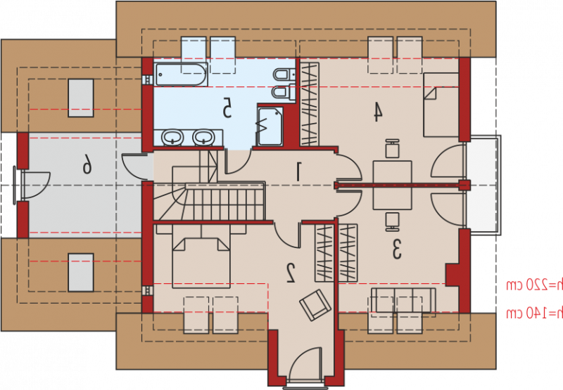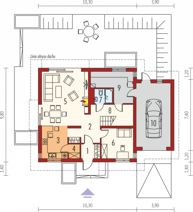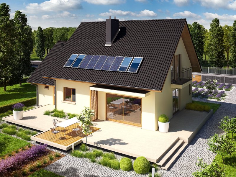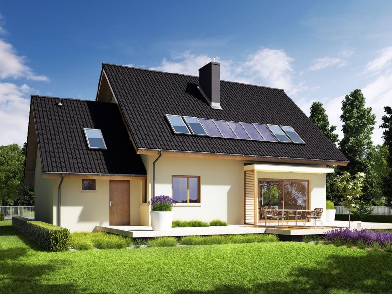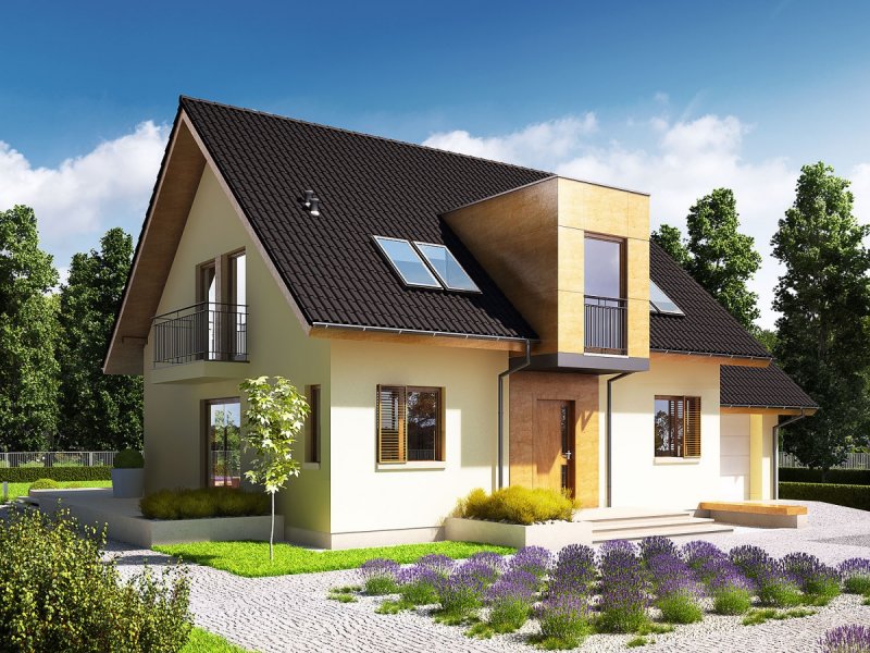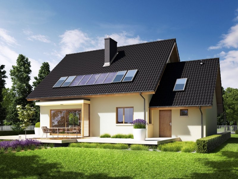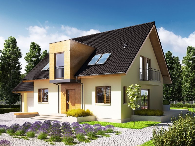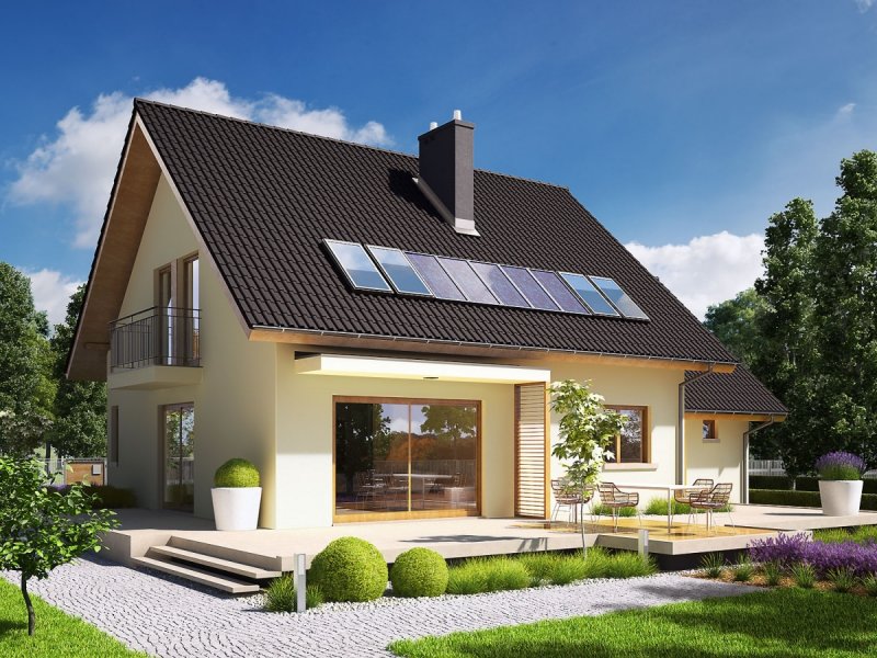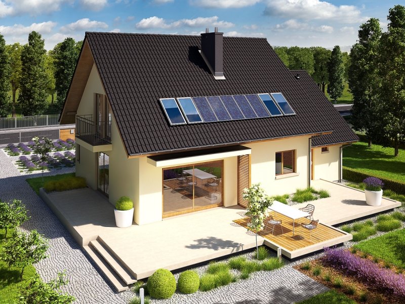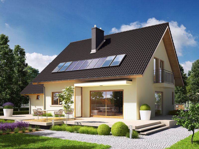 Dom parterowy z poddaszem użytkowym, z garażem jednostanowiskowym, niepodpiwniczony, przeznaczony dla 3-5 osobowej rodziny. Otwartą strefę dzienną na parterze tworzy salon z kominkiem, połączony z jadalnią i otwartą kuchnią, spiżarnia, gabinet i mała łazienka. Na parterze znajduje się również kotłownia i garaż. Na poddaszu zaplanowano strefę nocną z trzema sypialniami i wygodną łazienką. Przestrzeń nad garażem wykorzystano jako strych, ale może pełnić również funkcje dodatkowego pokoju. E5 ECONOMIC to doskonała propozycja dla inwestorów, którzy cenią architekturę w służbie funkcjonalności. Przemyślany układ pomieszczeń z czytelnym podziałem na strefy, pozwala domownikom cieszyć się najwyższym komfortem użytkowym. Atrakcyjną częścią domu jest przestronny taras, który powiększa zasięg strefy wypoczynkowej, tworząc idealne miejsce na relaks i zabawę w towarzystwie rodziny, przyjaciół i kojącej zieleni ogrodu. Na szczególną uwagę zasługuje również interesujący wykusz, w którym zaplanowano kameralną sypialnię rodziców. Kolekcja ECONOMIC - domy ładne i tanie w budowie Kolekcja ECONOMIC została zaprojektowana z troską o ekonomiczny charakter budowy. Prosta bryła, ograniczona ilość detali architektonicznych oraz zminimalizowana liczba pionów instalacyjnych sprawia, że domy z Kolekcji ECONOMIC są tanie w realizacji i późniejszej eksploatacji. Atuty Kolekcji ECONOMIC • Prosta konstrukcja domu – niskie koszty budowy • Standardowe wymiary stolarki okiennej – najtańsze rozwiązania profili okiennych • Brak okrągłych okien, rozbudowanych przeszkleń i rolet • Nowoczesna interpretacja klasycznej bryły domu • Optymalny układ funkcjonalny • Idealne proporcje budynku – atrakcyjny efekt estetyczny • Czysta forma bez zbędnych detali Istnieje możliwość: - podpiwniczenia budynku - zbliźniaczenia