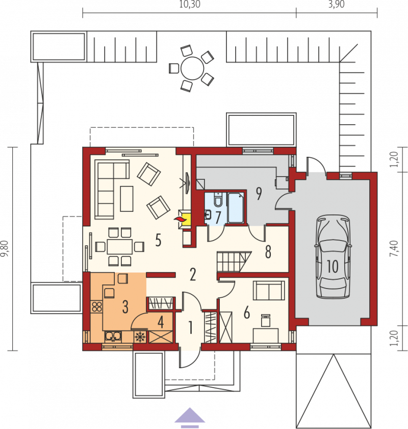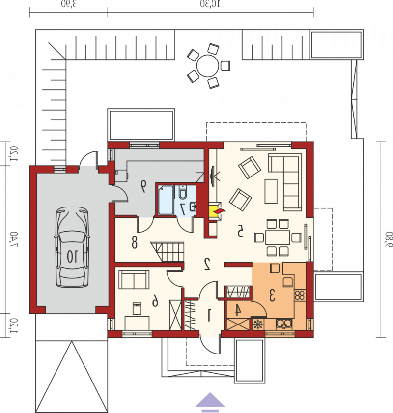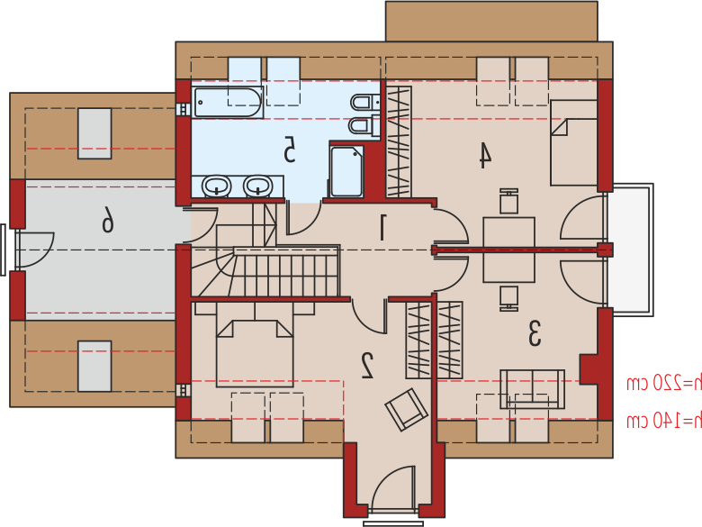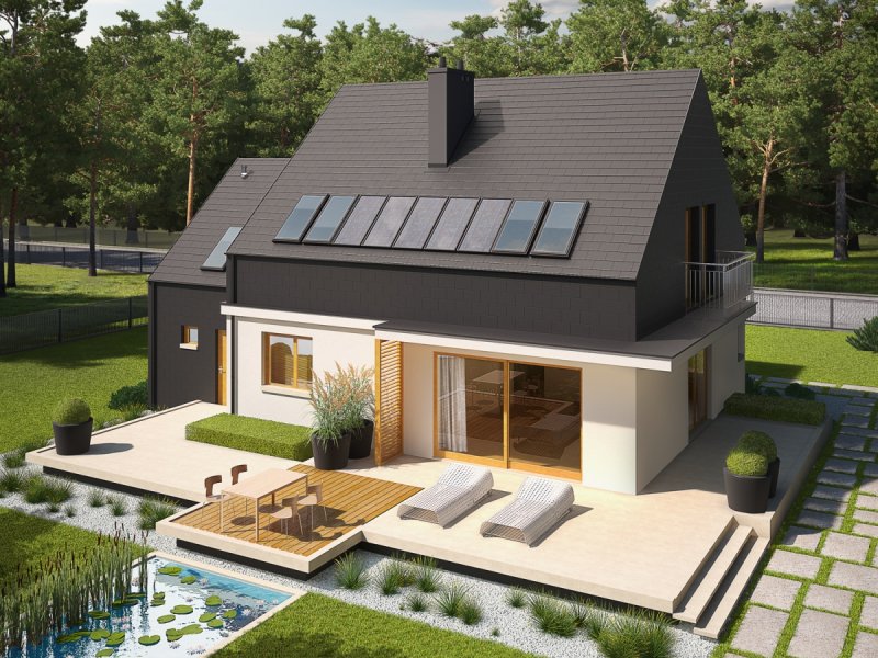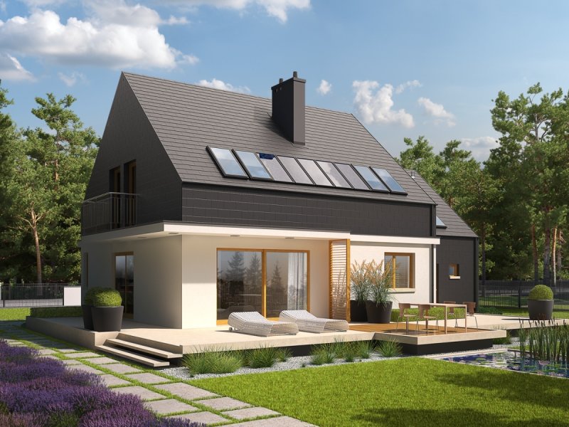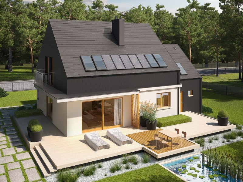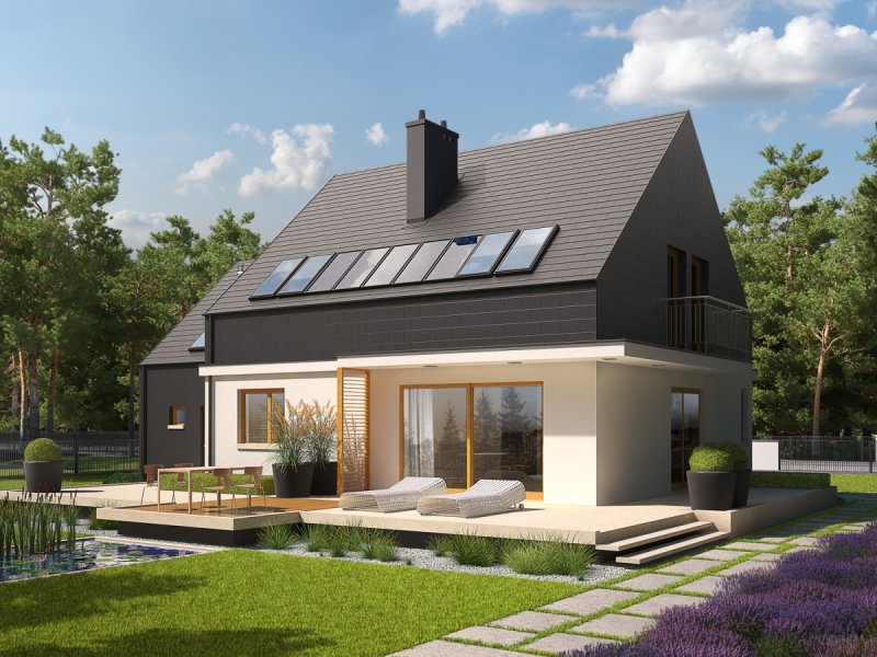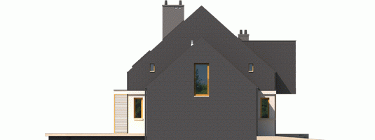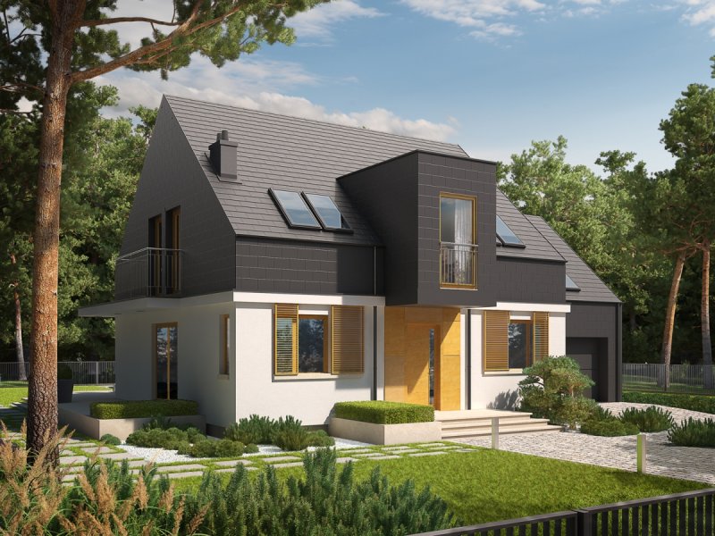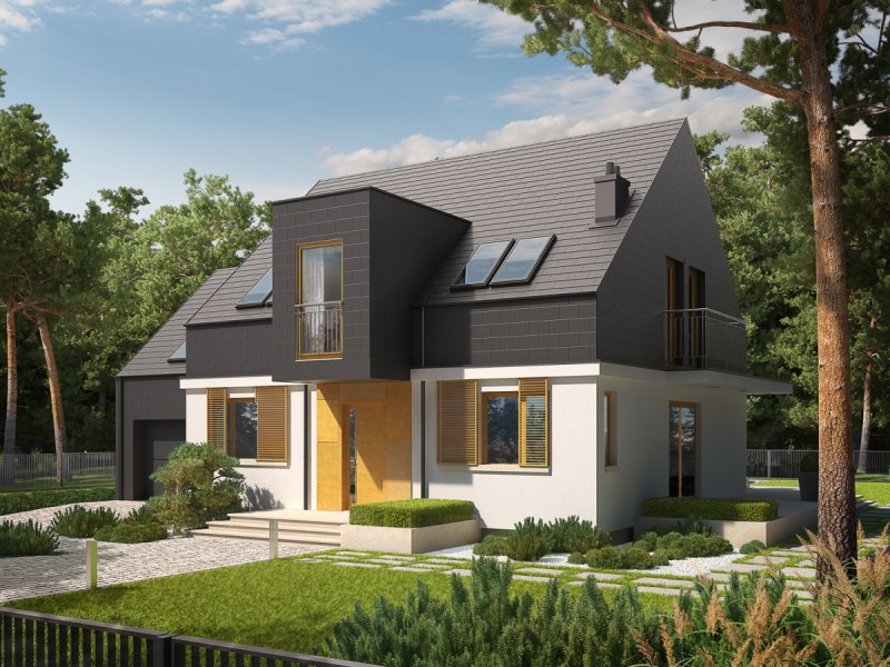 Dom parterowy z poddaszem użytkowym, z garażem jednostanowiskowym, niepodpiwniczony, przeznaczony dla 3-5 osobowej rodziny. Wygodną strefę dzienną na parterze tworzy salon z kominkiem, połączony z jadalnią i otwartą kuchnią, spiżarnia, gabinet i mała łazienka. Na parterze znajduje się również kotłownia i garaż. Na poddaszu zaplanowano strefę nocną z trzema sypialniami i wygodną łazienką. E5 G1 ECONOMIC (wersja B) to propozycja dla miłośników nowoczesnej elegancji. Frontową część budynku wzbogaca ciekawy wykusz, który jednocześnie stanowi zadaszenie strefy wejściowej. Od strony ogrodowej zaplanowano obszerny taras, który tworzy komfortowe przedłużenie salonu. Budynek imponuje swoim oryginalnym wyglądem zewnętrznym – atrakcyjna szata z łupka koresponduje z najnowszymi trendami w architekturze i sprawia, że dom prezentuje się zjawiskowo i intrygująco. Układ funkcjonalny z czytelnym podziałem na strefy, stworzy harmonię z rytmem życia każdej rodziny, elastycznie dopasowując się do potrzeb i oczekiwań domowników. Kolekcja ECONOMIC - domy ładne i tanie w budowie Kolekcja ECONOMIC została zaprojektowana z troską o ekonomiczny charakter budowy. Prosta bryła, ograniczona ilość detali architektonicznych oraz zminimalizowana liczba pionów instalacyjnych sprawia, że domy z Kolekcji ECONOMIC są tanie w realizacji i późniejszej eksploatacji. Atuty Kolekcji ECONOMIC • Prosta konstrukcja domu – niskie koszty budowy • Standardowe wymiary stolarki okiennej – najtańsze rozwiązania profili okiennych • Brak okrągłych okien, rozbudowanych przeszkleń i rolet • Nowoczesna interpretacja klasycznej bryły domu • Optymalny układ funkcjonalny • Idealne proporcje budynku – atrakcyjny efekt estetyczny • Czysta forma bez zbędnych detali Istnieje możliwość: - podpiwniczenia budynku - zbliźniaczenia