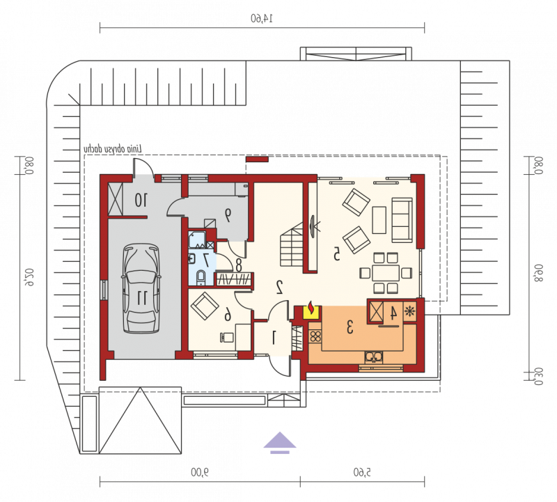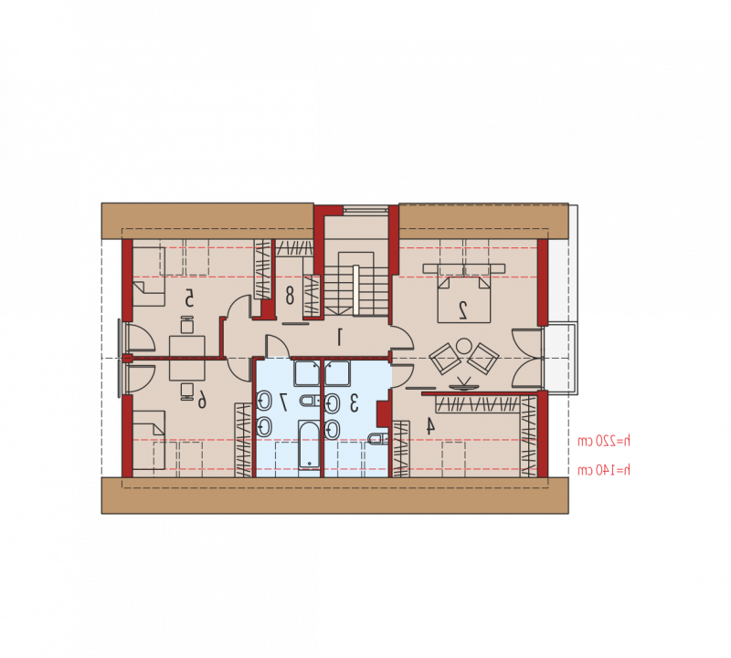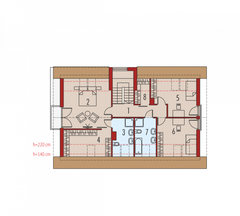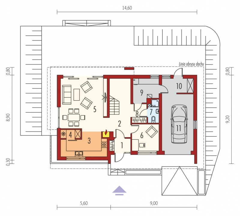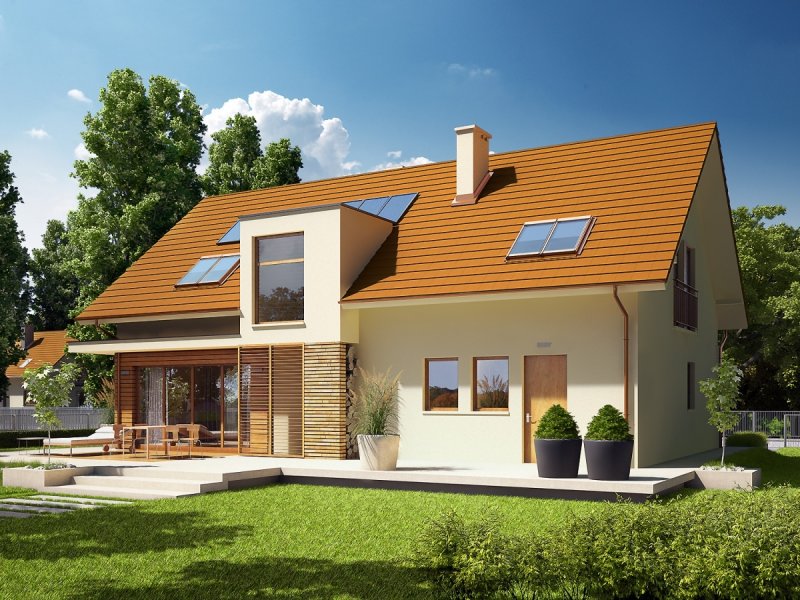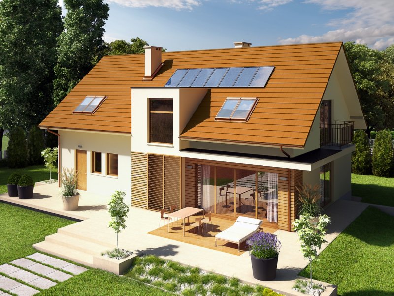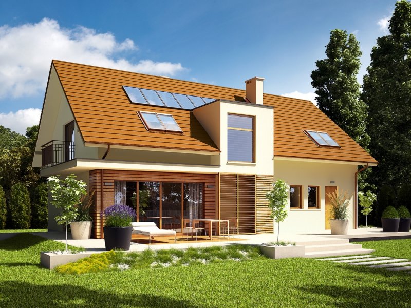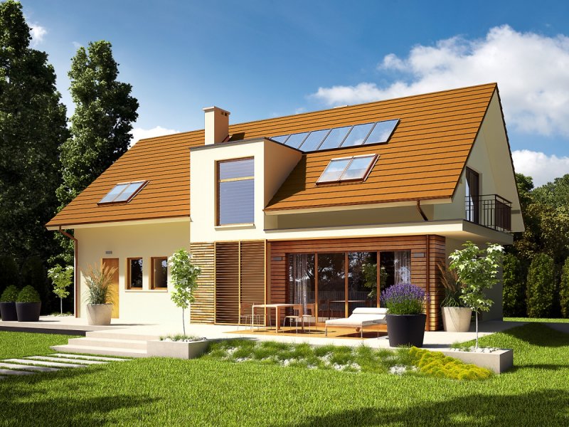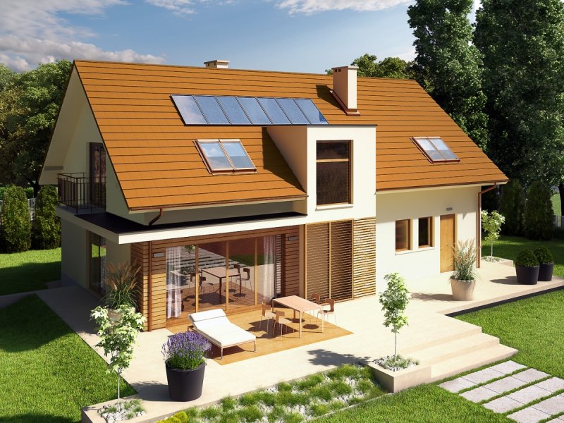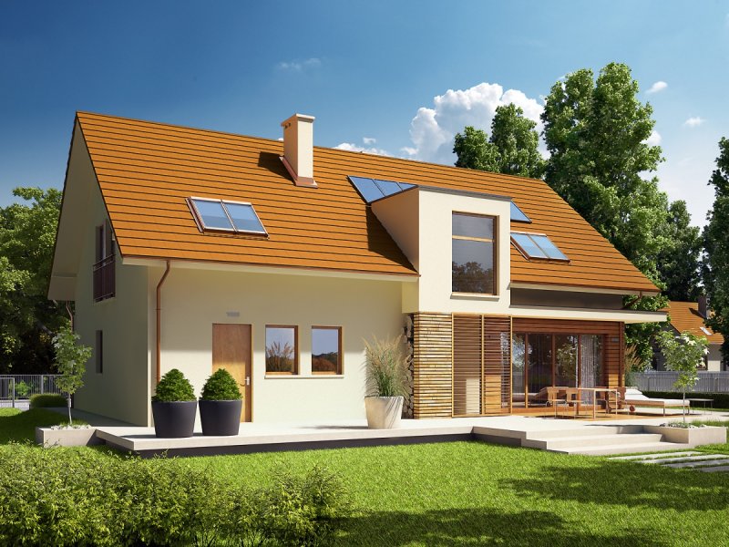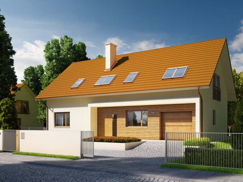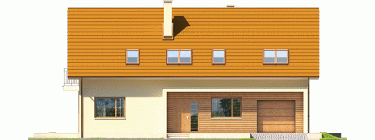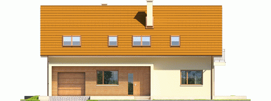 Dom parterowy z poddaszem użytkowym, z garażem jednostanowiskowym, niepodpiwniczony, przeznaczony dla 3-4 osobowej rodziny. Strefę dzienną tworzy wygodna kuchnia ze spiżarnią, częściowo połączona z jadalnią i pokojem dziennym, a także gabinet oraz łazienka. Na parterze znajduje się również kotłownia, pomieszczenie gospodarcze i garaż. Strefa nocna mieści się na poddaszu, w jej skład wchodzą: duża sypialnia z przestronną garderobą i własną łazienką oraz dwie sypialnie, odrębna garderoba i łazienka. Dom E6 G1 ECONOMIC (wersja B) to wyborna propozycja dla miłośników intrygującej architektury. Od strony frontowej budynek zdobi reprezentacyjna strefa wejściowa, wyróżniona naturalnym drewnem. Elewacja ogrodowa została wzbogacona ciekawym wykuszem, pod którym pomysłowo zaplanowano składzik na drewno oraz przesuwną żaluzję, która chroni domowników przed nadmiernym nasłonecznieniem. Na szczególną uwagę zasługują duże przeszklenia, dzięki którym salon harmonijnie łączy się z przestrzenią tarasu, poszerzając swoją powierzchnię o dodatkową, atrakcyjną strefę wypoczynkową na świeżym powietrzu. Przytulny charakter domu akcentuje elewacja utrzymana w subtelnej, brzoskwiniowej tonacji. Kolekcja ECONOMIC - domy ładne i tanie w budowie Kolekcja ECONOMIC została zaprojektowana z troską o ekonomiczny charakter budowy. Prosta bryła, ograniczona ilość detali architektonicznych oraz zminimalizowana liczba pionów instalacyjnych sprawia, że domy z Kolekcji ECONOMIC są tanie w realizacji i późniejszej eksploatacji. Atuty Kolekcji ECONOMIC • Prosta konstrukcja domu – niskie koszty budowy • Standardowe wymiary stolarki okiennej – najtańsze rozwiązania profili okiennych • Brak okrągłych okien, rozbudowanych przeszkleń i rolet • Nowoczesna interpretacja klasycznej bryły domu • Optymalny układ funkcjonalny • Idealne proporcje budynku – atrakcyjny efekt estetyczny • Czysta forma bez zbędnych detali Istnieje możliwość: - podpiwniczenia budynku