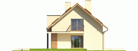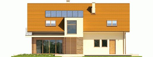 Dom zaprojektowany w technologii murowej ze stropem gęstożebrowym. Schody wewnętrzne drewniane. Dach o konstrukcji drewnianej pokryty dachówką płaską lub inną o podobnych parametrach. Elewacje wykończono tynkiem mineralnym w kolorze TO-PA007 z palety firmy Termo Organika i okładziną drewnianą. Cokoły kamienne lub wykończone tynkiem. Stolarka okienna drewniana lub PCV.