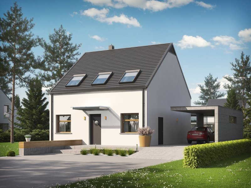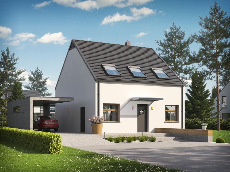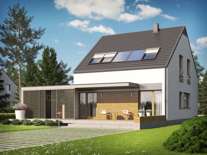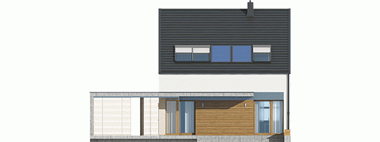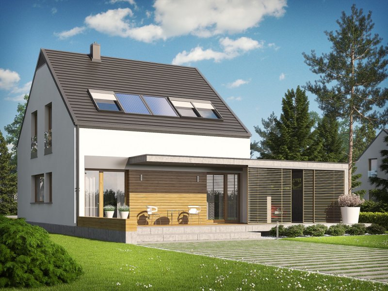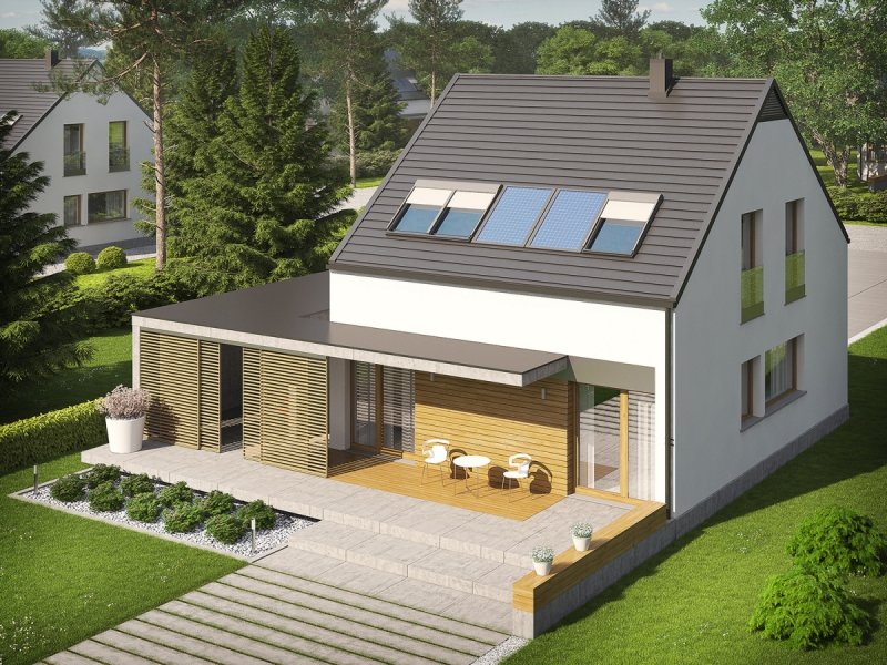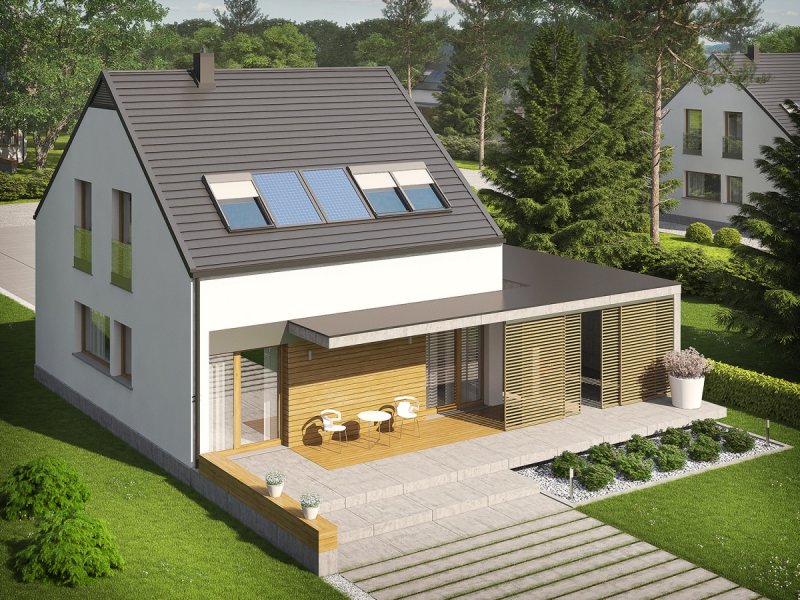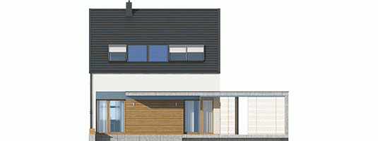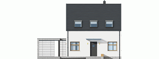 Dom E8 ENERGO PLUS to przykład nowoczesnej architektury w służbie energooszczędności. Optymalna bryła, właściwa izolacja i odpowiedni dobór instalacji sprawiają, że budynek wyróżniają znakomite parametry cieplne. Dzięki perfekcyjnie rozplanowanym przeszkleniom dom maksymalnie wykorzystuje naturalną energię słoneczną i cieszy domowników przytulnym urokiem wnętrza. Układ funkcjonalny z czytelnym podziałem stref zaprojektowano z troską o ergonomię i najwyższy komfort użytkowy. Ciekawym elementem budynku jest wiata, modnie wykończona drewnem, która oprócz swojej funkcji garażowej, spełnia się również jako intrygująca dekoracja.