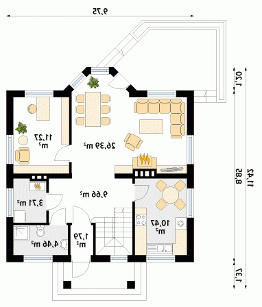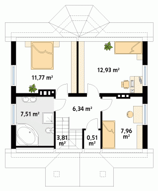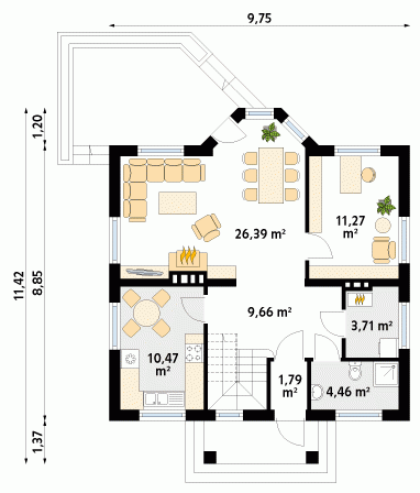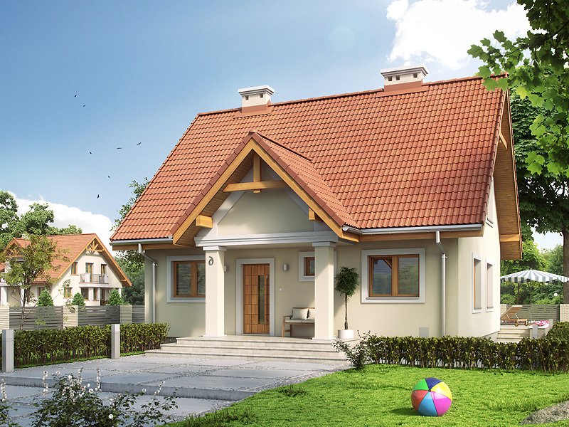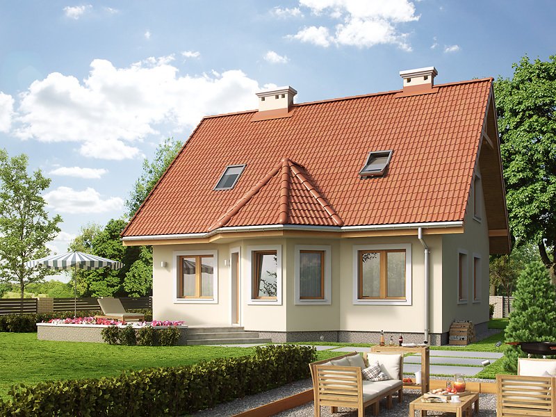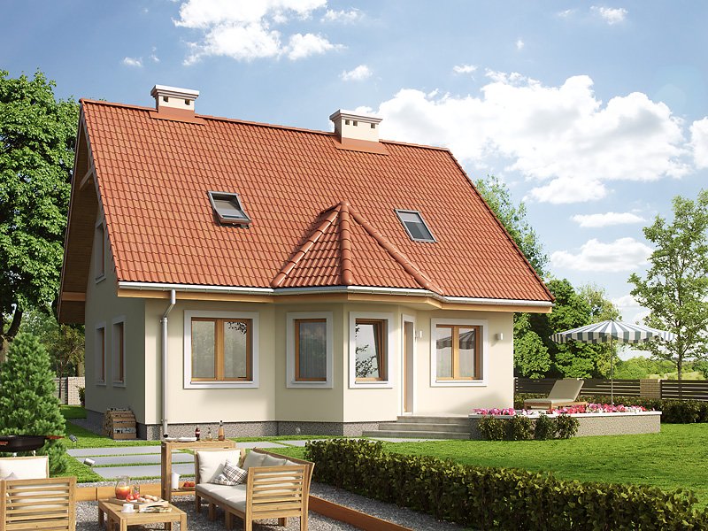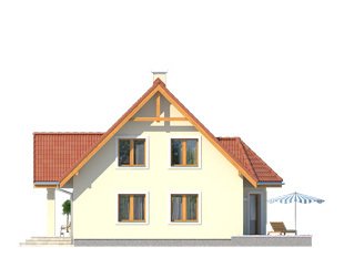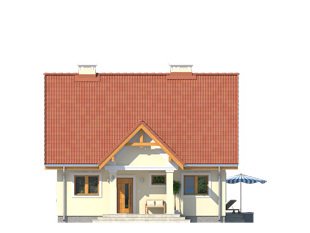 Dom jednorodzinny, wolno stojący, parterowy z użytkowym poddaszem, niepodpiwniczony. Dom o zwartej bryle, niewymagający dużej działki. Pomimo niewielkich gabarytów zapewnia dobre warunki mieszkalne 4 – 5-osobowej rodzinie. Dach ukształtowany tradycyjnie z klasycznie zaakcentowanym wejściem.