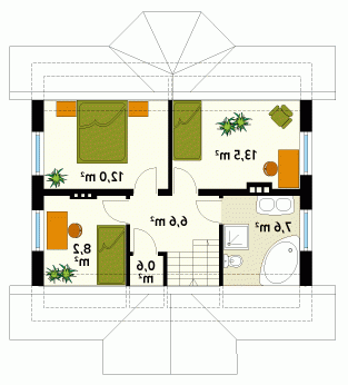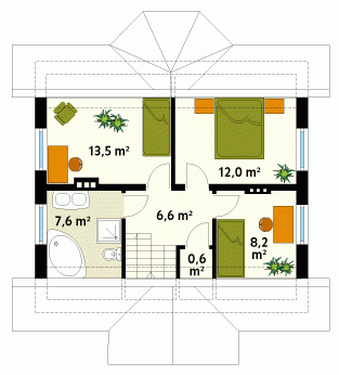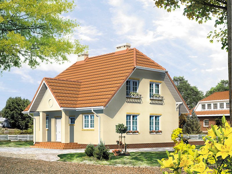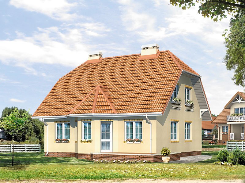 Dom jednorodzinny, wolno stojący, parterowy, z użytkowym poddaszem, niepodpiwniczony. Budynek o zwartej bryle, nie wymagający dużej działki. Pomimo niewielkich gabarytów zapewnia dobre warunki 4 – 5-osobowej rodzinie. Dach ukształtowany tradycyjnie z klasycznie zaakcentowanym wejściem.