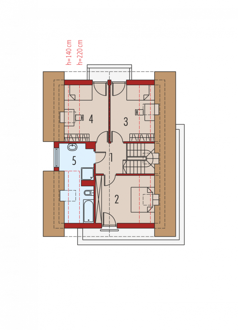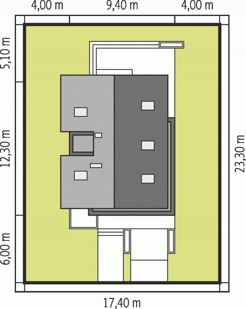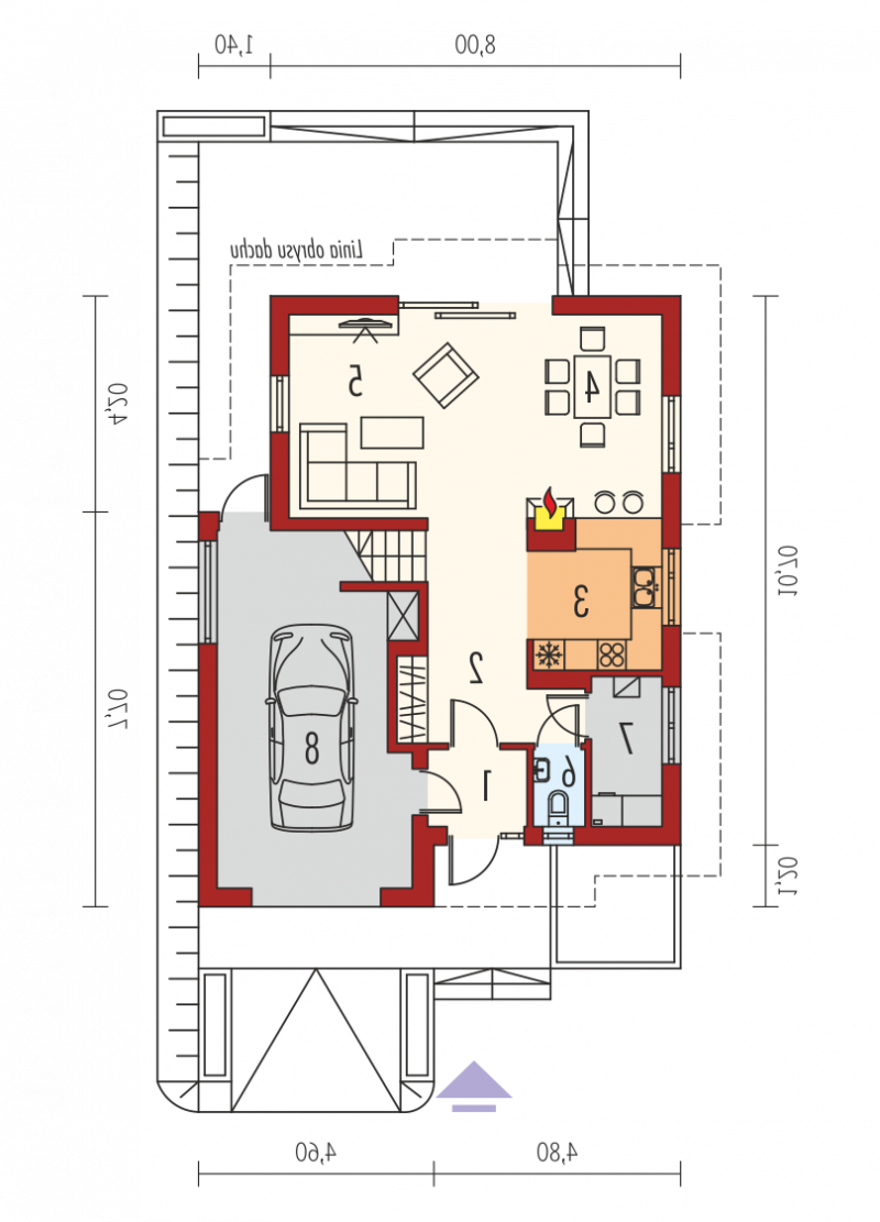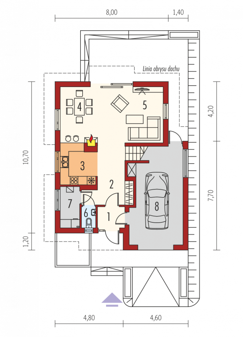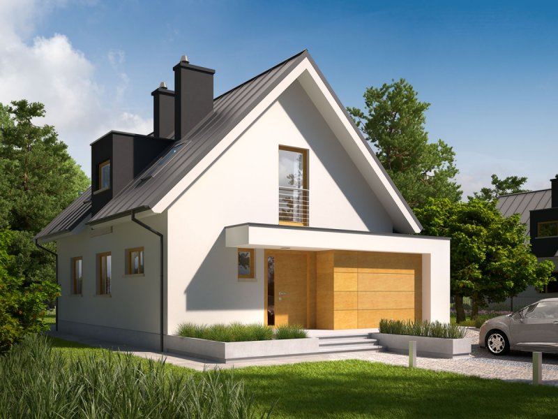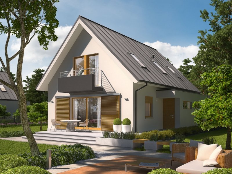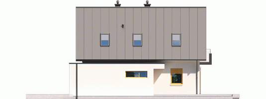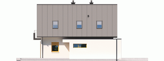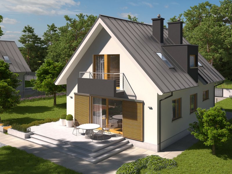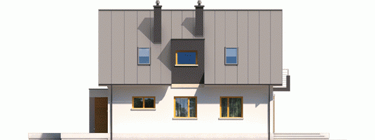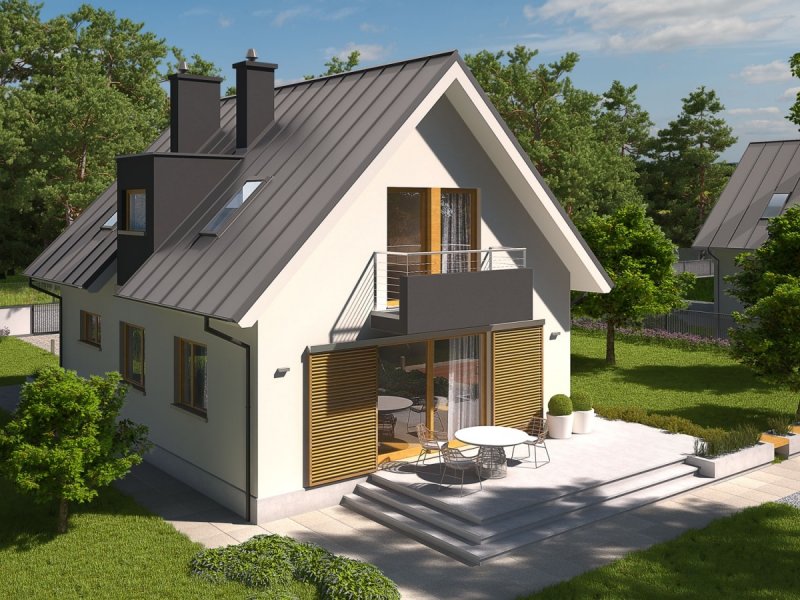 Dom parterowy z poddaszem użytkowym, z garażem jednostanowiskowym, niepodpiwniczony, przeznaczony dla 3-4 osobowej rodziny. Strefa dzienna zaprojektowana została na parterze, tworzy ją salon z kominkiem, jadalnia oraz otwarta kuchnia. Znajduje się tu również mała łazienka, kotłownia i garaż. Na poddaszu zaplanowano strefę nocną z trzema sypialniami i wygodną łazienką. Dom Eliot G1 to kwintesencja nowoczesnego stylu i funkcjonalnych rozwiązań. Zwarta bryła budynku sprzyja energooszczędności, a ergonomiczny układ pomieszczeń maksymalnie wykorzystuje przestrzeń użytkową. W trosce o codzienny komfort domowników, zadbano o maksymalne doświetlenie wnętrz – na szczególną uwagę zasługuje duże przeszklenie salonu, które zaprasza do środka dobrą, zieloną energię ogrodu i poszerza strefę wypoczynkową o imponującą przestrzeń tarasu. Architektura budynku została wzbogacona o ciekawe detale, m.in. drewniane, przesuwne żaluzje, które stanowią atrakcyjną dekorację elewacji ogrodowej, a przede wszystkim chronią mieszkańców przed nadmiernym nasłonecznieniem. Oryginalny wygląd zewnętrzny budynku akcentują również oryginalne zadaszenia i szykowna elewacja, nadająca całości klimat przytulnej elegancji. Istnieje możliwość: - podpiwniczenia budynku - zbliźniaczenia