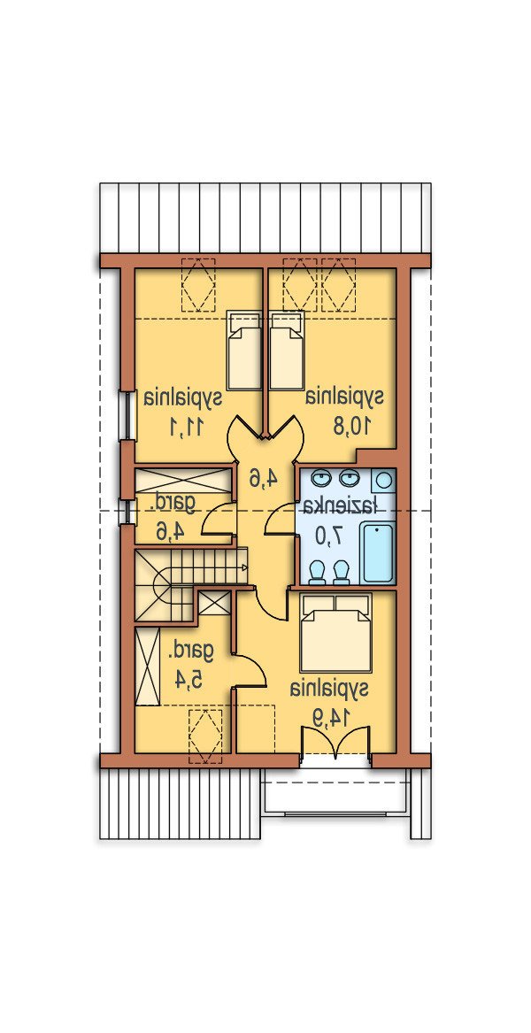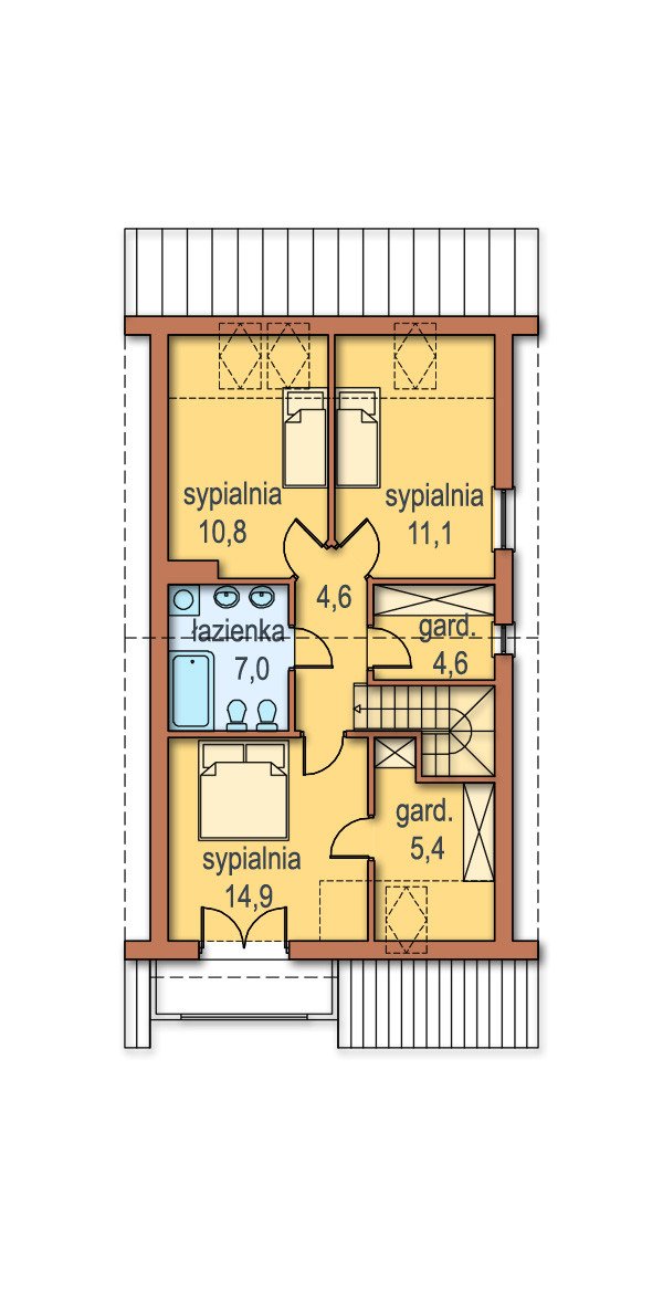 Na poddaszu zlokalizowano: hall, obszerną sypialnię rodziców z garderobą i tarasem, garderobę ogólnodostępna, łazienkę i dwie dodatkowe sypialnie. W szczycie można wygospodarować dodatkowe pomieszczenie gospodarcze– strych.