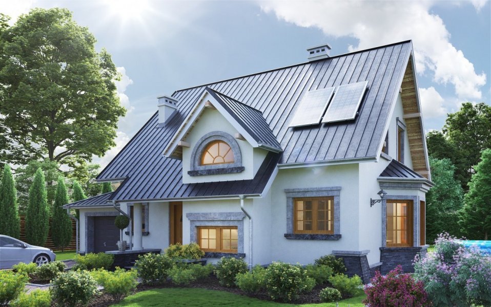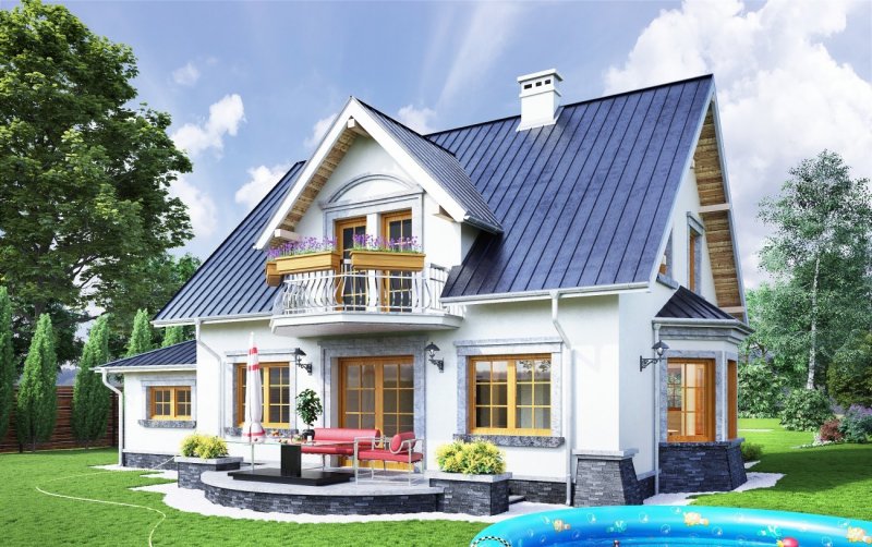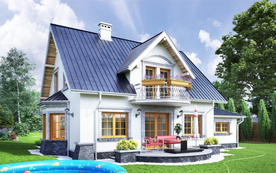 Fantazyjny ryzalit z jadalnią na planie fragmentu ośmiokąta w projekcie domu Estera Lux ma także wiele innych propozycji niewielkich domów parterowych z użytkowym poddaszem i dostawionym garażem (np. z rodzin: Cesty, Heleny czy Dymszy). W Esterze ryzalit z daszkiem leży na osi symetrii bocznej elewacji i na zamknięciu wewnętrznej ściany nośnej dzielącej parter na połowy. Salon z dodatkowym pokojem znalazł się od ogrodu, a od frontu kuchnia sąsiaduje bezpośrednio ze schodami. Schowek pod podestem sugeruje możliwość podpiwniczenia. Połączenie z położonym nieco niżej garażem stanowi przechodnia kotłownia przy sieni. Przestrzeń pod dwuspadowym dachem z kalenicą równoległą do drogi dojazdowej w projekcie domu Estera Lux to nad główną częścią budynku cztery wygodne pokoje i zgrabny przedpokój z łazienką. Piąta, główna sypialnia z garderobą znalazła się niżej, nad garażem. Ryzalit klatki schodowej z przedłużeniem okapu obejmującym taras wejściowy akcentuje od frontu lukarna z półkolistym oknem doświetlającym schody, a elewację ogrodową - balkon z lukarną. Rozwiązanie bez wykorzystania poddasza nad garażem i inną konstrukcję muru zewnętrznego oferuje Estera.