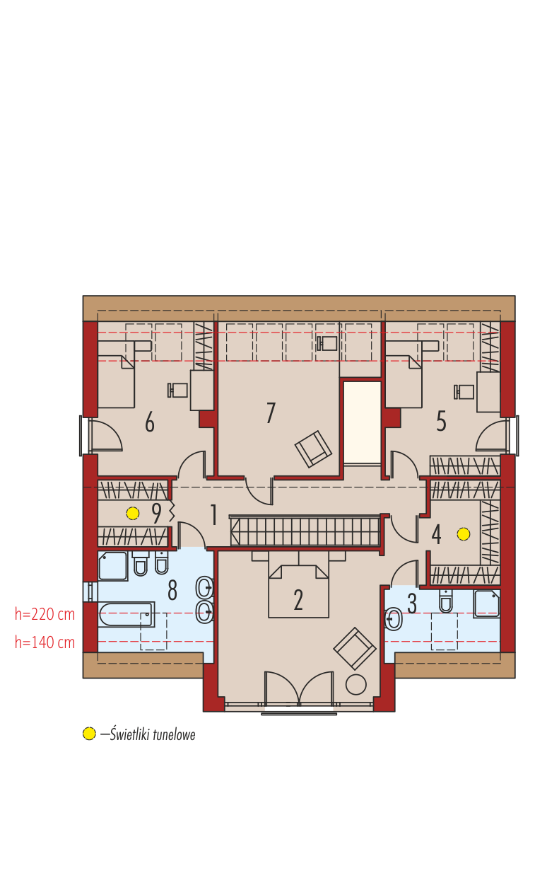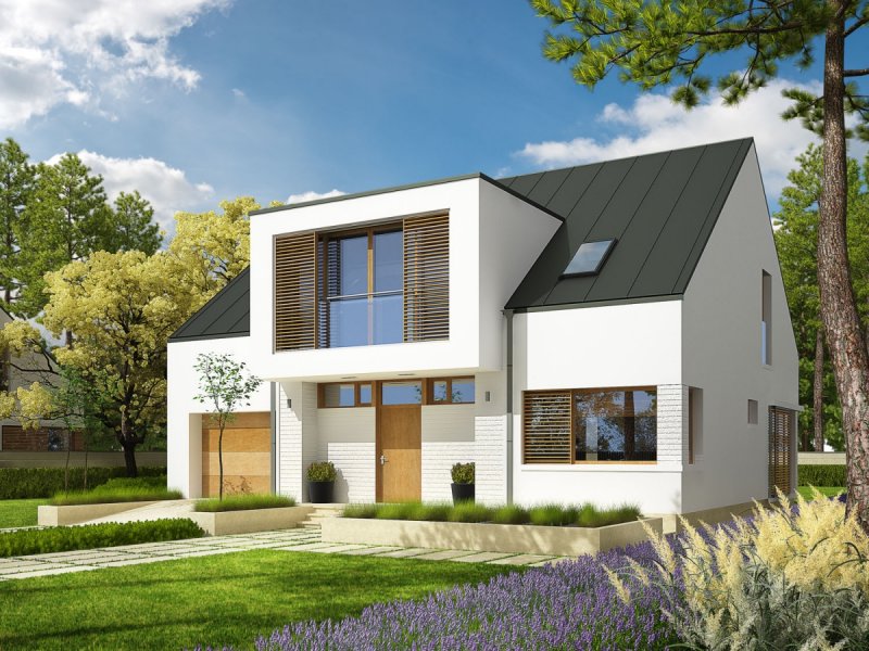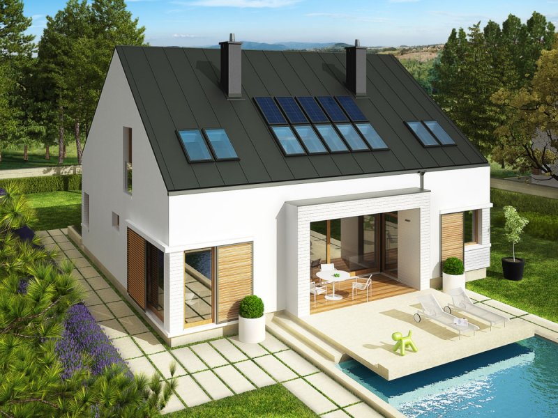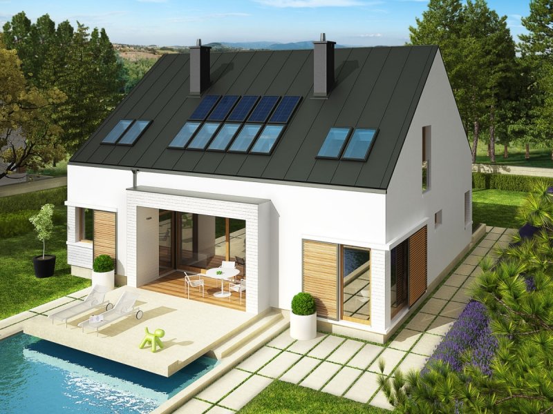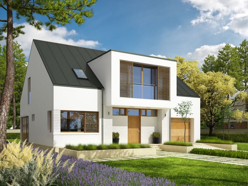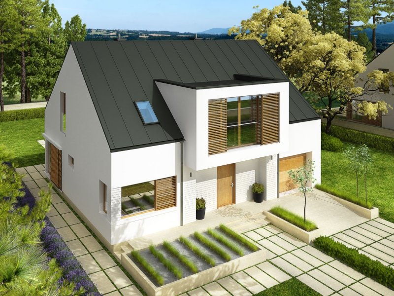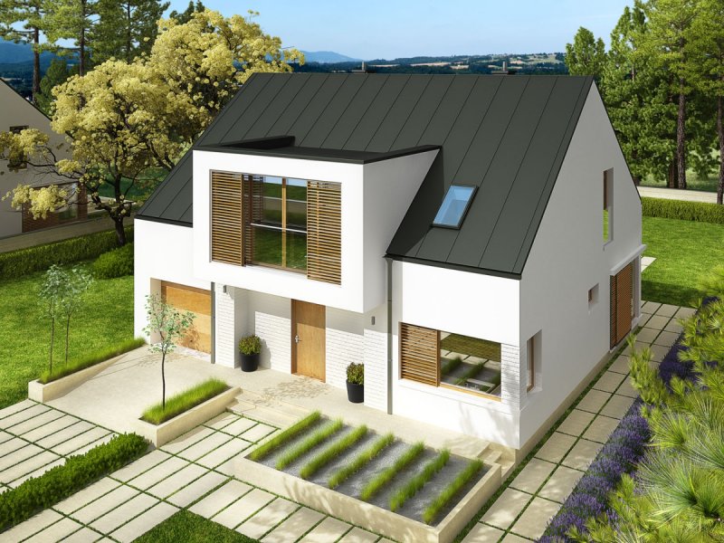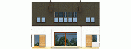 Dom z poddaszem użytkowym, niepodpiwniczony. Przeznaczony dla 4-5-osobowej rodziny. W strefie dziennej zaplanowano salon, wygodną jadalnię oraz kuchnię ze spiżarnią. Znalazły się tu również – łazienka oraz bardzo duże pomieszczenie gospodarcze. Strefę nocną tworzą trzy sypialnie, w tym jedna z własną garderobą i łazienką. Znajduje się tu także bardzo dobrze doświetlone pomieszczenie, które w zależności od potrzeb i wizji domowników można przeznaczyć na komfortową pracownię lub wygodną sypialnię. Dodatkowo, zaplanowano komfortową łazienkę oraz garderobę. Budynek zaprojektowano jako wysokoenergooszczędny, wyposażony w wentylację mechaniczną z rekuperacją. W projekcie przewidziano również gruntową pompę ciepła oraz system solarny. Istnieje możliwość wykonania świetlików tunelowych, doświetlających garderoby na poddaszu. EX9 to nowoczesna propozycja dla koneserów oryginalnych, wysmakowanych połączeń. Frontową część domu wzbogaca ciekawy, okazały wykusz, który osłania strefę wejściową. Od strony ogrodowej EX9 czaruje swoim stylowym tarasem, częściowo zadaszonym i wtopionym w bryłę budynku, a częściowo zawieszonym nad lustrem basenu. Wnętrze domu jest perfekcyjnie rozplanowane – na parterze króluje tempo dnia, na piętrze – rytm nocy. Dzięki dużej ilości okien połaciowych przestrzeń jest maksymalnie doświetlona i przytulna. Elegancki charakter domu podkreśla atrakcyjna kompozycja materiałów, zastosowanych do wykończenia elewacji. W bryłę budynku udało się również zgrabnie wkomponować sporych rozmiarów garaż. EX9 spełnia wysokie wymagania stawiane przez współczesność – łączy ergonomię, energooszczędność oraz komfort użytkowy. Istnieje możliwość: - podpiwniczenia - zbliźniaczenia - wykonania domu dwulokalowego