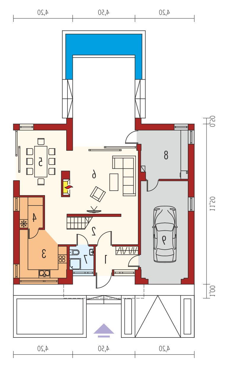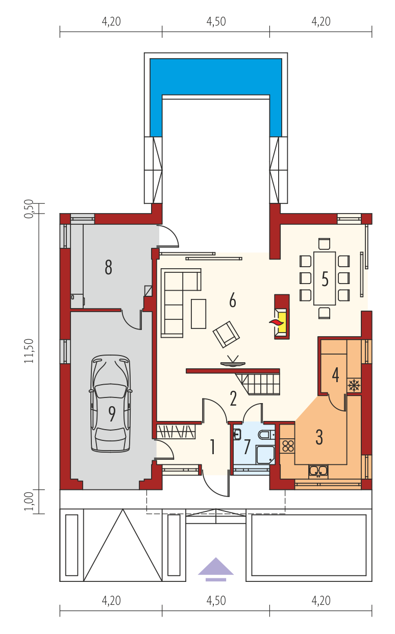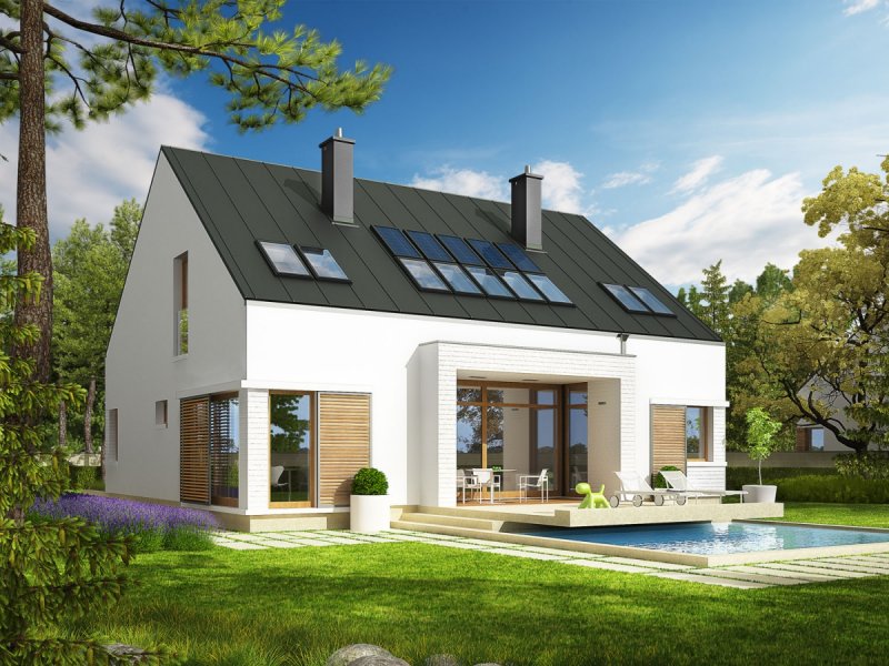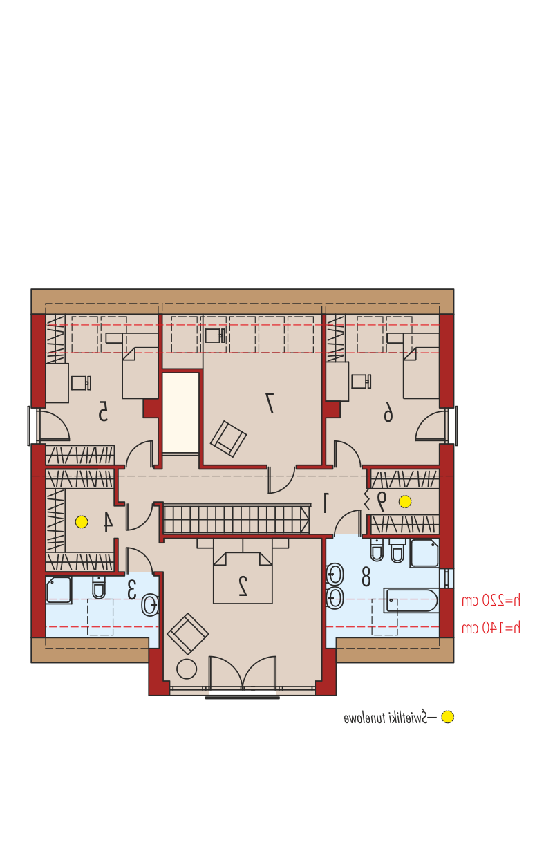 Dom z poddaszem użytkowym, niepodpiwniczony. Przeznaczony dla 4-5-osobowej rodziny. W strefie dziennej zaplanowano salon, wygodną jadalnię oraz kuchnię ze spiżarnią. Znalazły się tu również – łazienka oraz bardzo duże pomieszczenie gospodarcze. Strefę nocną tworzą trzy sypialnie, w tym jedna z własną garderobą i łazienką. Znajduje się tu także bardzo dobrze doświetlone pomieszczenie, które w zależności od potrzeb i wizji domowników można przeznaczyć na komfortową pracownię lub wygodną sypialnię. Dodatkowo, zaplanowano komfortową łazienkę oraz garderobę. Budynek zaprojektowano jako wysokoenergooszczędny, wyposażony w wentylację mechaniczną z rekuperacją. W projekcie przewidziano również gruntową pompę ciepła oraz system solarny. Istnieje możliwość wykonania świetlików tunelowych, doświetlających garderoby na poddaszu. EX9 to nowoczesna propozycja dla koneserów oryginalnych, wysmakowanych połączeń. Frontową część domu wzbogaca ciekawy, okazały wykusz, który osłania strefę wejściową. Od strony ogrodowej EX9 czaruje swoim stylowym tarasem, częściowo zadaszonym i wtopionym w bryłę budynku, a częściowo zawieszonym nad lustrem basenu. Wnętrze domu jest perfekcyjnie rozplanowane – na parterze króluje tempo dnia, na piętrze – rytm nocy. Dzięki dużej ilości okien połaciowych przestrzeń jest maksymalnie doświetlona i przytulna. Elegancki charakter domu podkreśla atrakcyjna kompozycja materiałów, zastosowanych do wykończenia elewacji. W bryłę budynku udało się również zgrabnie wkomponować sporych rozmiarów garaż. EX9 spełnia wysokie wymagania stawiane przez współczesność – łączy ergonomię, energooszczędność oraz komfort użytkowy. Istnieje możliwość: - podpiwniczenia - zbliźniaczenia - wykonania domu dwulokalowego